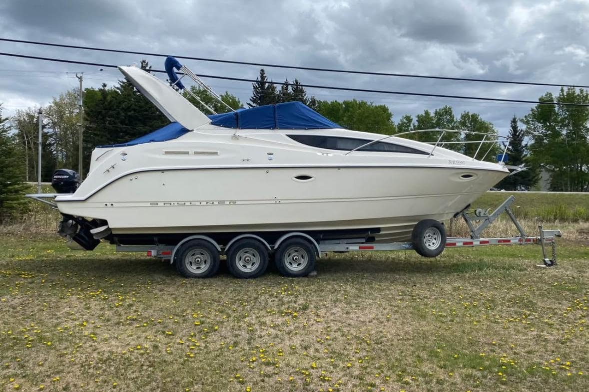 A 2004 Bayliner 285 SB Cruiser, a fresh water 'Only'  boat with a single 5.7L MPI with 430 hrs. Bravo 3 leg, 15 hp Mercury kicker with remote controls and steering. Has extended swim grid for tender to clear kicker (tender optional). Boat has 3000 watt inverter with 4 batteries, 2 starter and house batteries. Has AC reverse heat, Garmin 9” Ecomap GPS/ Sounder installed last year, VHF radio. Stereo has helm controls, electric windless with 60’ of chain and 250’ of rope. Wired for Scotty downriggers(optional) Has spotlight with remote, wash down system, full wet bath with holding tank and macerator pump, two burner alc/elec stove, fridge, microwave, sleeps 6 with bow and aft cabin berths, table drops into berth for two, full stand up canvas and storage/ travel cover. This unit comes on a 2009 Easyloader triple axle trailer. Boat, trailer and all equipment in excellent condition. Whether you are fishing or cruising this unit is serviced, cleaned, waxed and ready for your next adventure!