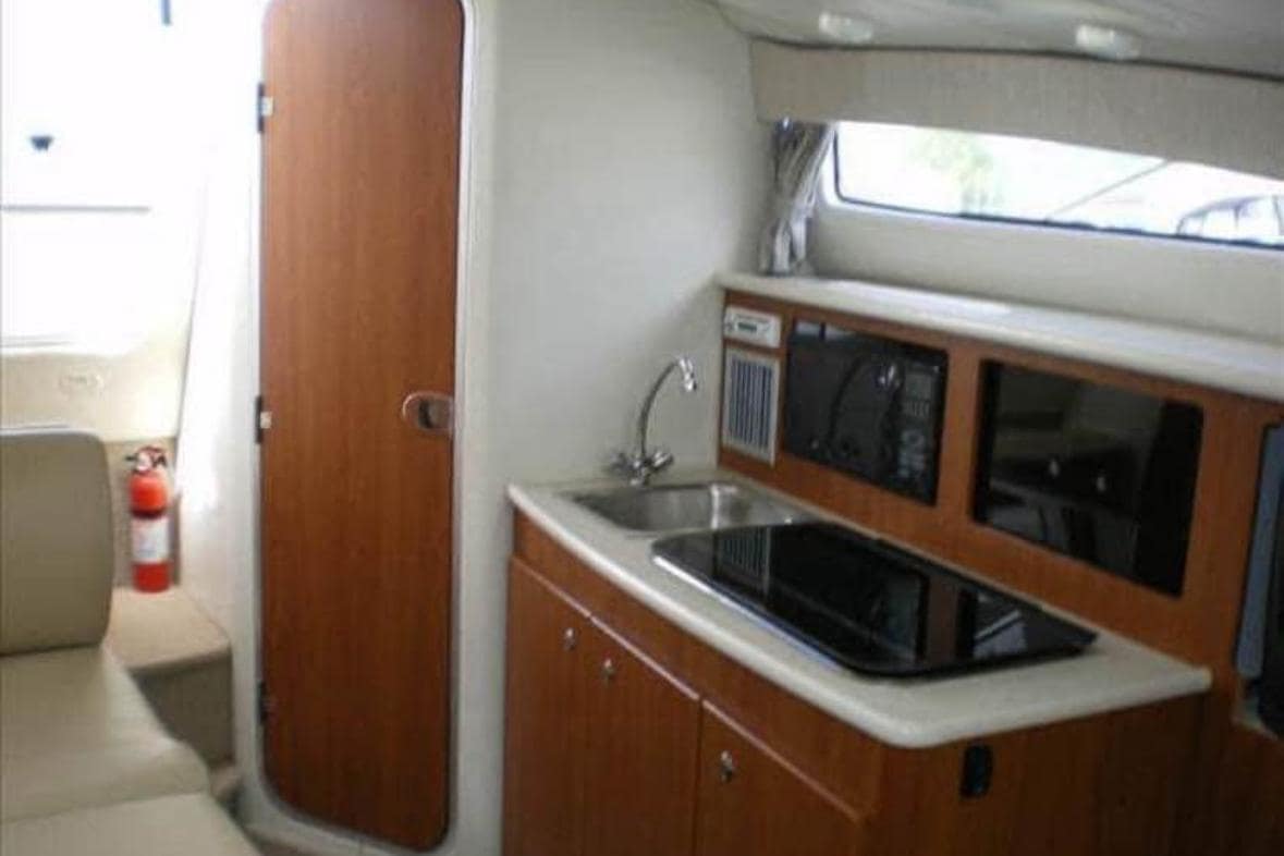 and additional lighting. A full galley, standup head, and generous