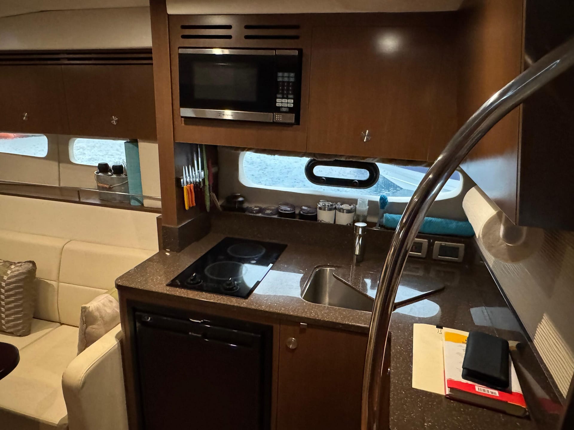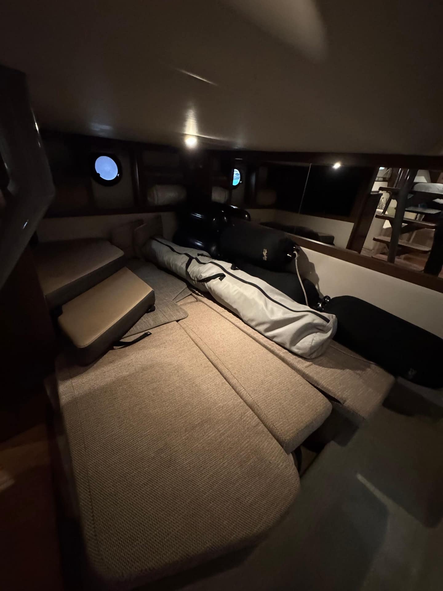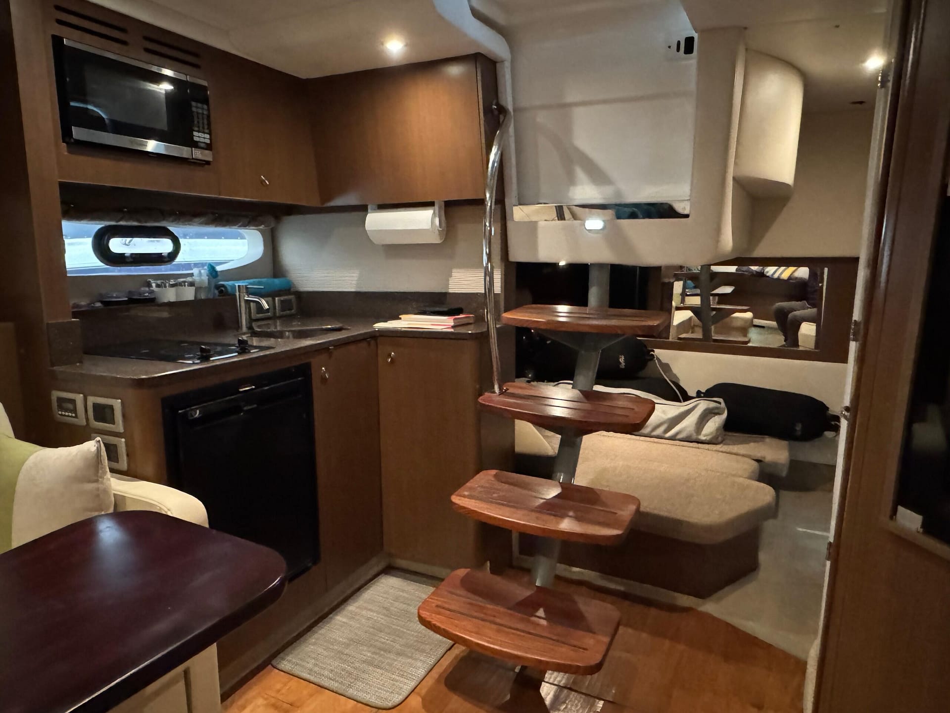 a full beam cockpit with bow access via centre windshield walkthrough, Hardtop!! retractable sunroof with aft motorized sunshade... all new weave cockpit running mats, Stunning salon features! with ample natural light, hardwood flooring, V-birth & aft cabin, Gally (microwave, cooktop & fridge/freezer) and full head with shower (bathroom)