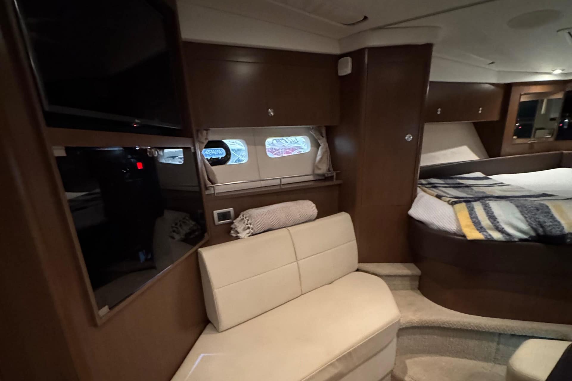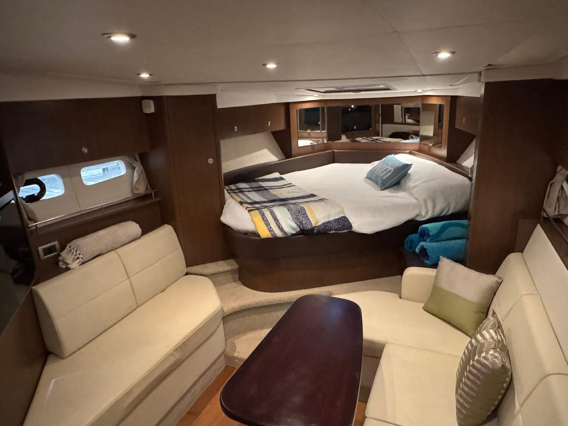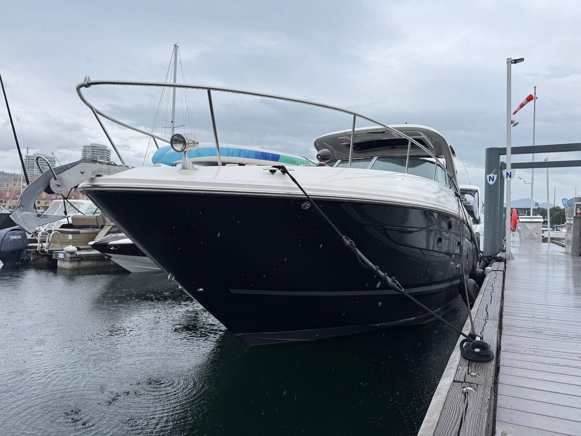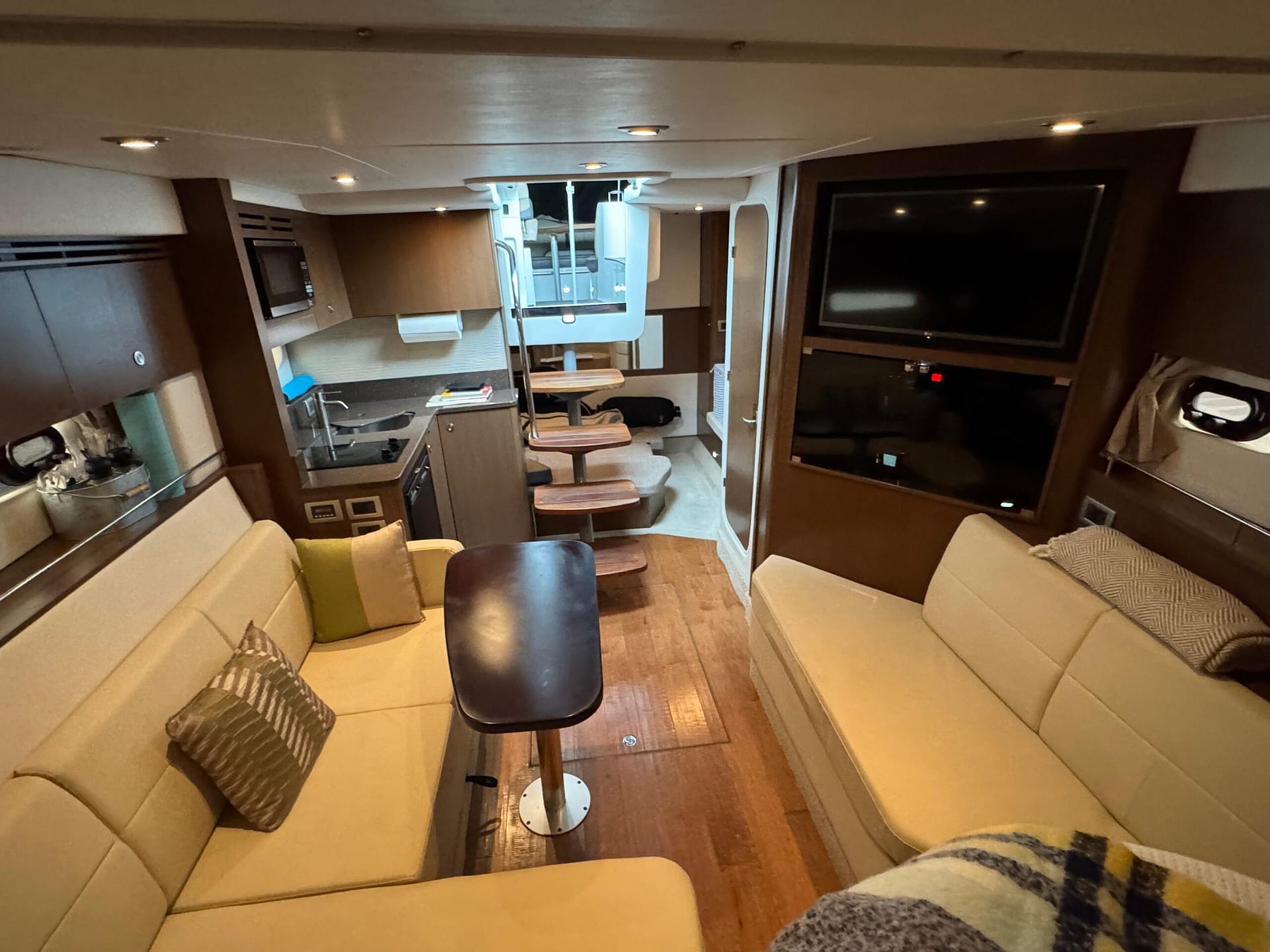 a full beam cockpit with bow access via centre windshield walkthrough, Hardtop!! retractable sunroof with aft motorized sunshade... all new weave cockpit running mats, Stunning salon features! with ample natural light, hardwood flooring, V-birth & aft cabin, Gally (microwave, cooktop & fridge/freezer) and full head with shower (bathroom)