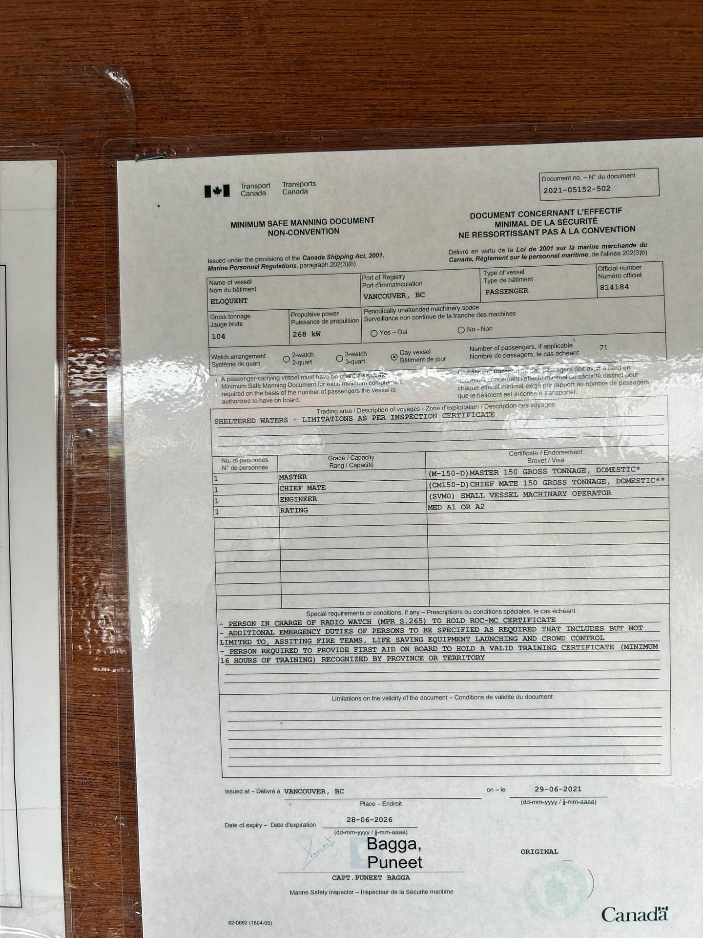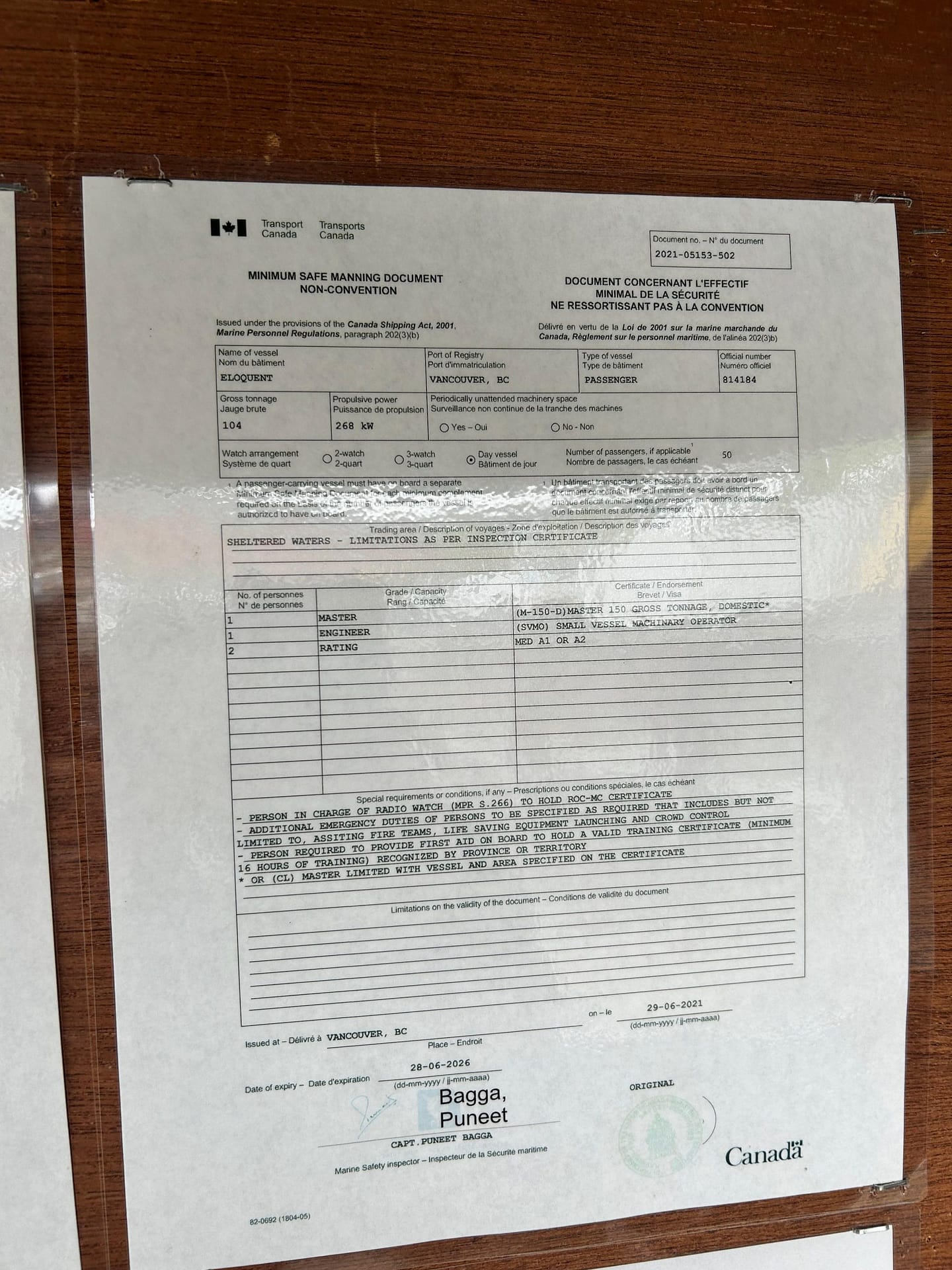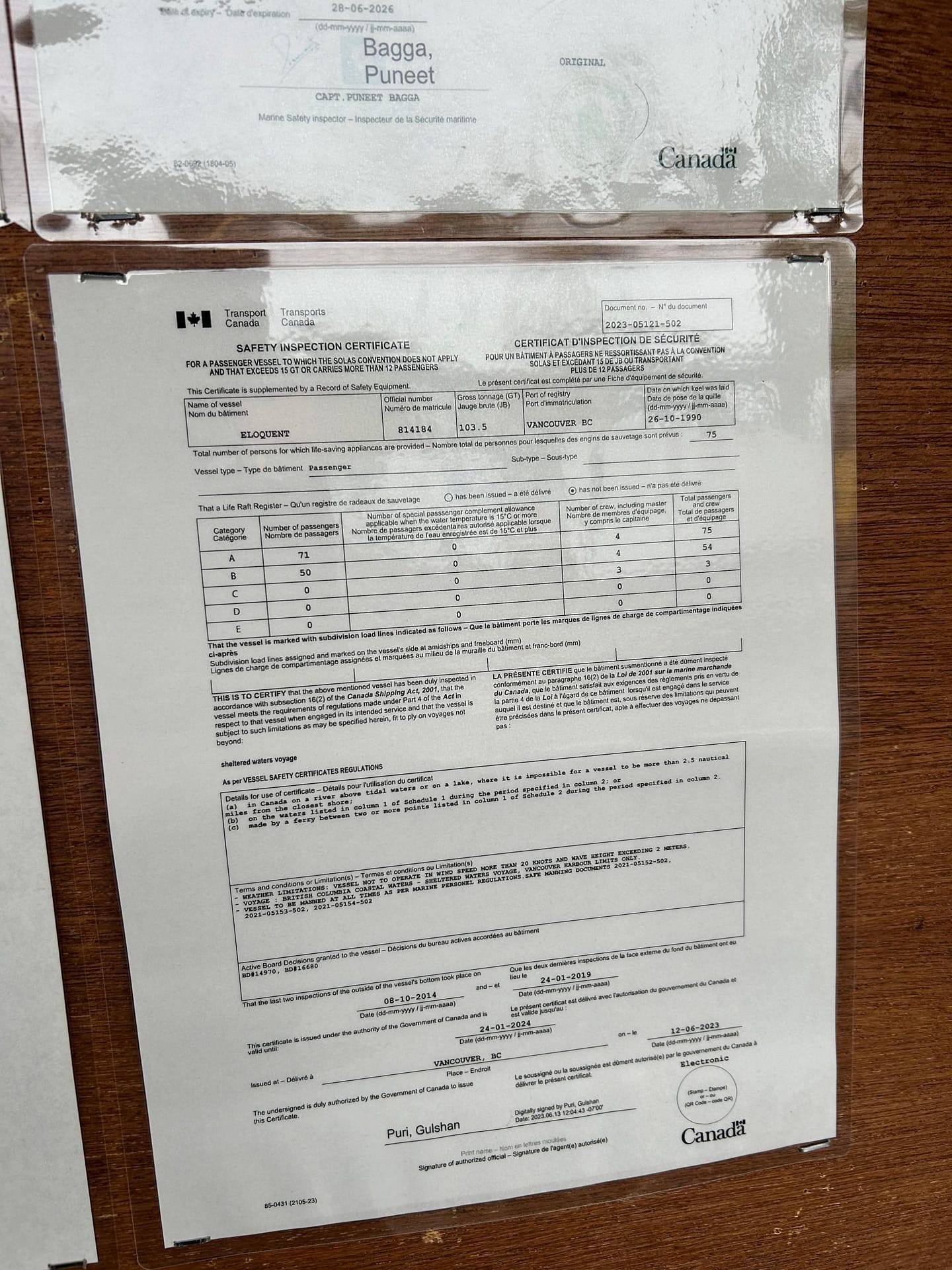 The vessel is now Transport Canada certified and fully licensed for commercial operation with: