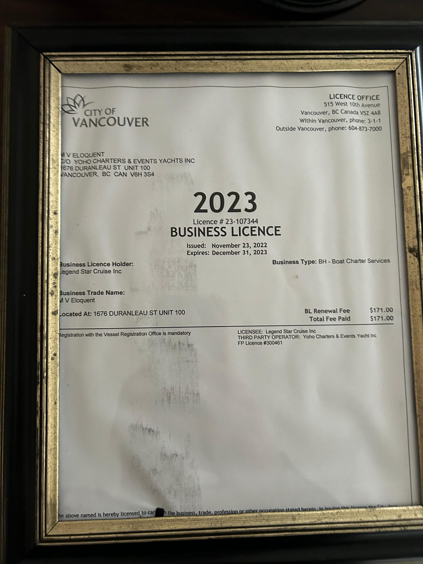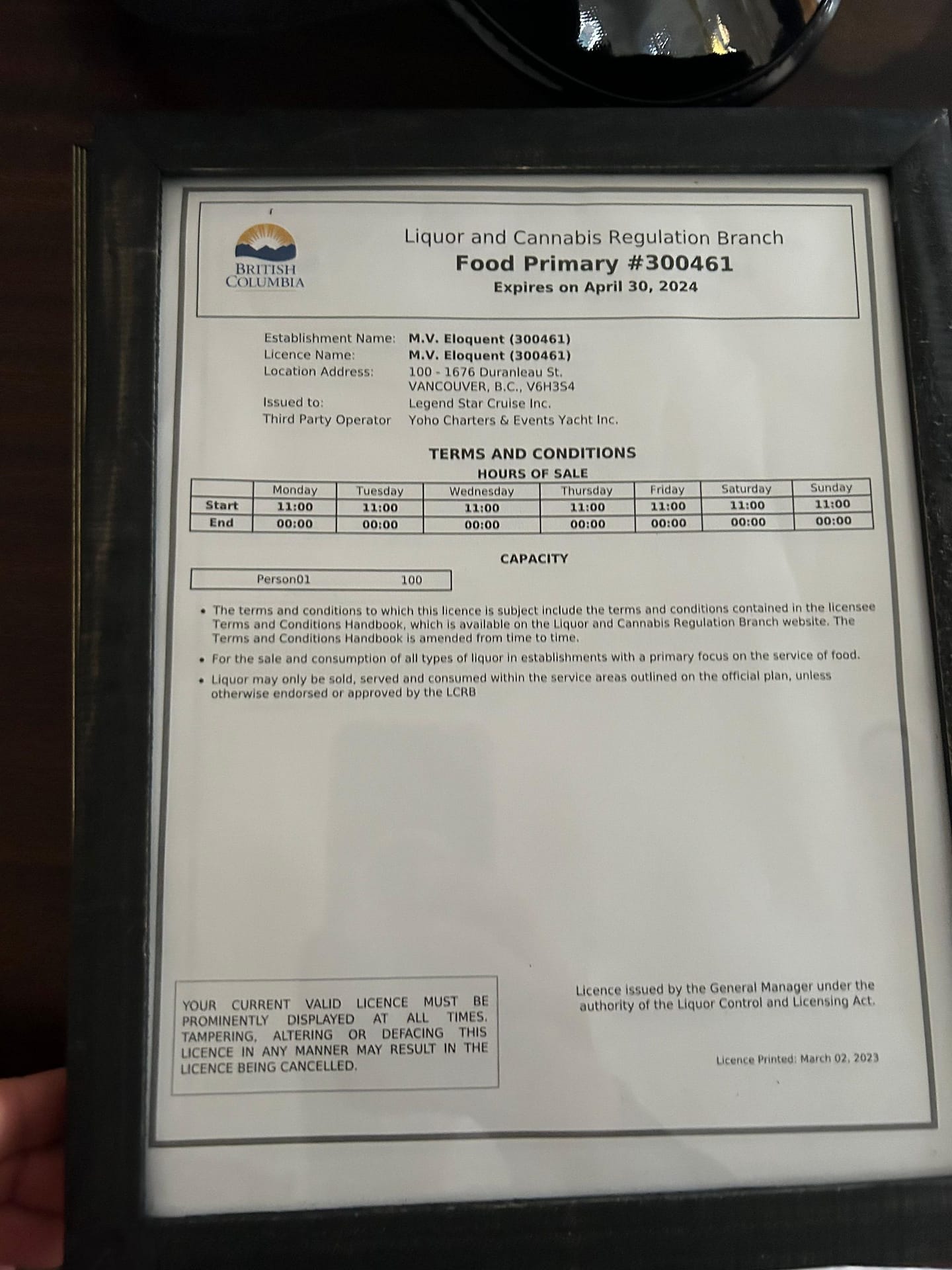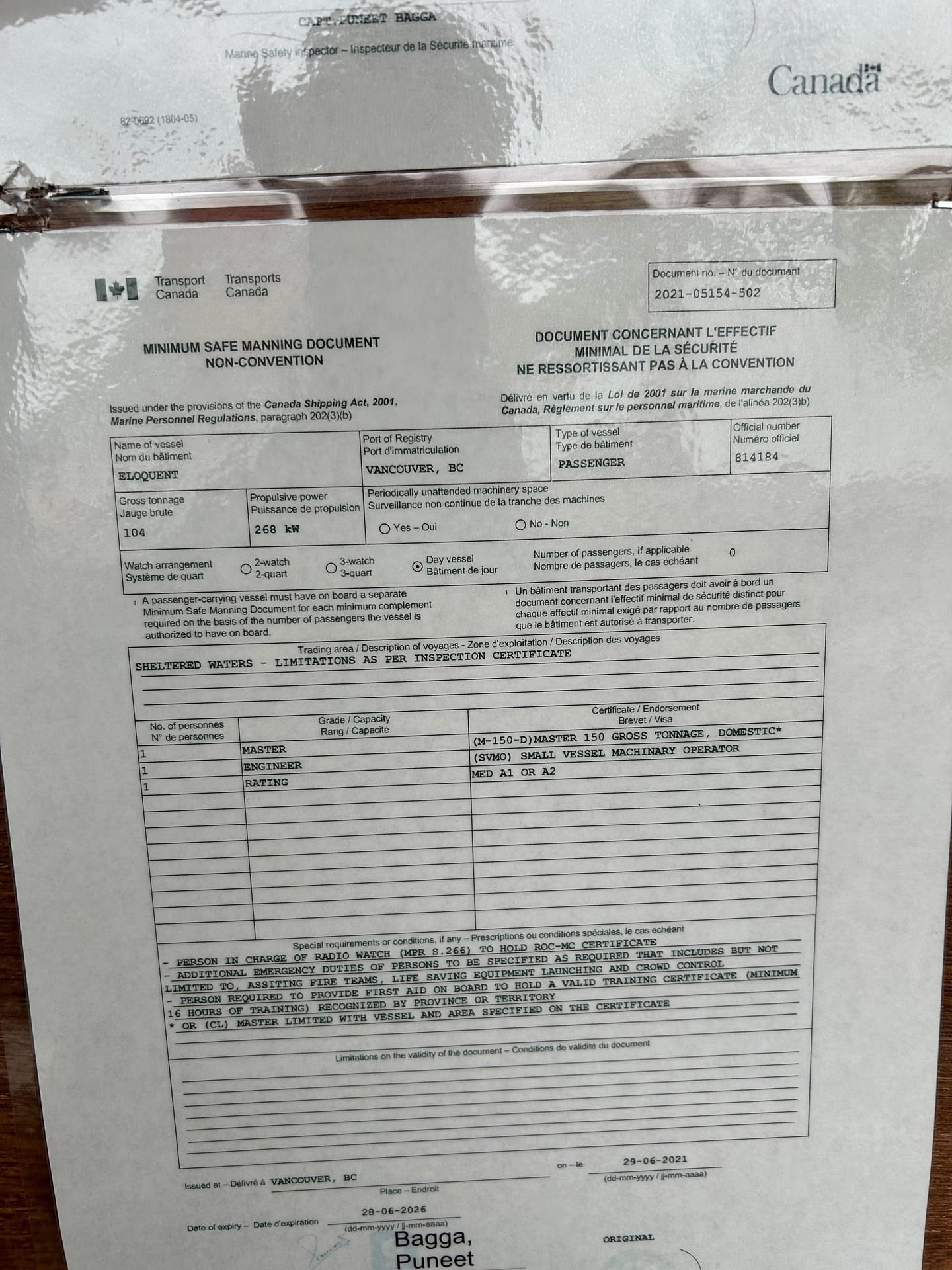 The vessel is now Transport Canada certified and fully licensed for commercial operation with: