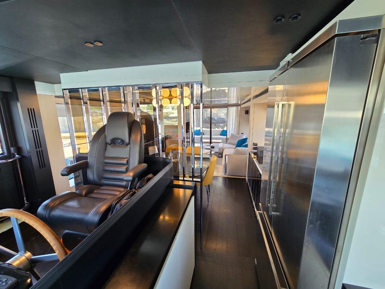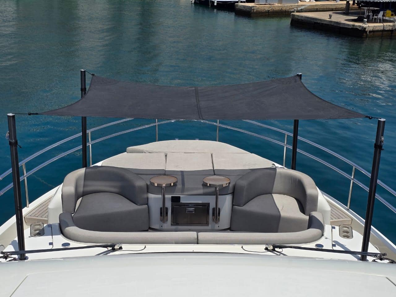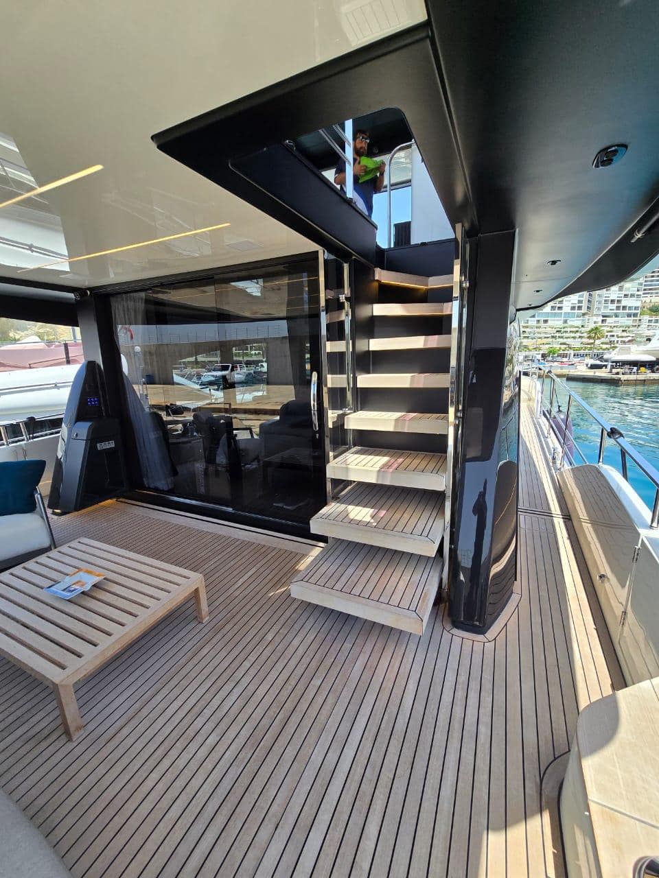 Flybridge: Expansive with sunbeds, wet bar, and dining area under hardtop with electric sunroof