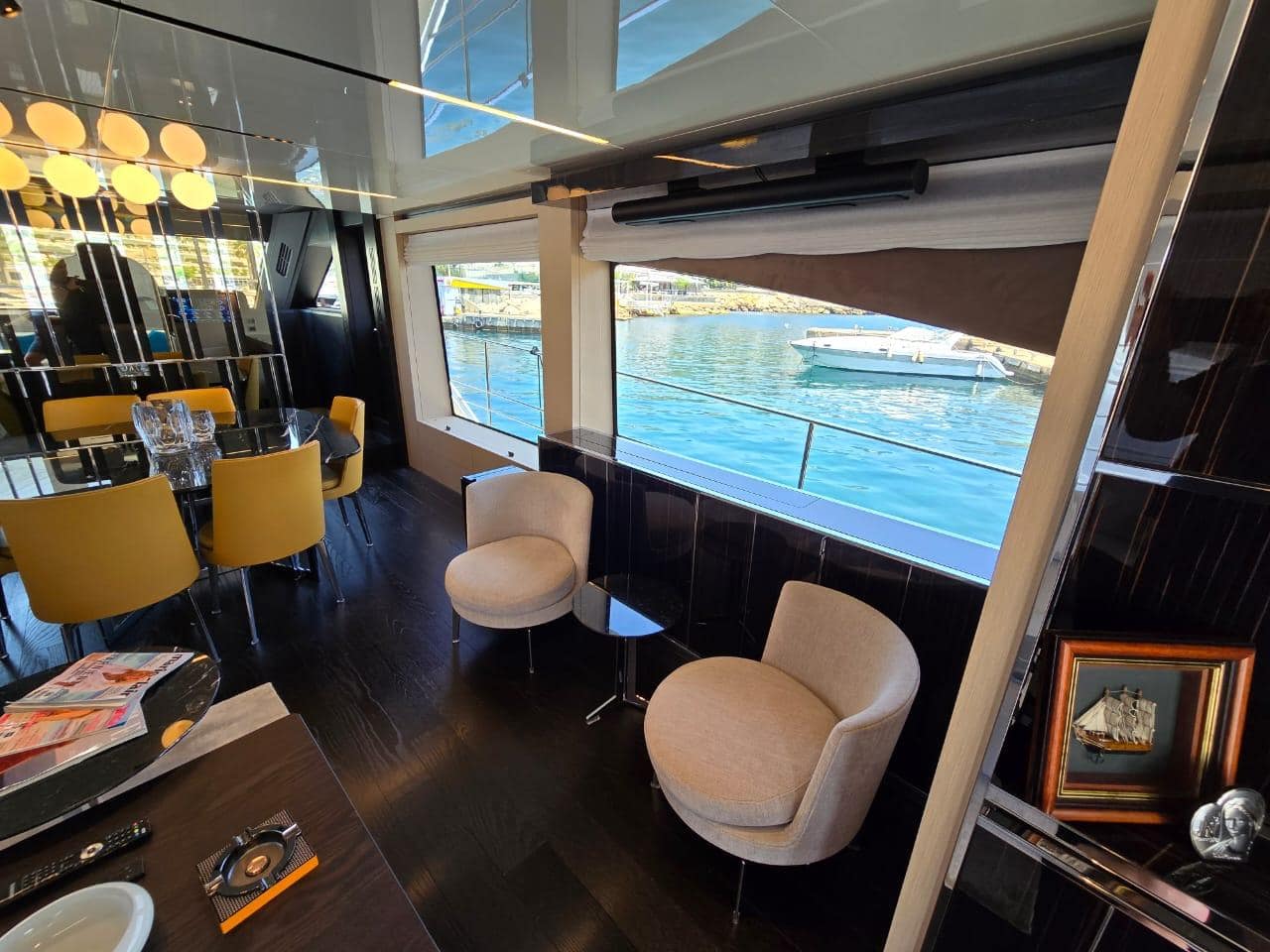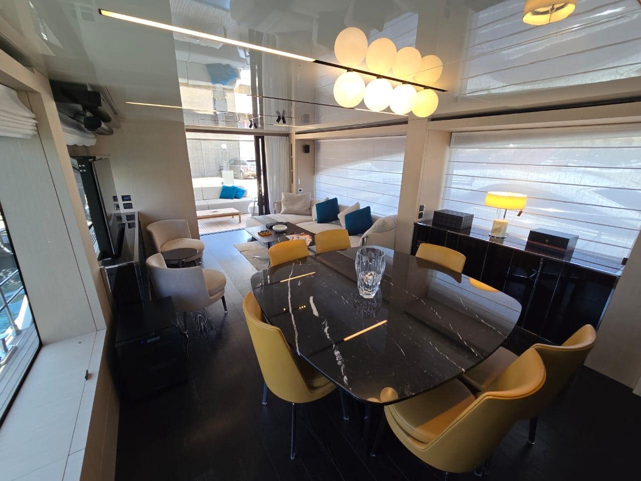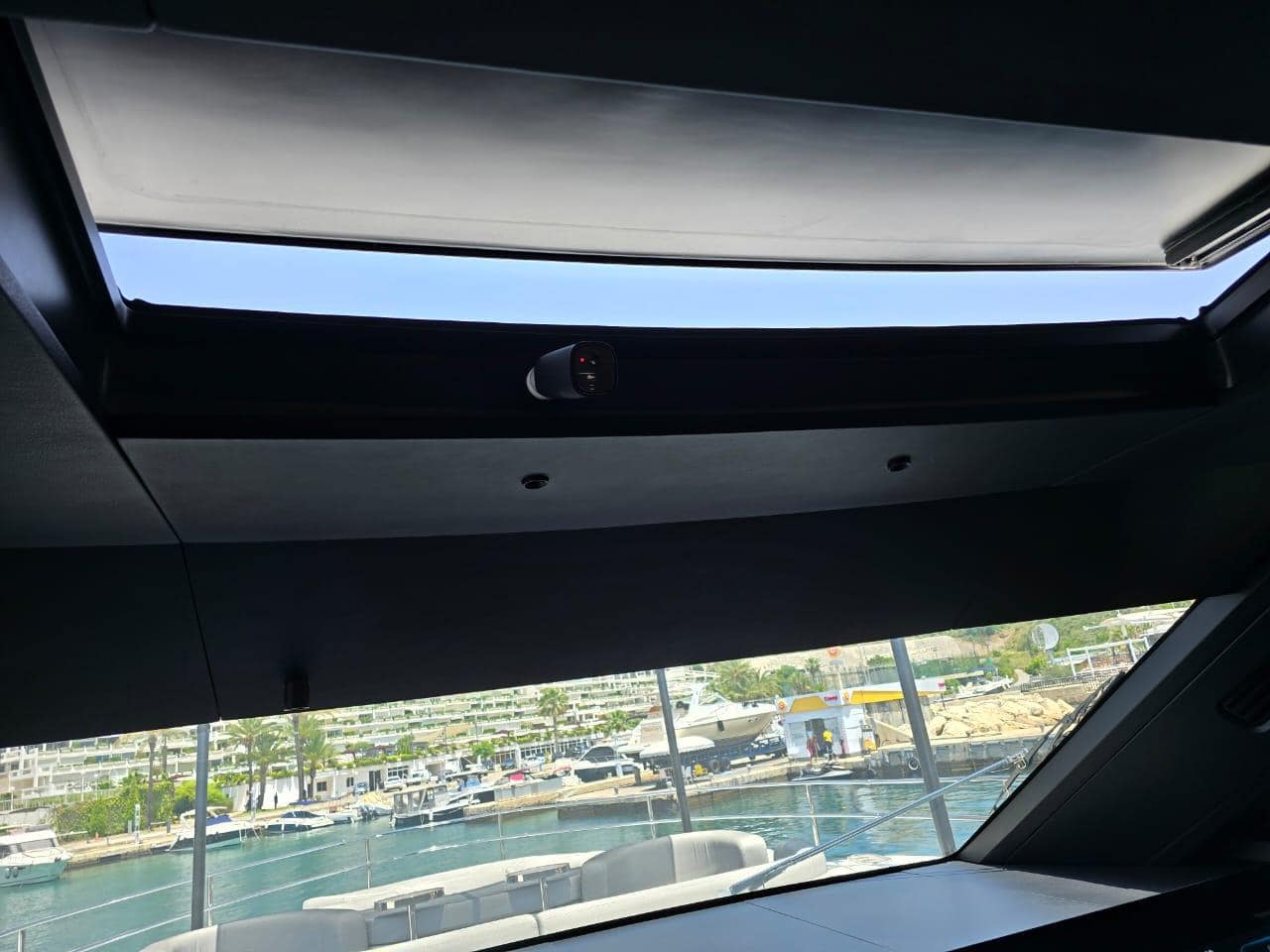 Flybridge: Expansive with sunbeds, wet bar, and dining area under hardtop with electric sunroof