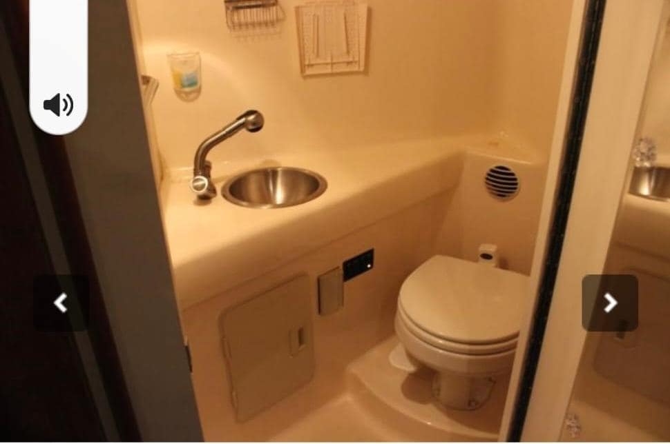 A full galley & head with shower in the cabin. Her galley is equipped with single burner electric stove, under-counter refrigerator and cabinets trimmed in bright maple.