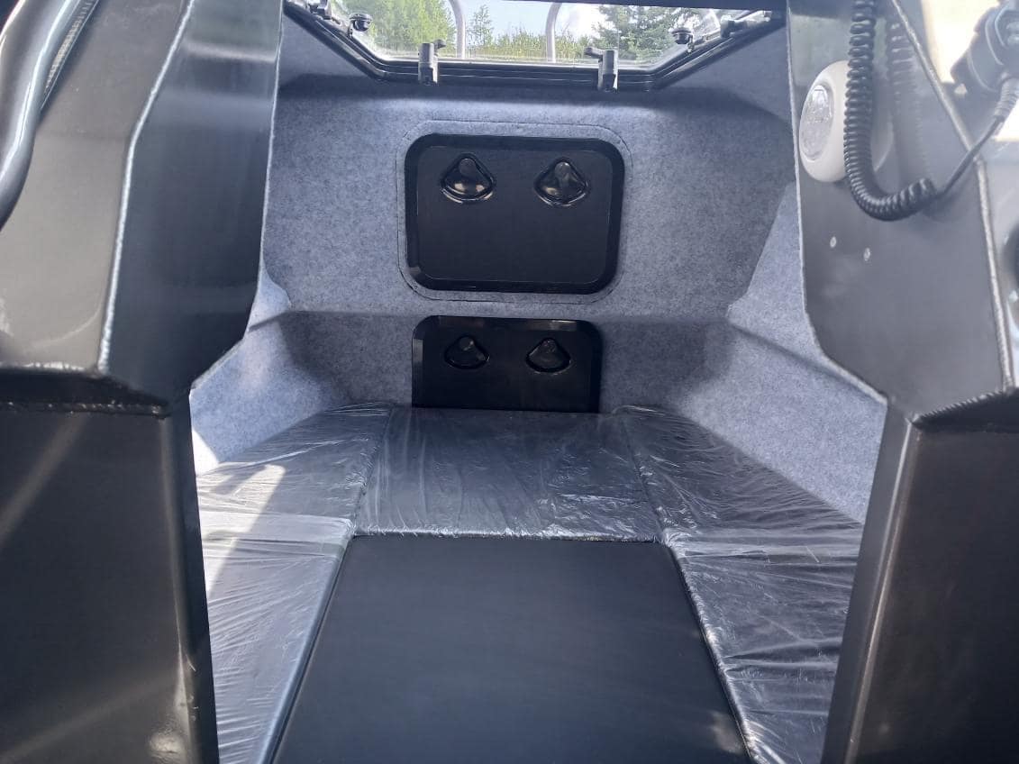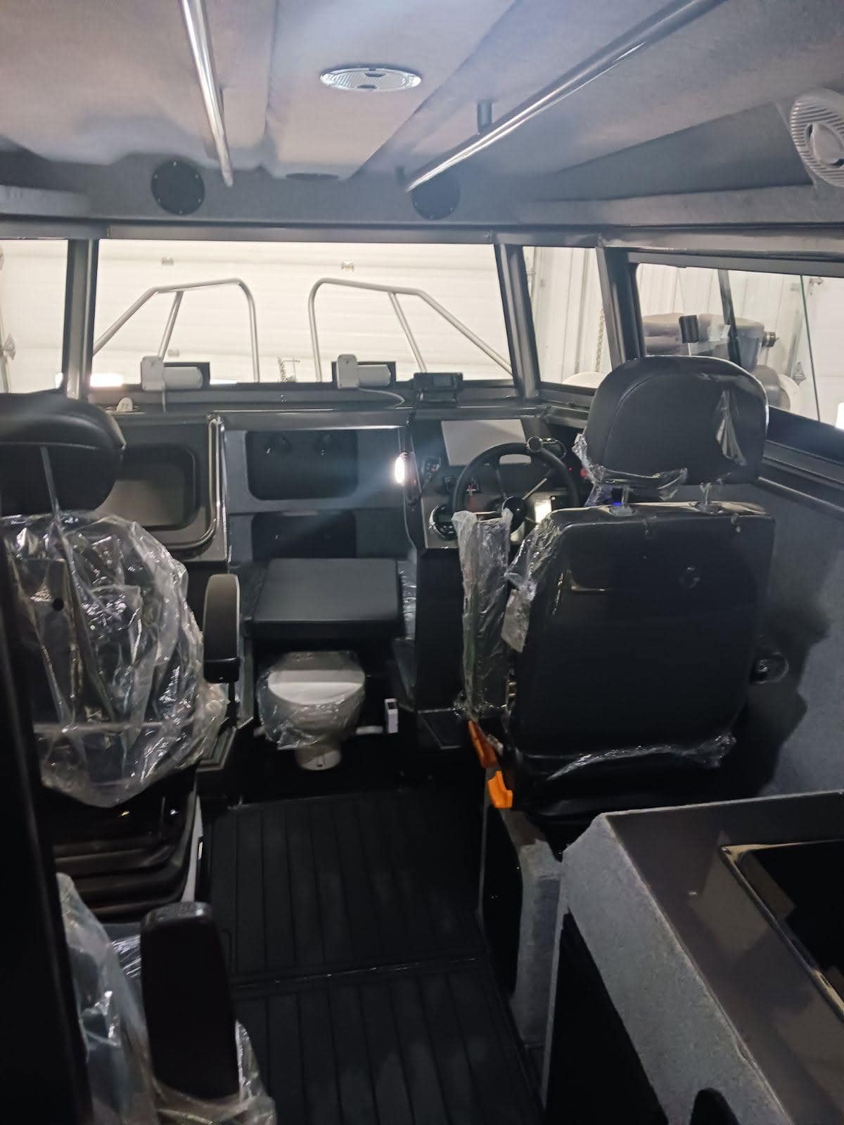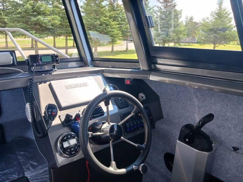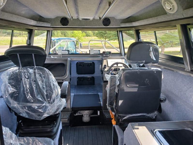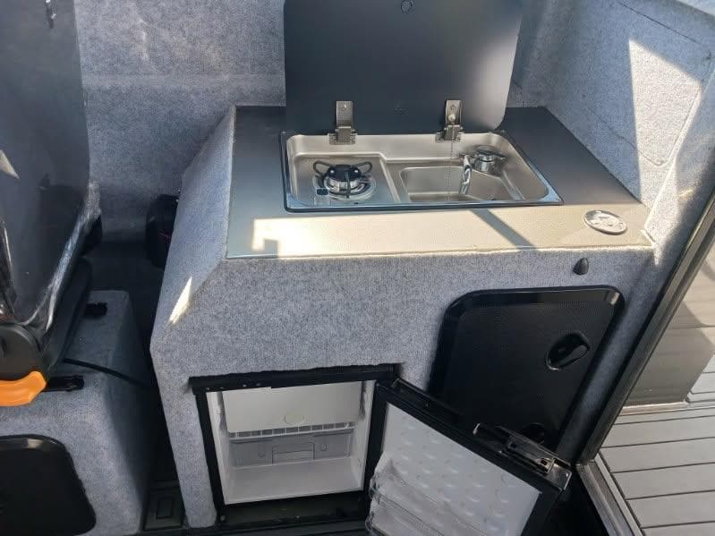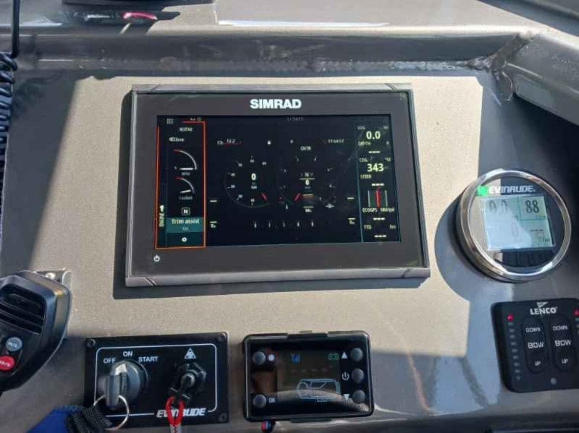 Comfort features include a diesel heater, 12V fridge, propane stove, electric toilet in the cuddy, and three suspension seats, including a captain's air seat. Stay connected with a Simrad GO9 chartplotter/sonar, VHF radio, and Bluetooth stereo. This boat also features deck lights, SeaDeck foam cockpit lining, a remote spotlight, washdown pump, freshwater sink, and a slide-out deck awning for extra convenience.