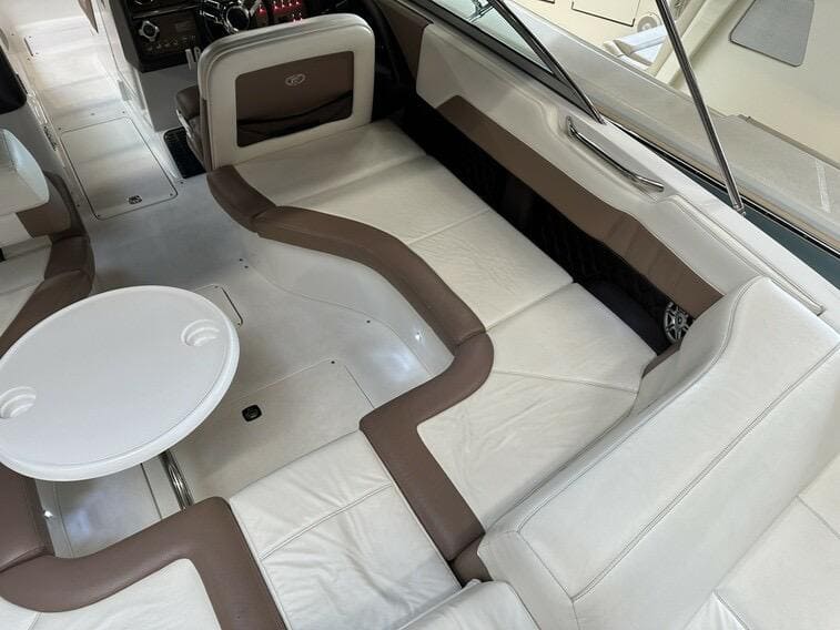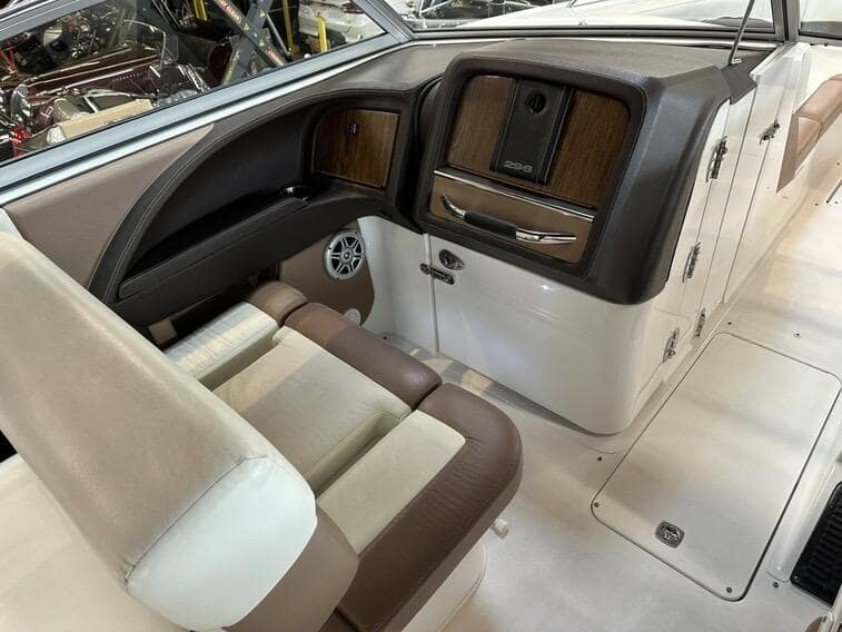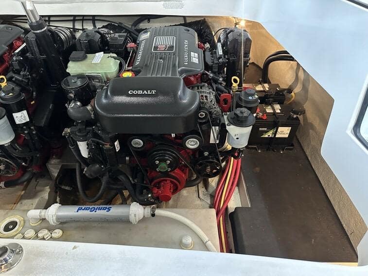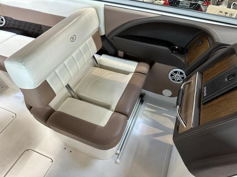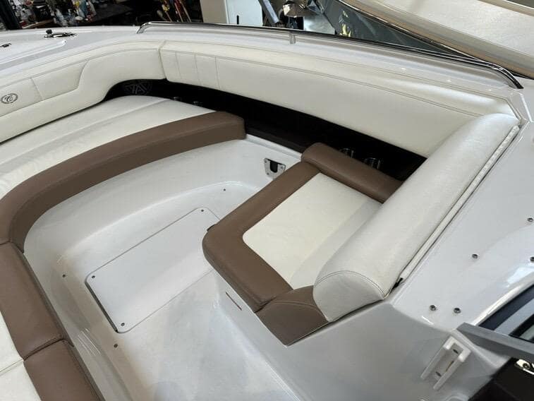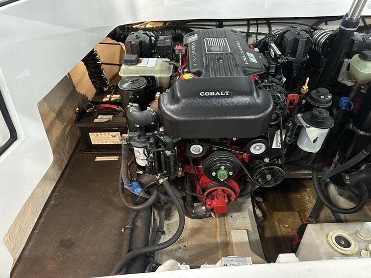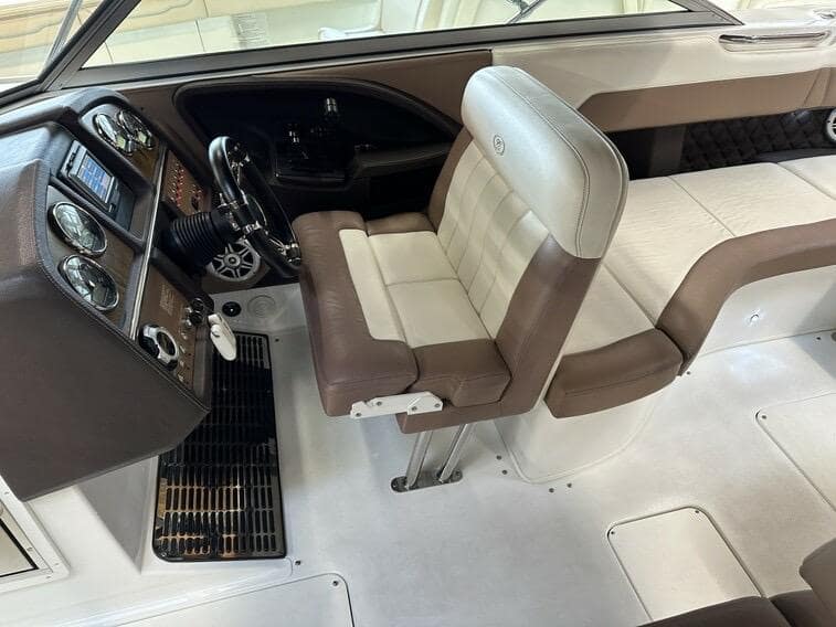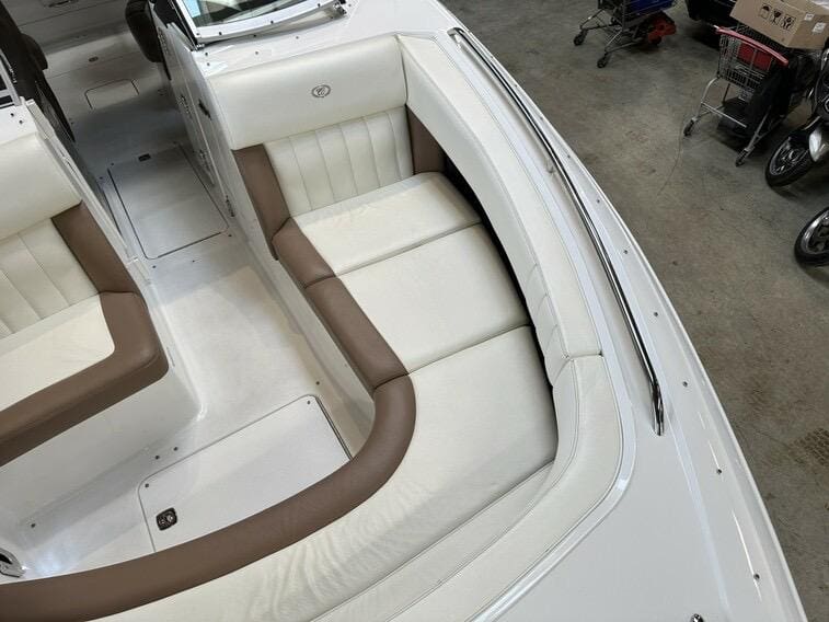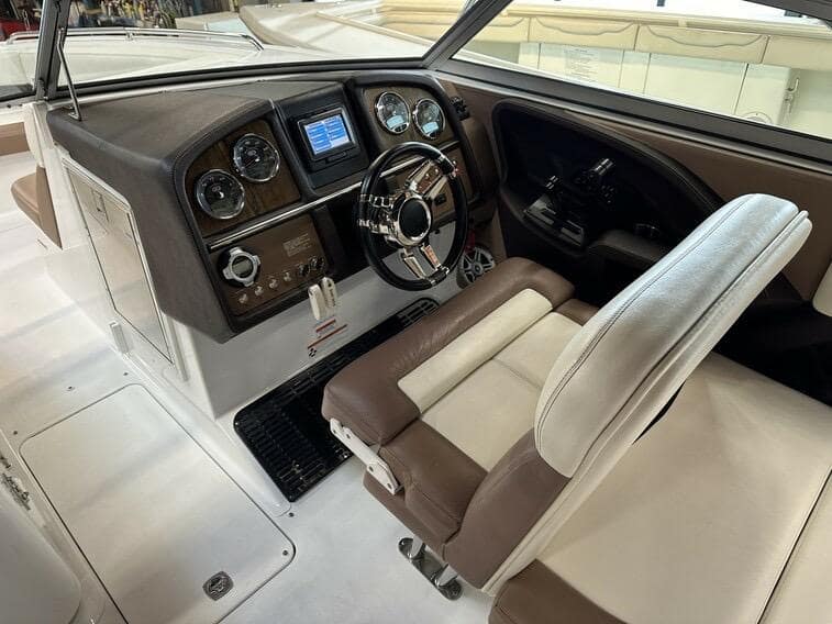 Inside, the attention to detail is apparent—from the lush, textured vinyl upholstery to the sporty woodgrain dash, complemented perfectly by a leather-wrapped steering wheel, this boat is a statement of quality that few can rival. This is cobalt’s Mark !