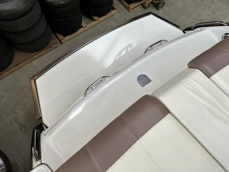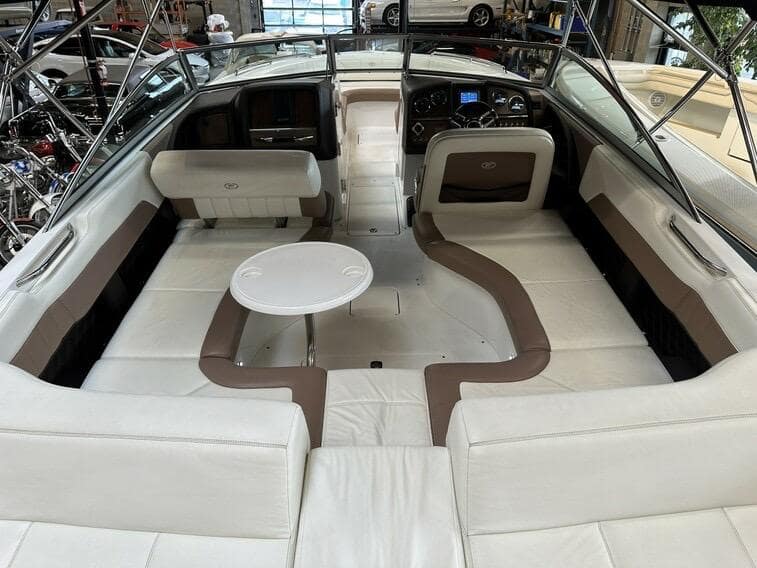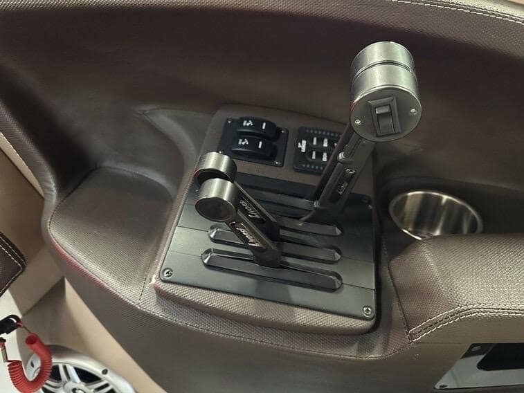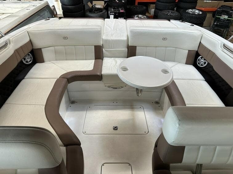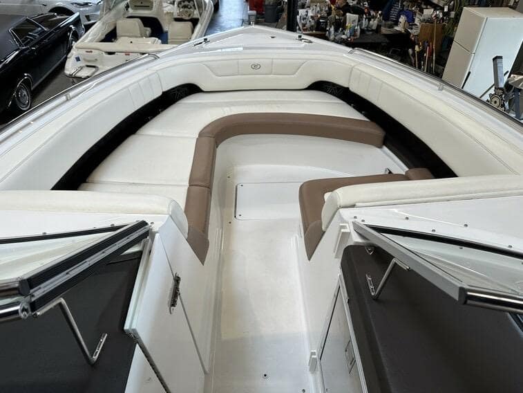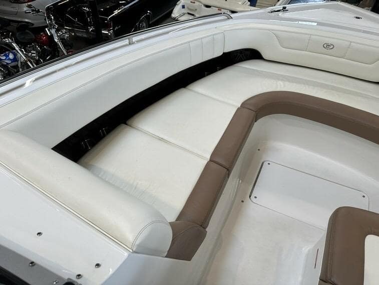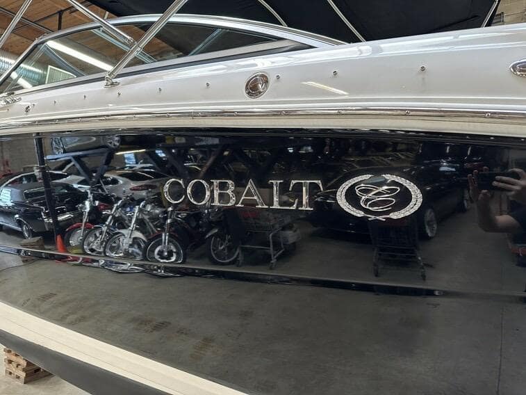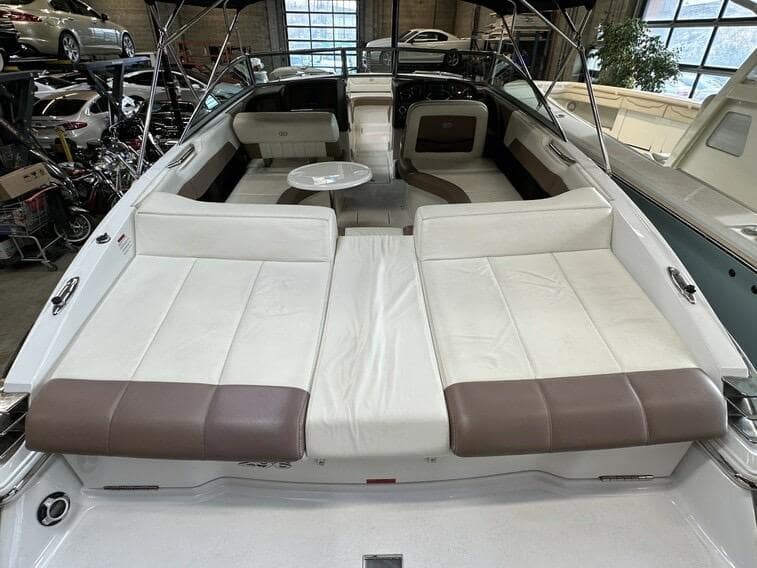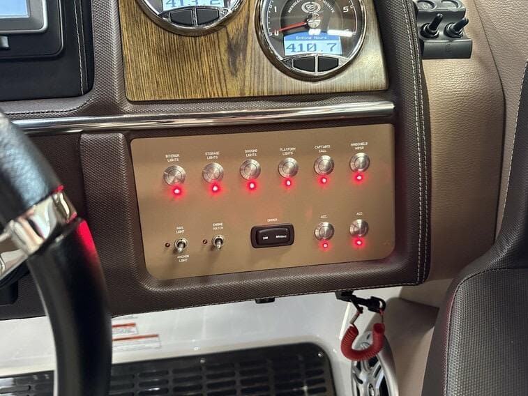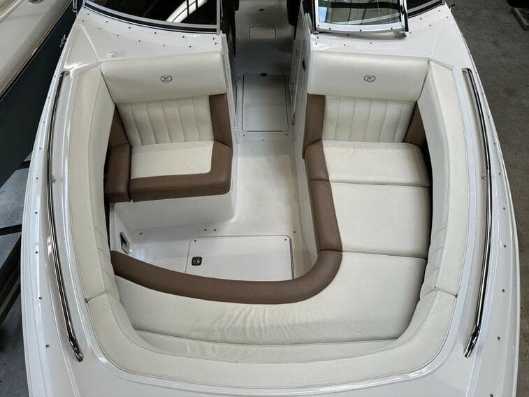 Inside, the attention to detail is apparent—from the lush, textured vinyl upholstery to the sporty woodgrain dash, complemented perfectly by a leather-wrapped steering wheel, this boat is a statement of quality that few can rival. This is cobalt’s Mark !