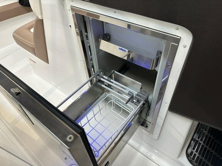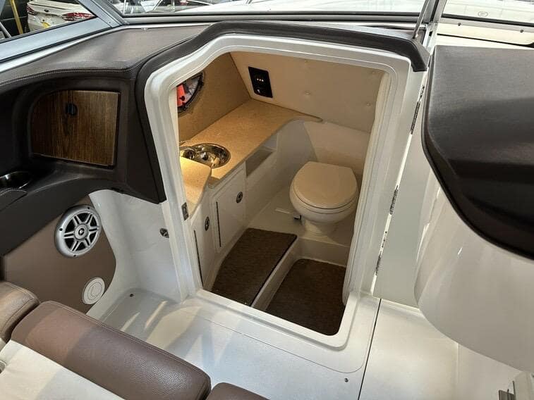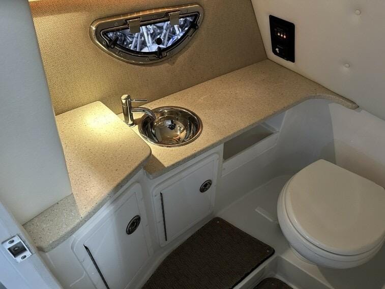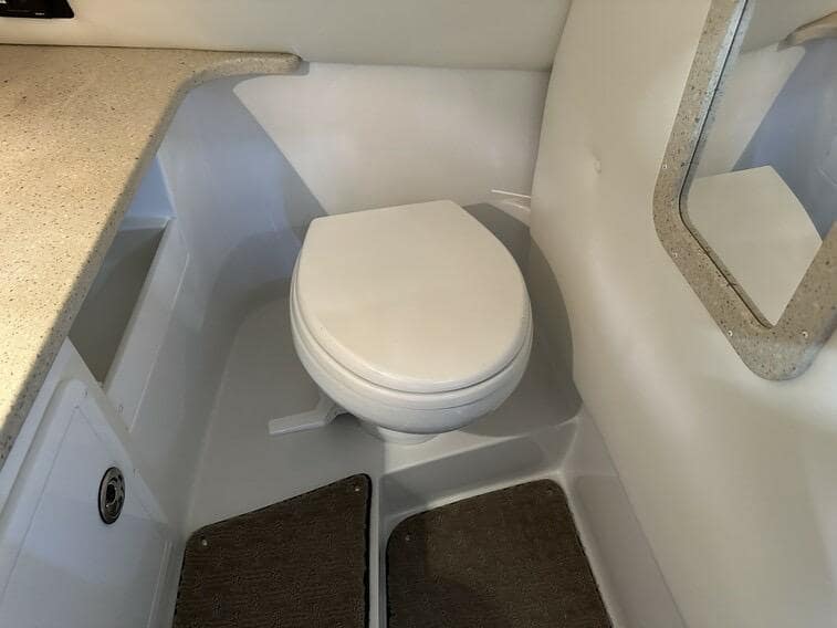 For those who love onboard entertainment, Behind the port glove box, discover an enclosed head/change room complete with a sink and porta-potty, ensuring convenience on long voyages.
