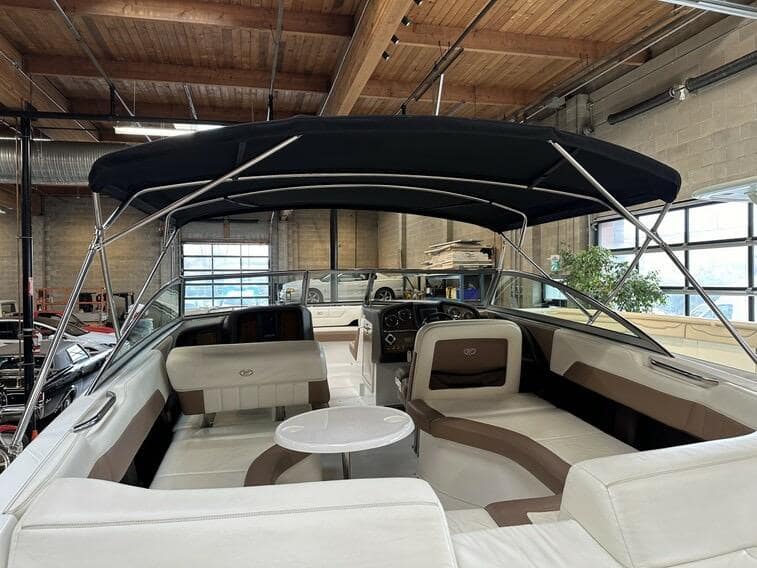 Enjoy your journey under the shelter of the bimini top with adjustable stainless stanchions, and take advantage of the power engine hatch, quad batteries, and a removable cockpit dinette table for delightful social gatherings. ( mountable on the forward bow seating area or the aft bench area )