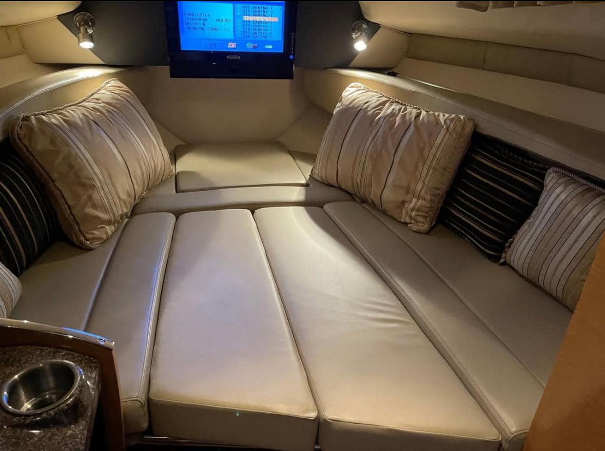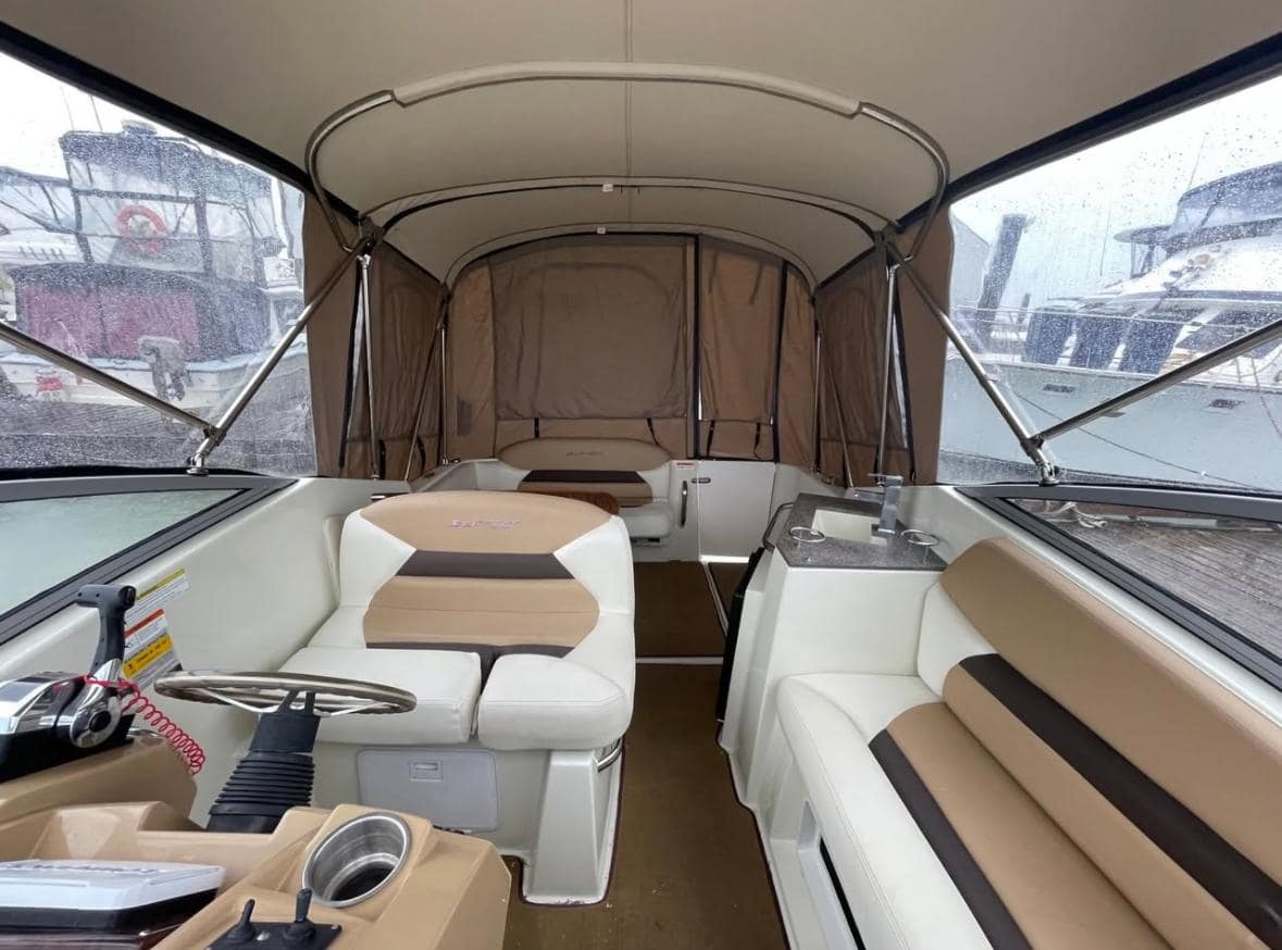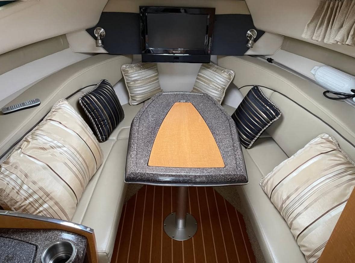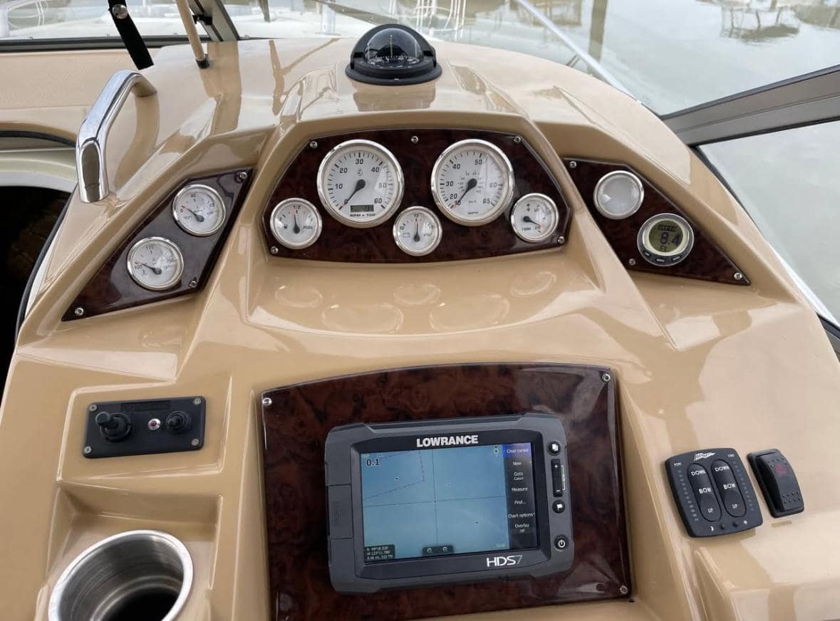 COCKPIT: Beverage Holders, Dual Helm Seat Adjustable with Flip-Up, Full Fiberglass Cockpit Liner, Helm Footrest, Motor Hatch Gas Shock, Portside Sunlounger Seating, Built-In Stern Jump Seat, Stern Storage, Custom Grip Handles SS, Storage Compartments, Tilt Steering, Wet Bar with Stone Countertop, Drink Holders, SS Cockpit Refrigerator, Snap-In Carpet, U-Shaped Interior with Table