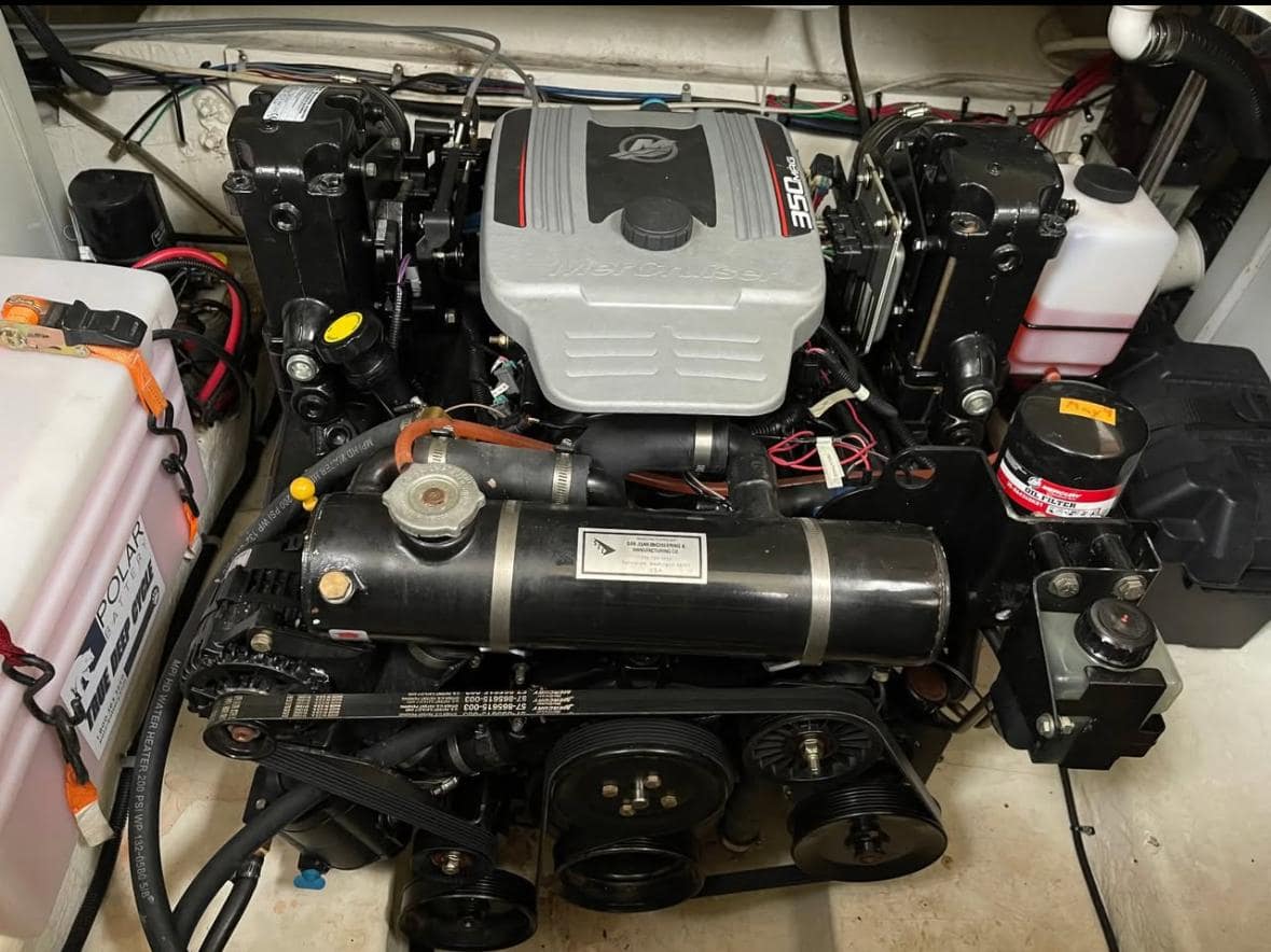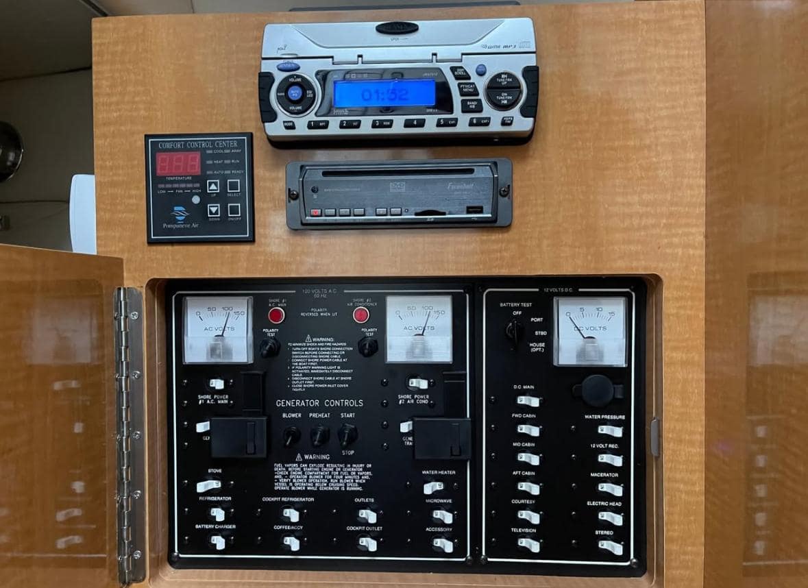 ELECTRICAL: Windshield Wiper Starboard, Pressure Water System, Electric Water Heater, Depth Finder, Stereo AM/FM with 4 Speakers & MP3/iPod Adapter, Indirect Cockpit Lighting, 12V Accessory Plug, Dual Battery Switch, 110 Dockside (shore) Power with Battery Charger, 50′ Cord & Master Control Panel, Audible Engine Alarms, Oil & Water Alarm (MerCruiser only), Electric Cabin Panel with Circuit Breakers, Galvanic Isolator, Ground Fault Protected Outlets, Hour Meter, Remote Control for Stereo a Helm, Bow Navigational Light, Removable Stern Light