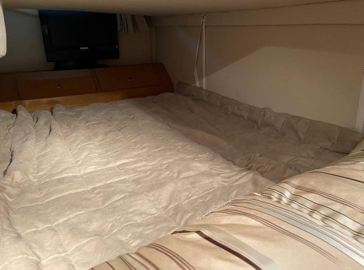 AFT CABIN: Aft Cabin Privacy Curtain, Double-Wide Berth, Reading Lights (12V) Storage Cabinet & Custom Rails, Window with Screen