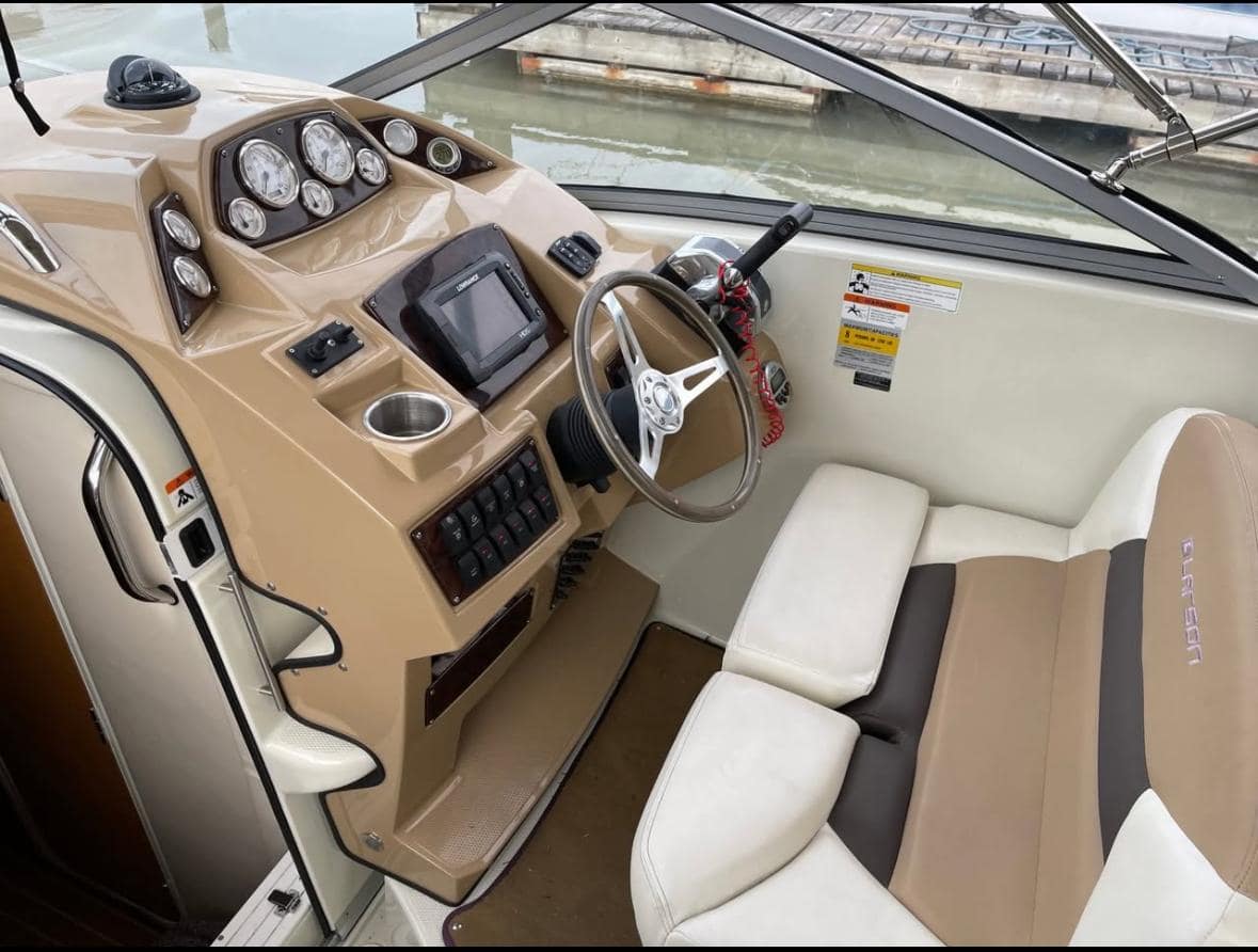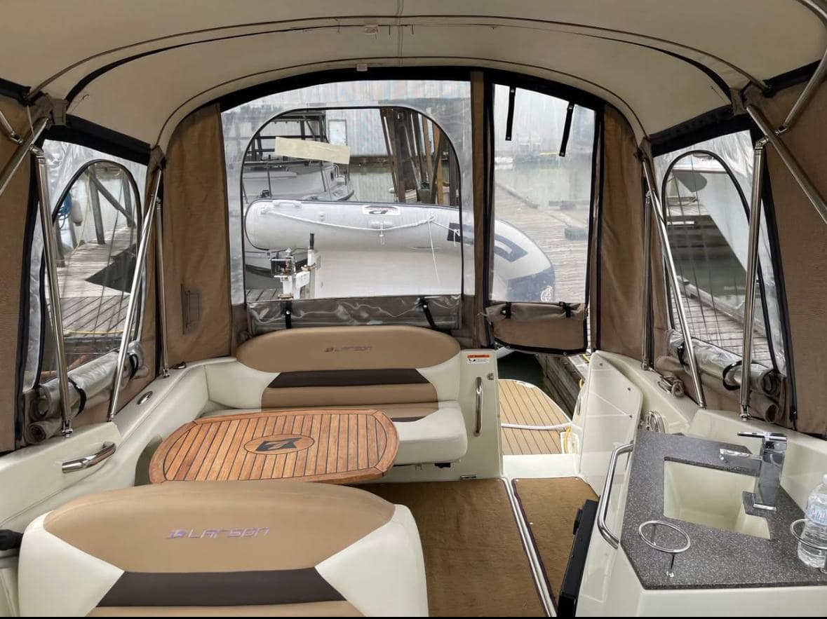 The 2014 Larson Cabrio 285 is a single engine pocket cruiser that combines style, comfort, and functionality on the water. This boat is powered by a reliable 5.7 L MPI Mercury gas engine, providing 300hp of robust power with efficiency for enjoyable cruising experiences. With only 150 hours of use, this boat is in excellent condition, promising reliability for years to come. The Cabrio 285 features a spacious cabin designed for comfort, accommodating friends and family with ease.