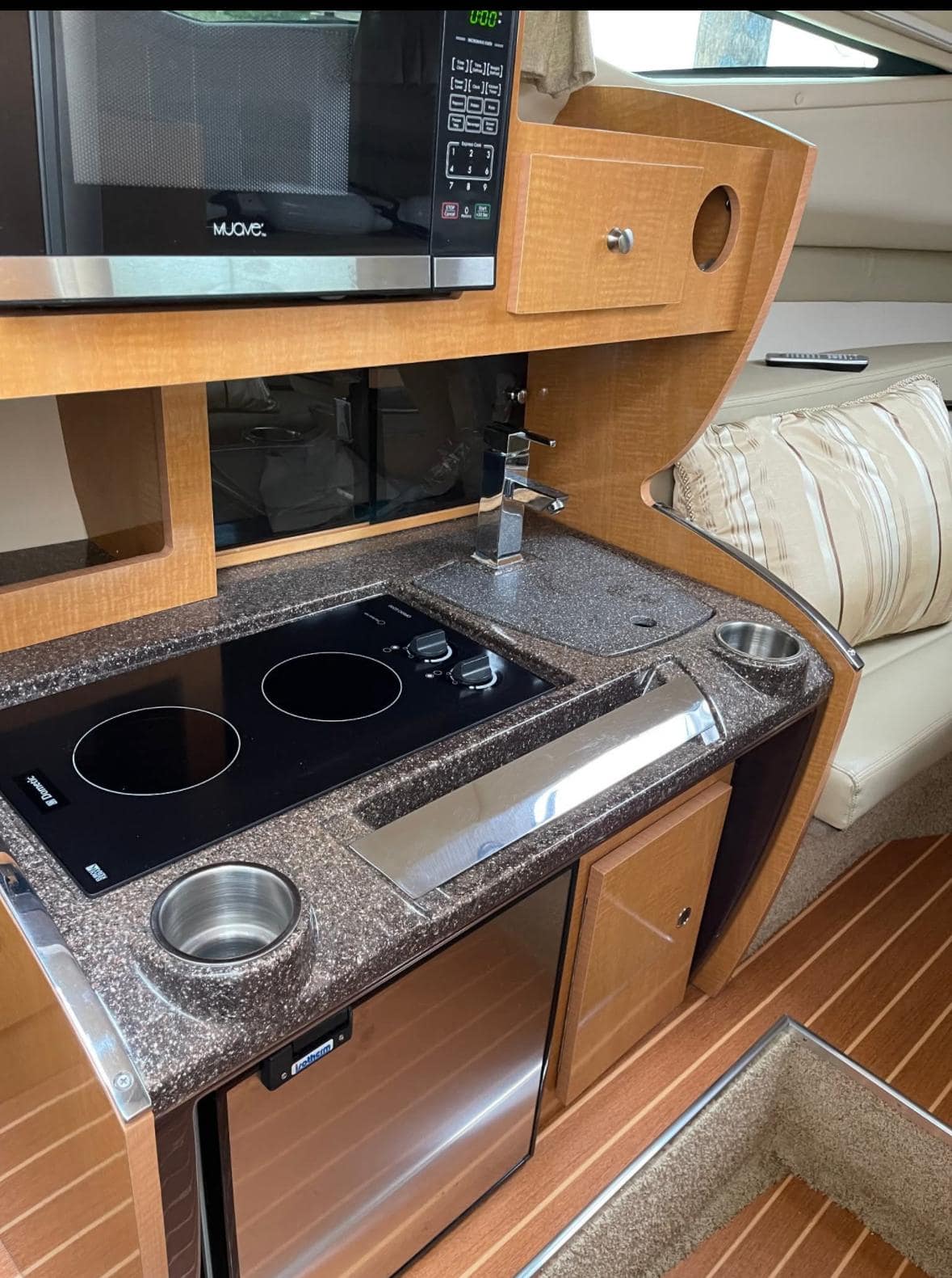GALLEY: 12V Outlet, Electric Refrigerator (12V/110), Microwave, Courtesy Lights, Custom Cabinetry & Trim, Galley Area with Gray Countertop & Storage, Galley Sink & Faucet, Bow Windows (port & starboard), Light over Galley Area, Galley/Wine Storage, Stove (electric), Cutting Board