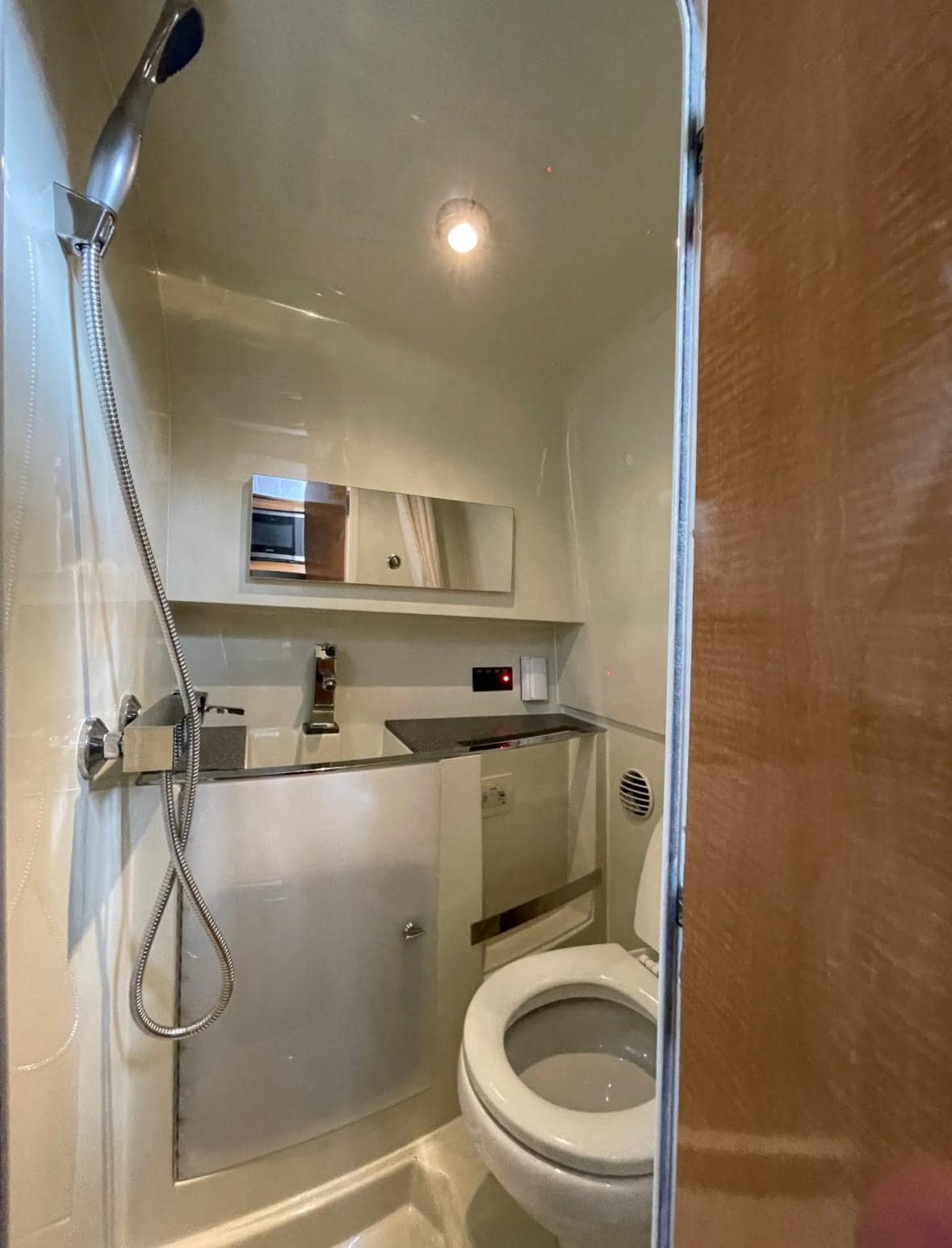 HEAD: 120 Ground Fault Protected Outlet, Enclosed Head with Shower Wand, Fiberglass Lined Head, Power Vent, Shower Curtain, Sink, Towel Rack, Electric China Head with Pump Out, Gray Vanity, Towel Rack/Grab Handle SS, Vanity Storage, Upper Mirror & Storage