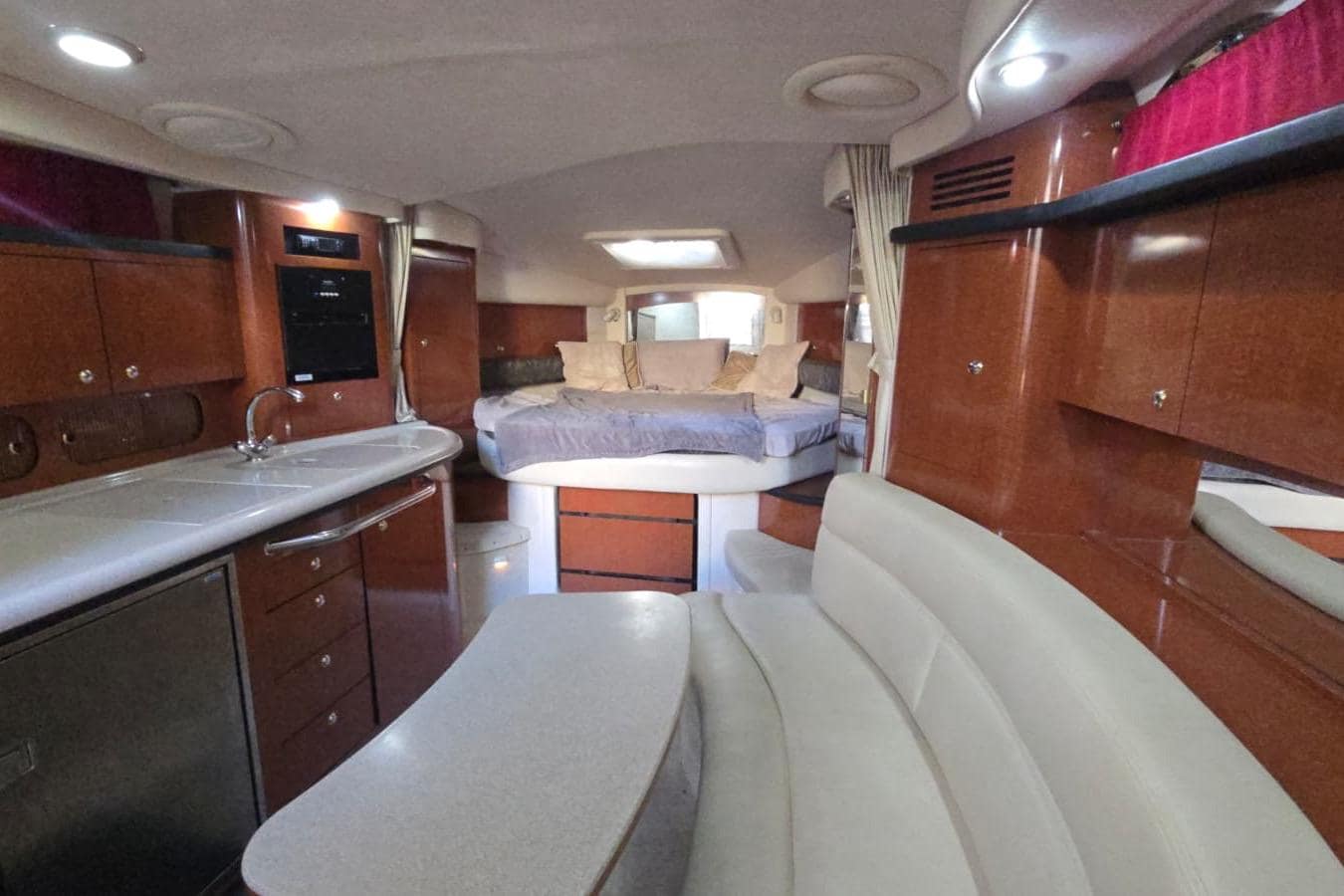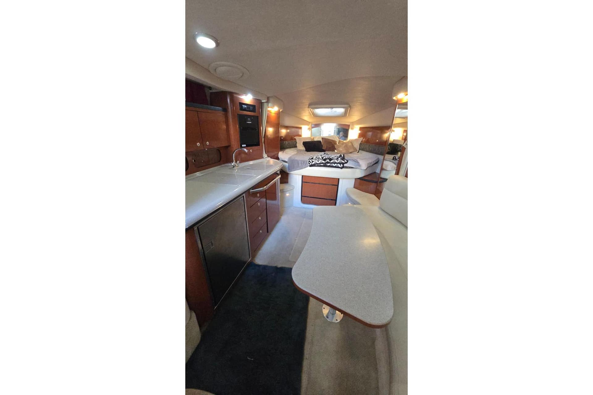 Well-balanced in design and function, this model stands out for its generous cockpit layout, ergonomic helm station, and comfortable below-deck configuration. The salon transitions smoothly from day use to overnight stays, with dedicated dining, galley, and sleeping zones that maximize the 34-foot interior footprint.