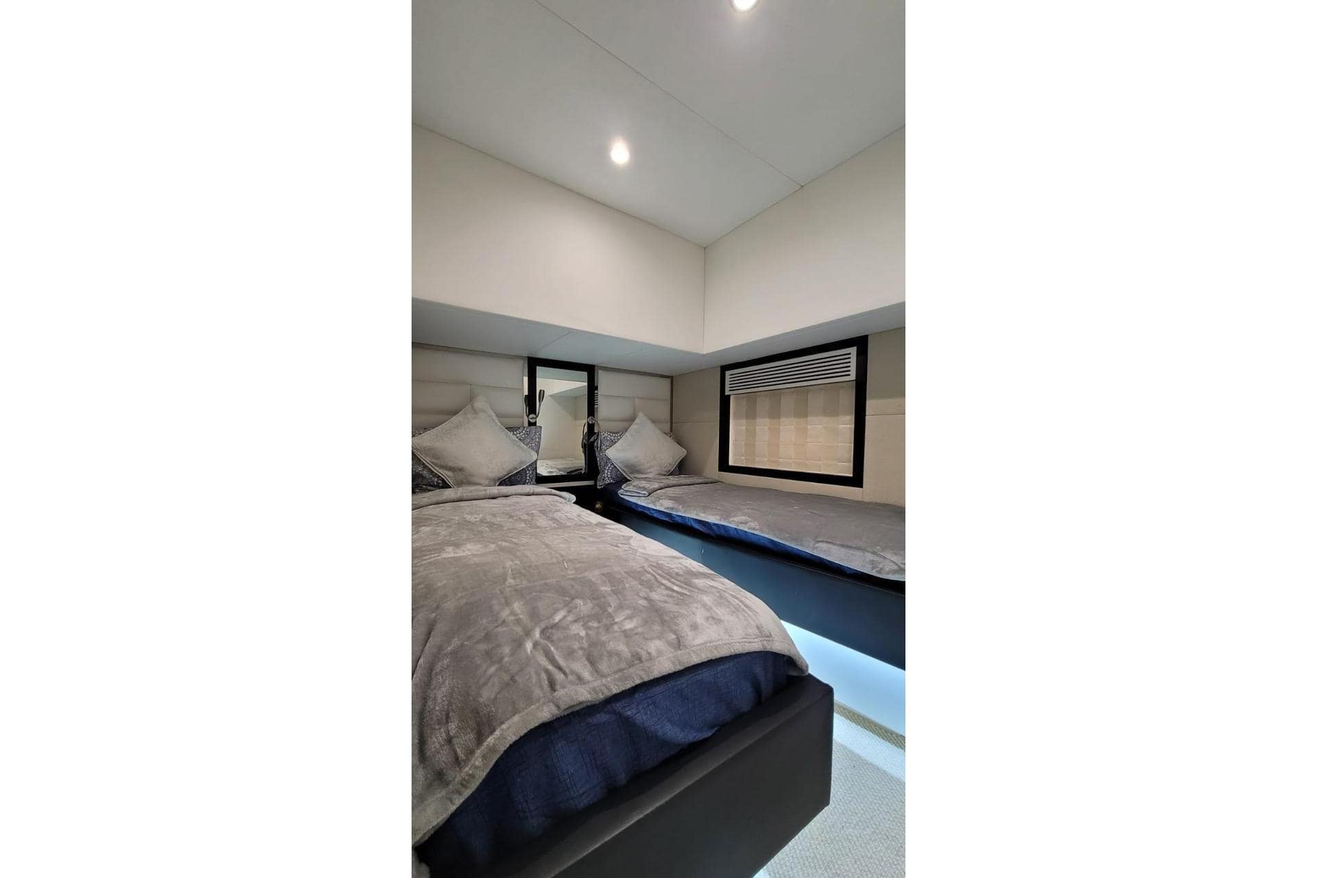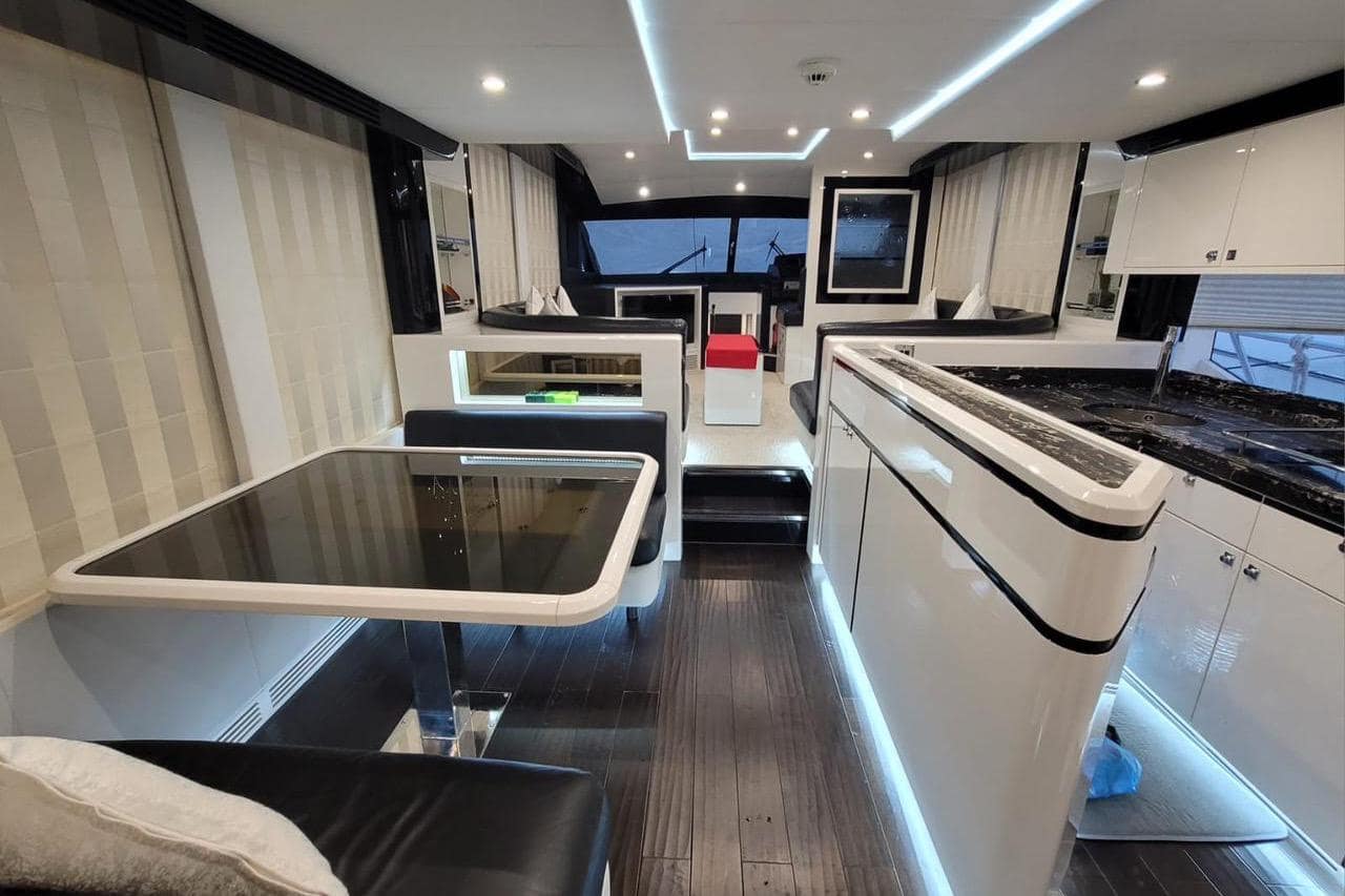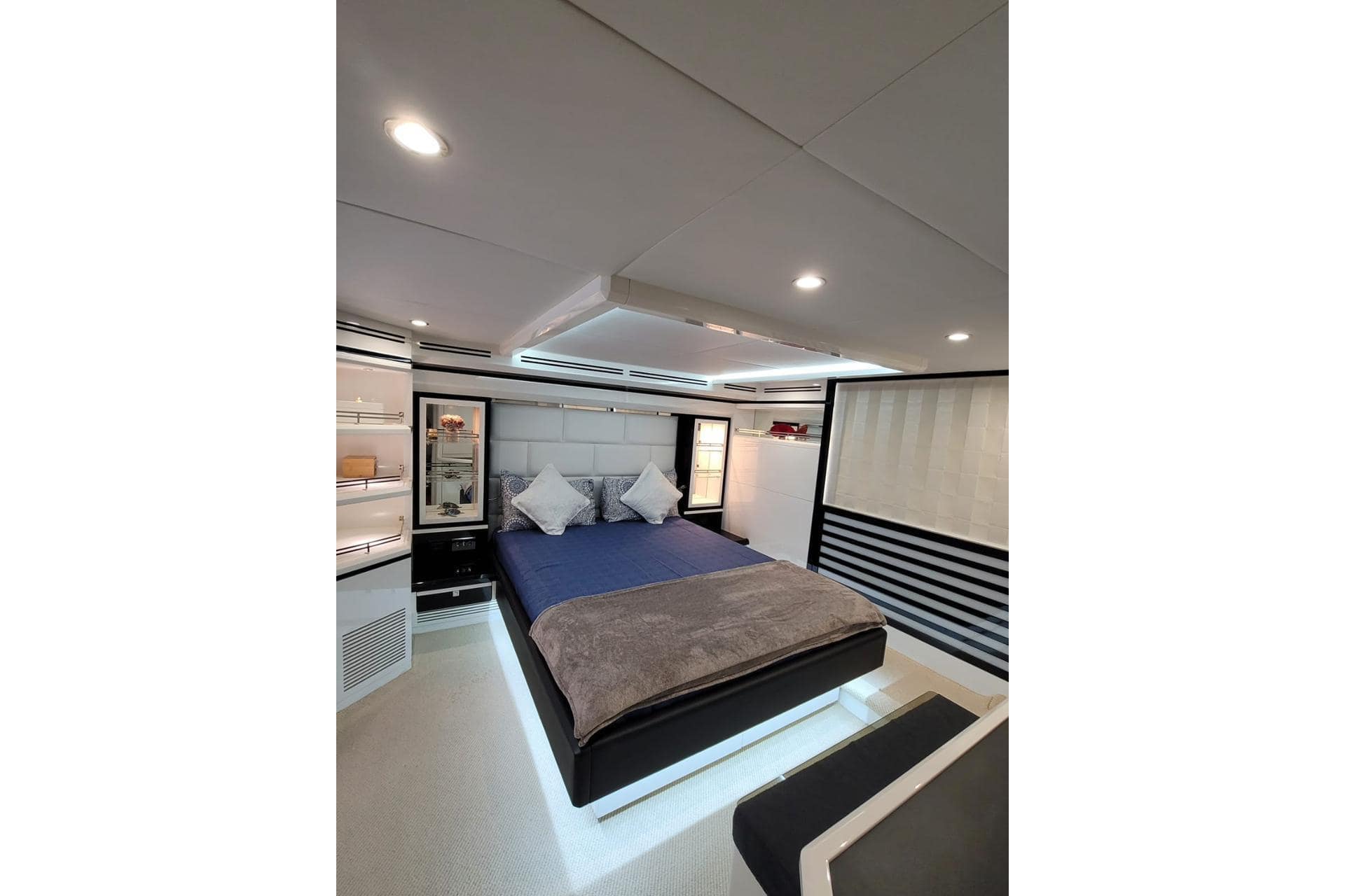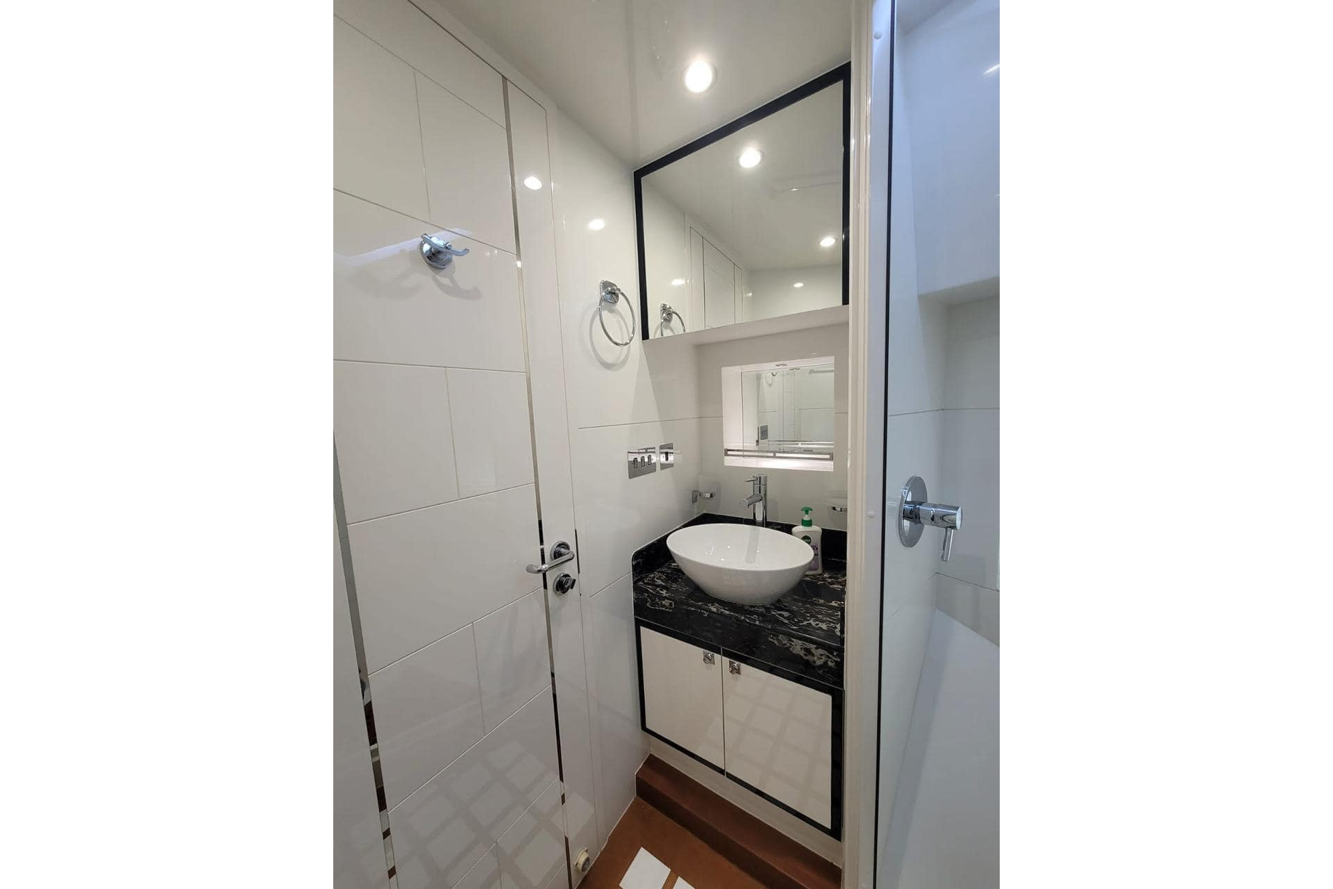 Step inside to discover a sophisticated and thoughtfully laid-out interior. Natural light fills the spacious salon and dining area, while premium finishes and modern appointments reflect Gulf Craft’s commitment to quality. Below deck, the yacht typically offers 4 well-appointed cabins accommodating family and guests comfortably, along with dedicated crew quarters aft.