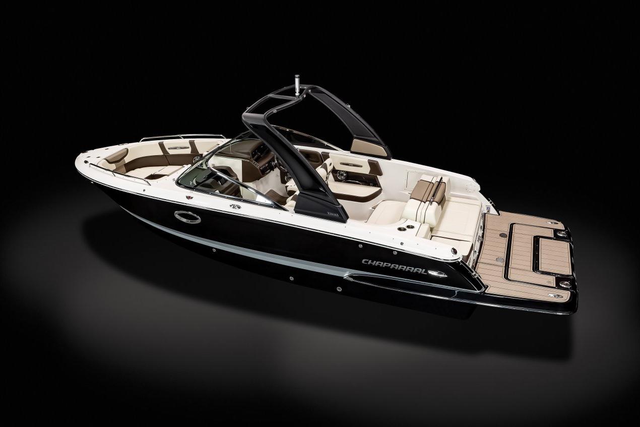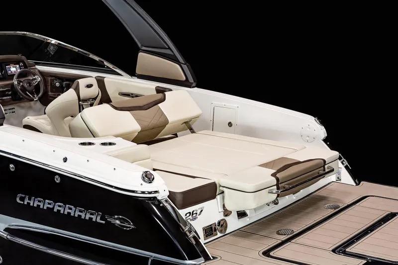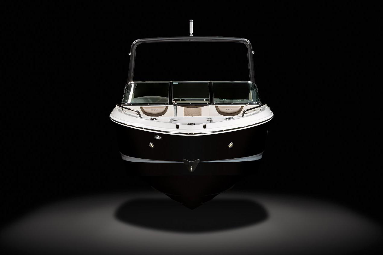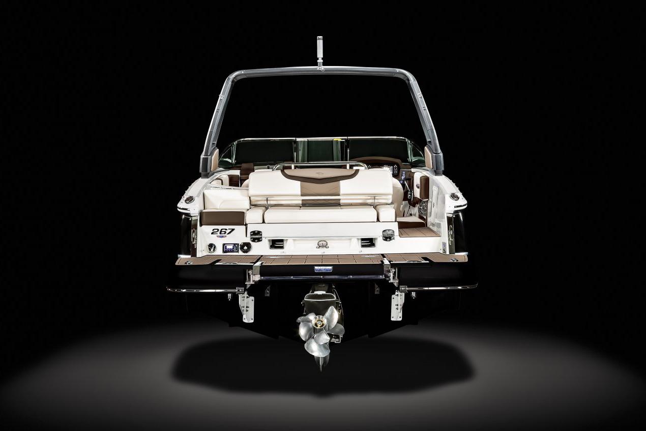 The helm features a glass dash with dual touch screen displays. Cockpit is open, spacious and features a multi-position sun lounger aft. The open concept design carries forward into the bow area which features hinged storage beneath luxuriously appointed upholstery. The cockpit of the 267SSX was designed with an open concept atmosphere. Luxurious wraparound seating lines the perimeter seating around the cockpit and storage is concealed beneath. Stereo speakers, stainless beverage holders, and safety rails are concealed out of the way, yet easily accessible. On the port side, an L-shaped settee can also accommodate a cockpit table. On the starboard side, a wide seat conceals a large carry on cooler. The aft section of the seating effortlessly transforms into a wide and expansive lay-flat lounge. Either end of the lounger can be raised up to maximize comfort. In the upright position, the aft facing portion is ideal for watching swimmers or preparing for water-sports.