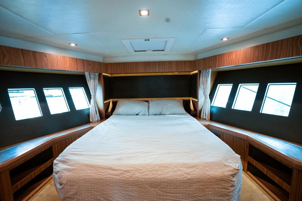 • Owner's Cabin: Located forward, this full-beam suite offers exceptional light and privacy, with large hull windows providing breathtaking views.