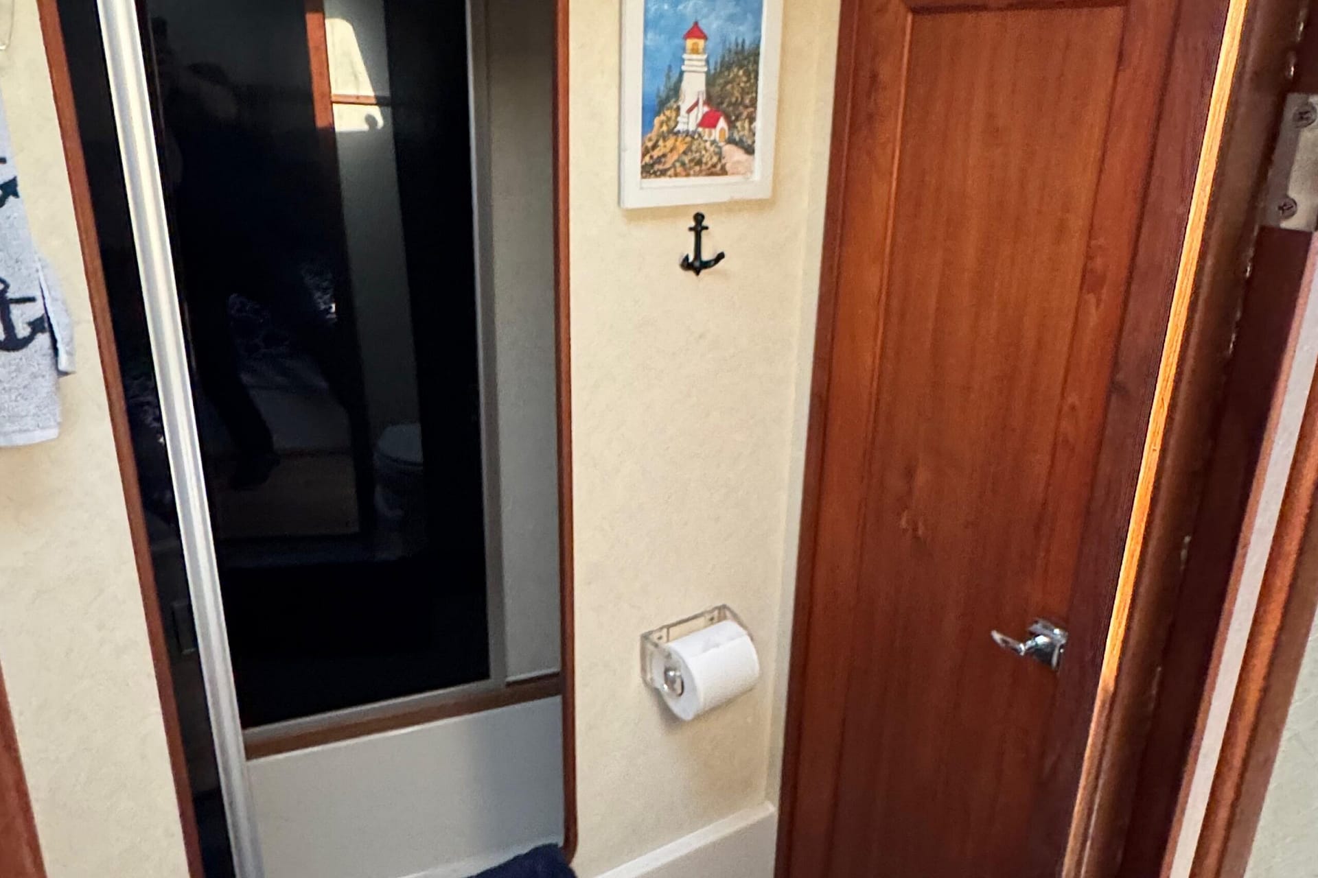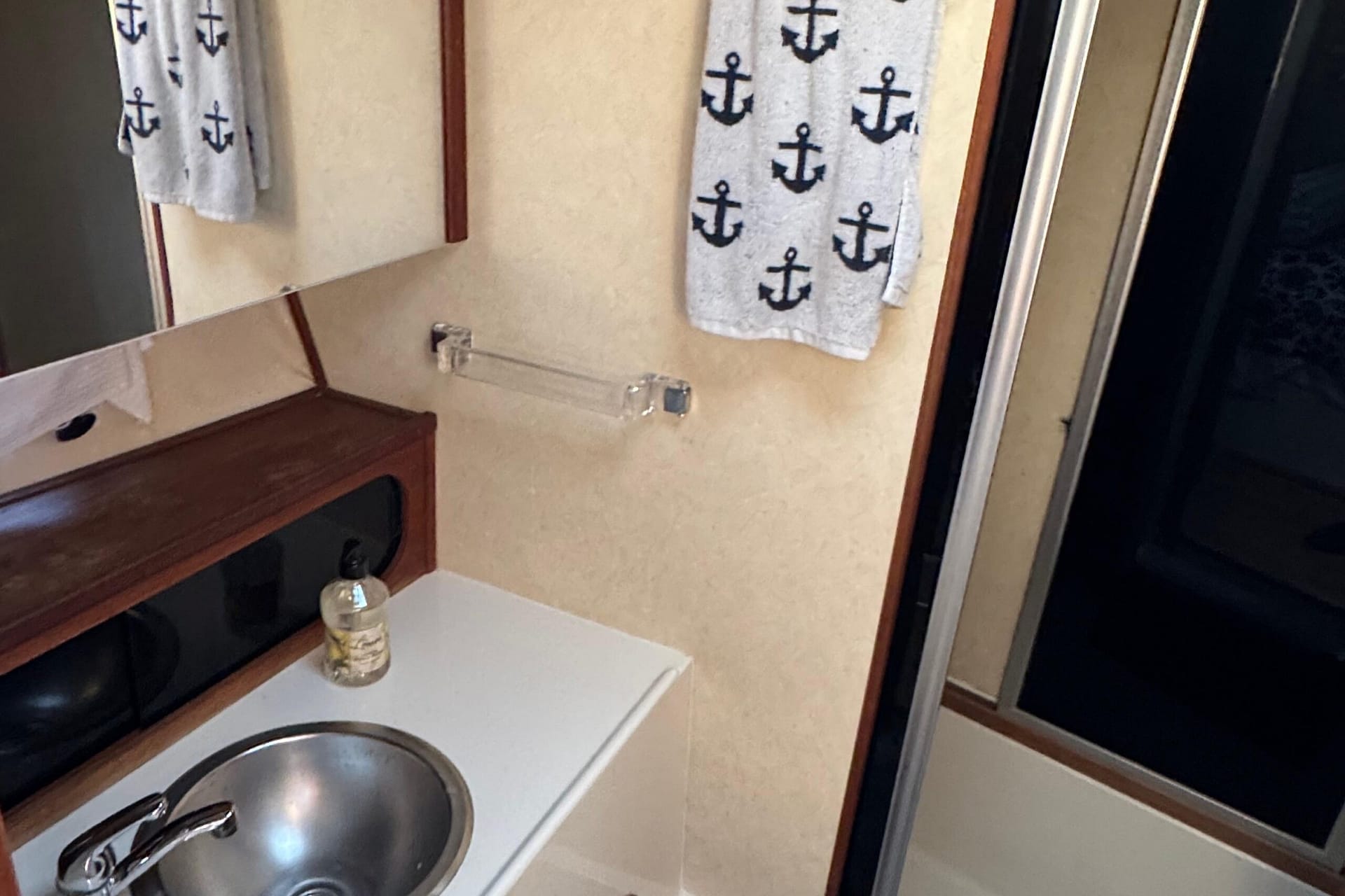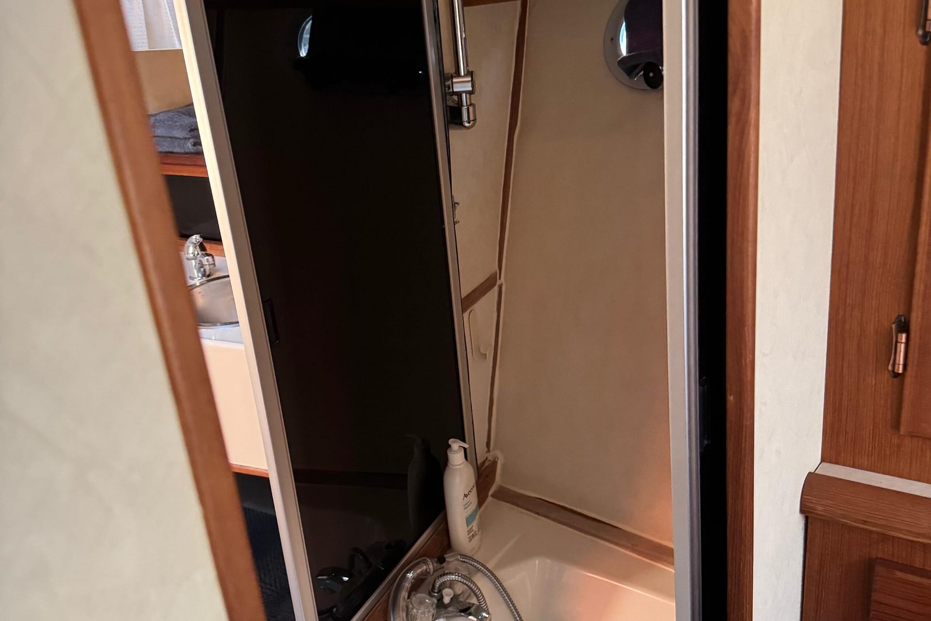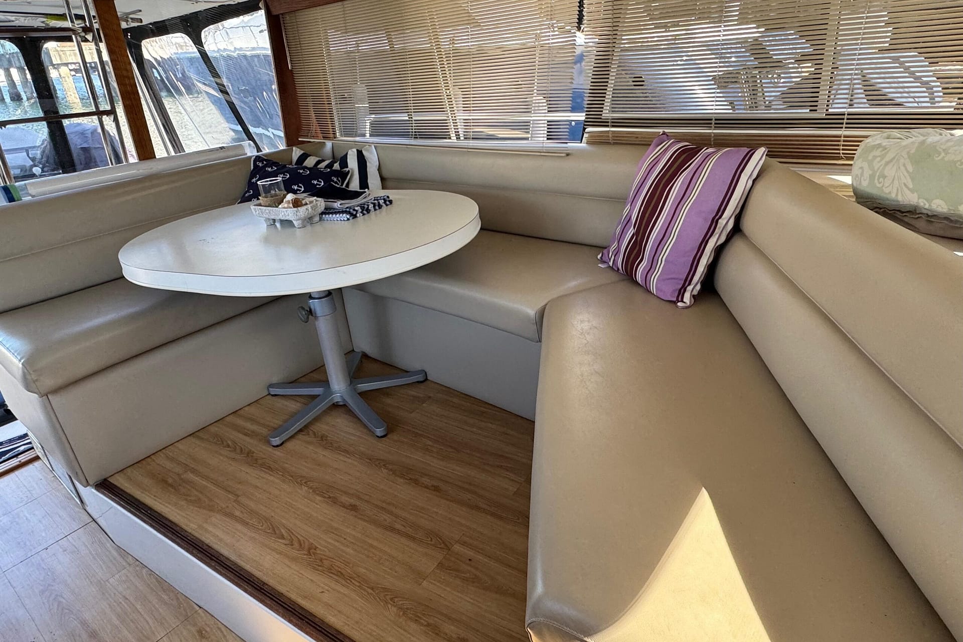 The main salon has seating for 8, a half-moon dinette to the port side, directly across the lower helm station, perfect for dinner, card games, or just socializing indoors. This dinette grants its patrons a 360-degree view of their surroundings. Added mini blinds and forward sunscreen for the hot days that double to provide your floating condo 360-degree of privacy! This yacht has been completely reupholstered, with ultra-leather vinyl seating and all-new wall vinyl replaced throughout, giving this vessel a fresh, new and clean, modern feel. (Probably what she looked like in 1994.) A well-appointed galley can be found mid-ship forward and below the lower helm station. Water filters in the galley, convection oven, electric oven, double-door fridge/ freezer. Don’t forget the recently installed laminated water-resistant flooring throughout her main salon and galley area (for ease of cleaning). The key feature of the 3870/3888 was her innovative mid-cabin floor plan with a queen/king berth that extends under the salon sole. 2 heads and a bathtub. There’s a surprisingly large master stateroom forward with a walk-around island berth and en suite head. * Note that there are two heads in this layout, one with a tub/shower stall.