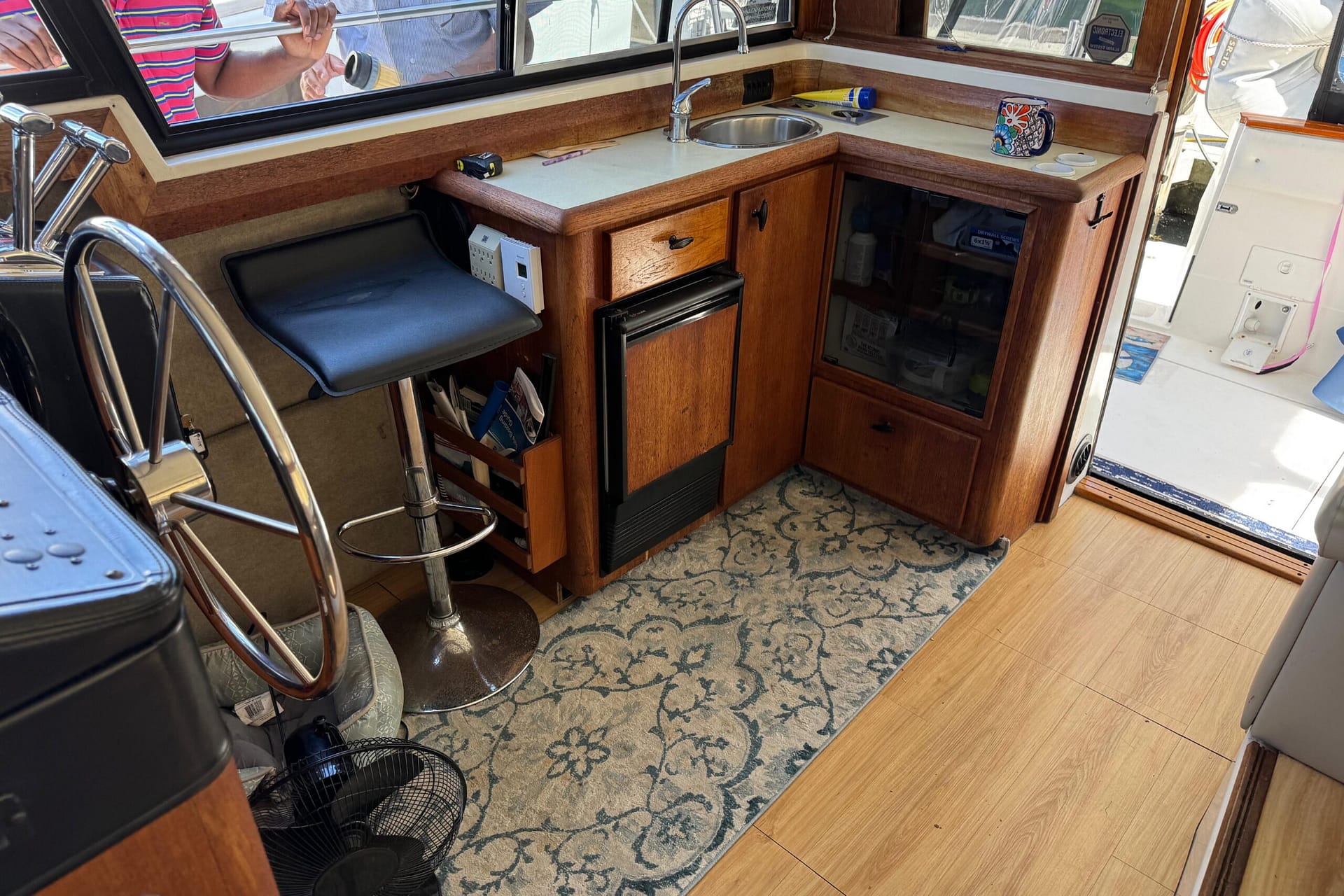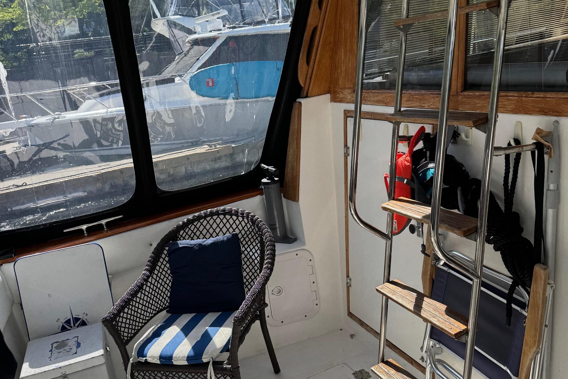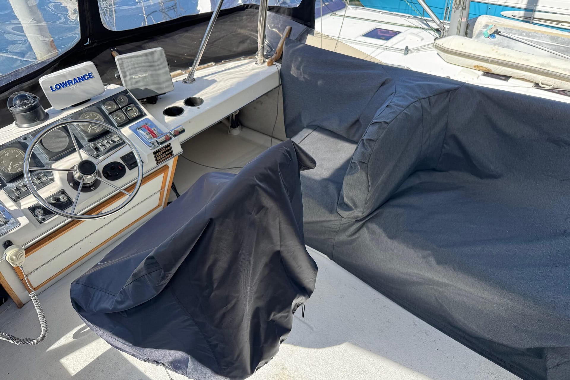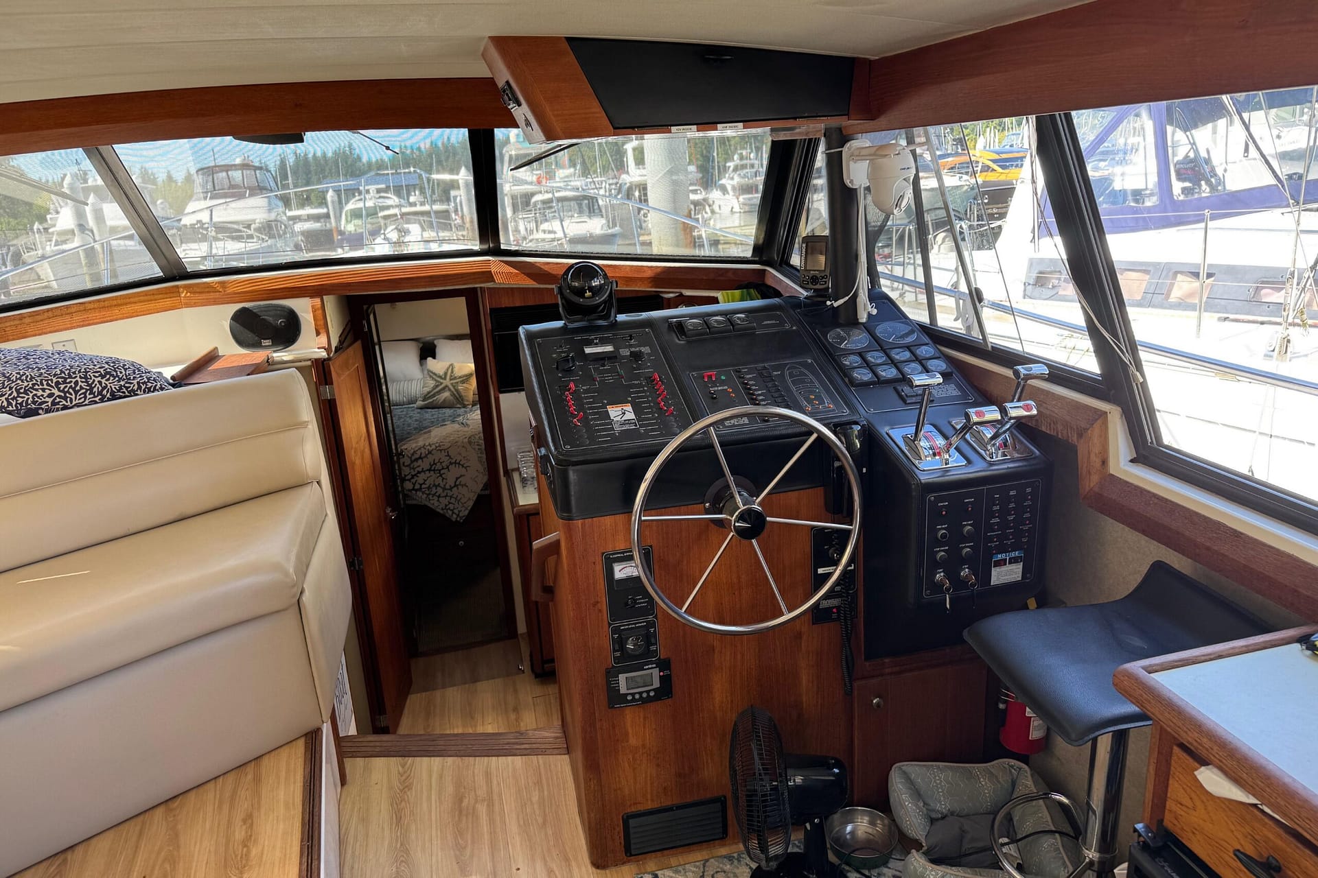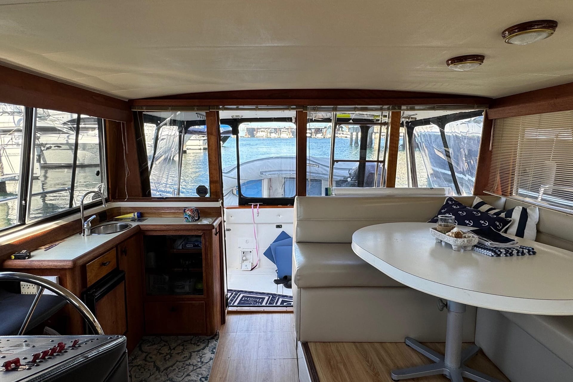 Access to the salon is granted by a sliding glass door partition on the lower aft deck, or by a port-side boarding ladder to the flying bridge. Above, there’s surrounded seating for seven people and the bridge helm station. The lower deck is large enough for a couple of folding chairs as well. New seats and waterproof covers are also included to protect against unexpected rain, and there are three portable seats for the upper bridge.