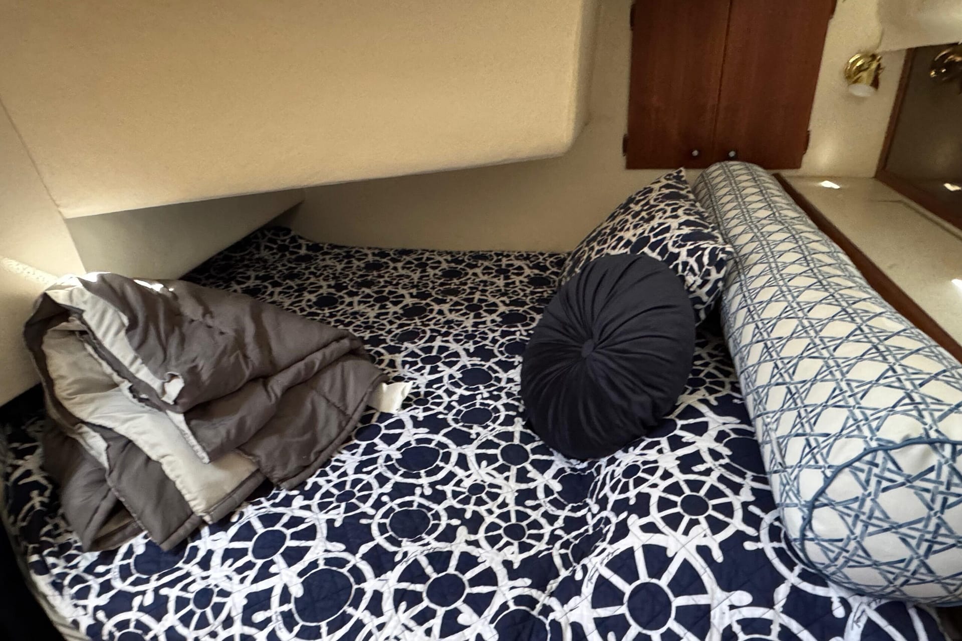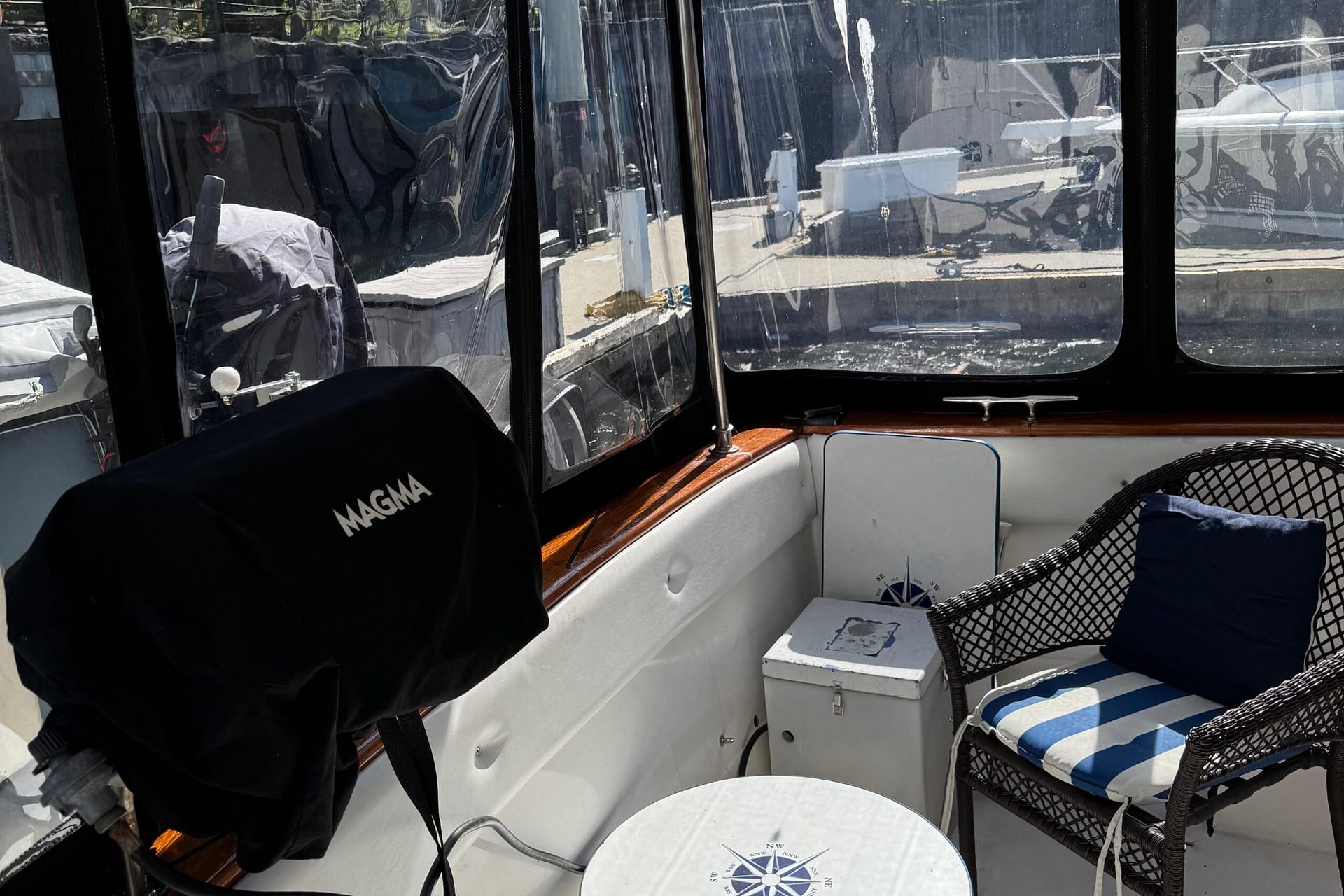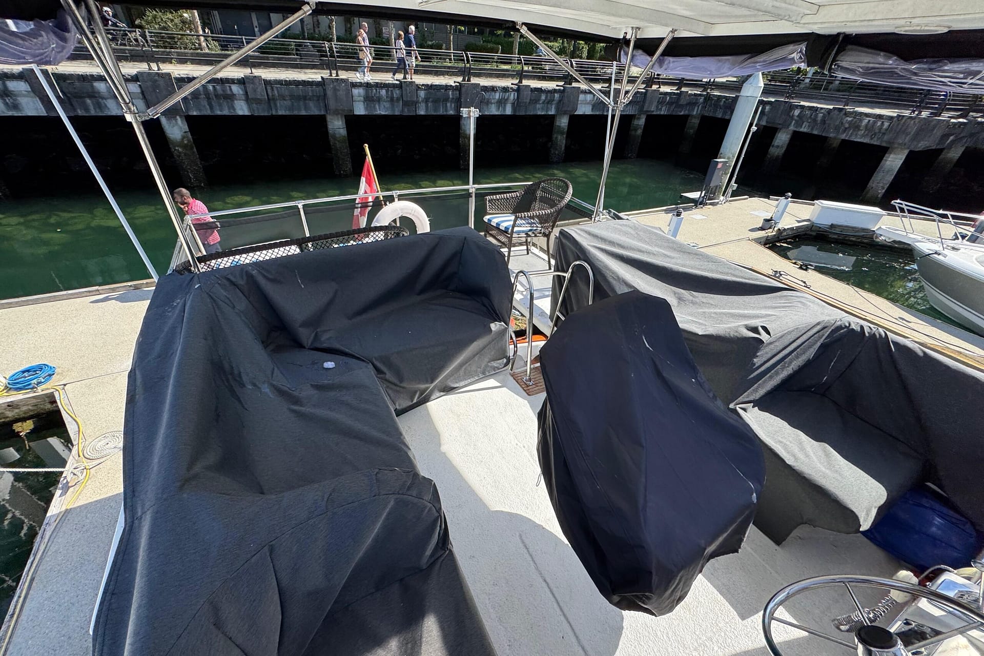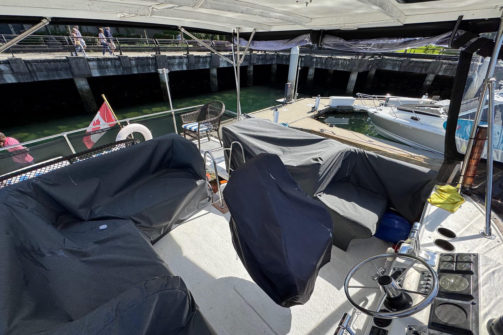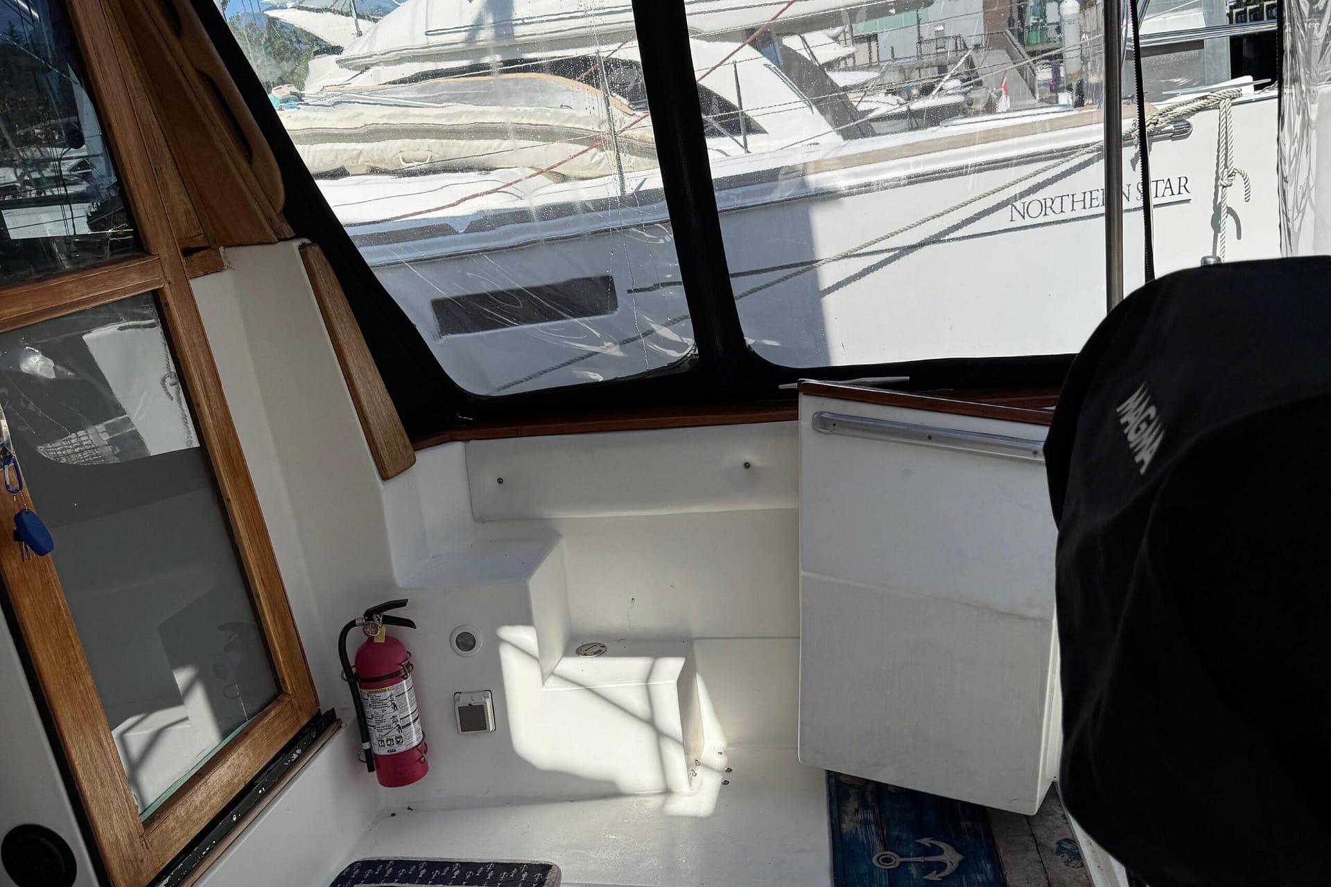 Access to the salon is granted by a sliding glass door partition on the lower aft deck, or by a port-side boarding ladder to the flying bridge. Above, there’s surrounded seating for seven people and the bridge helm station. The lower deck is large enough for a couple of folding chairs as well. New seats and waterproof covers are also included to protect against unexpected rain, and there are three portable seats for the upper bridge.