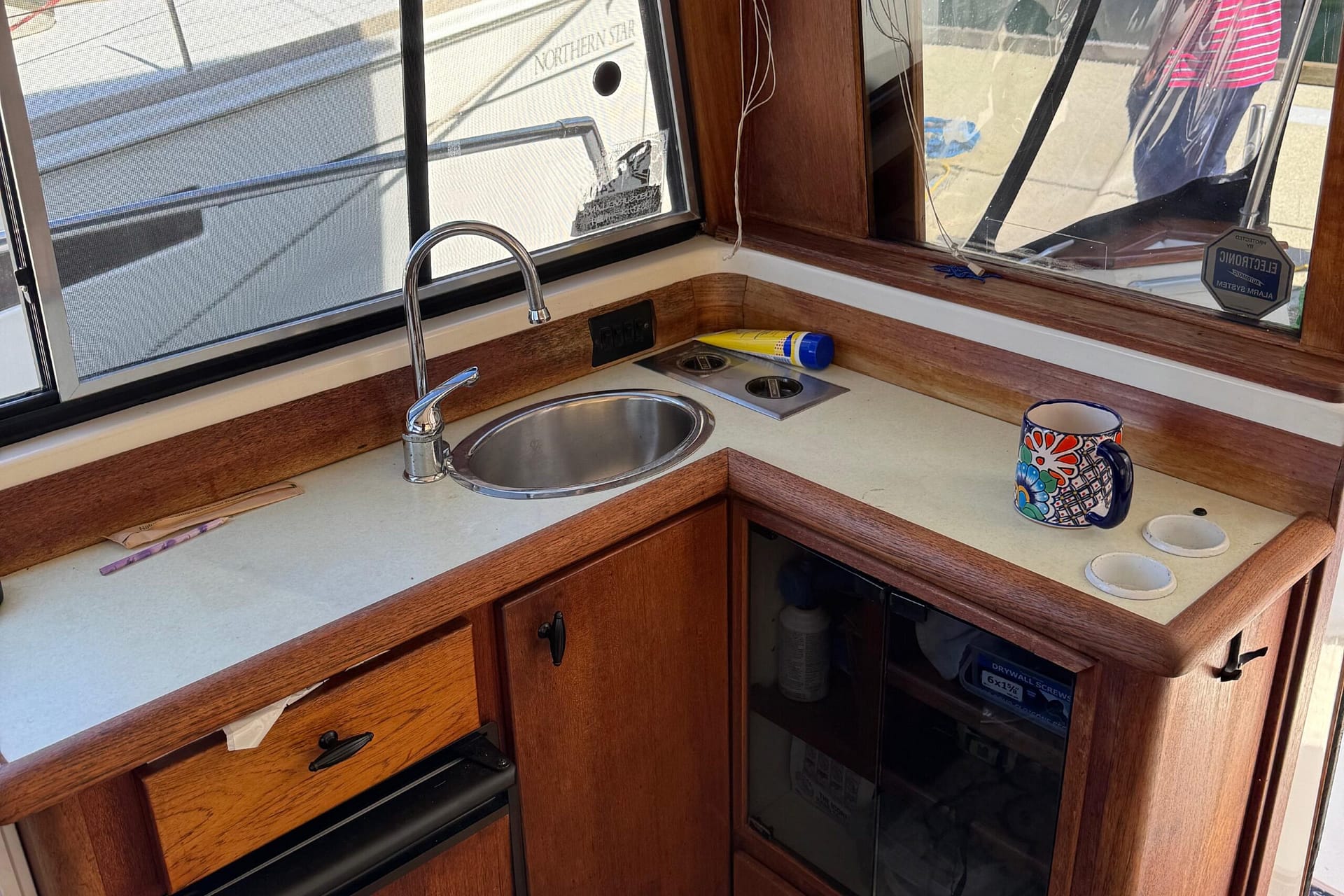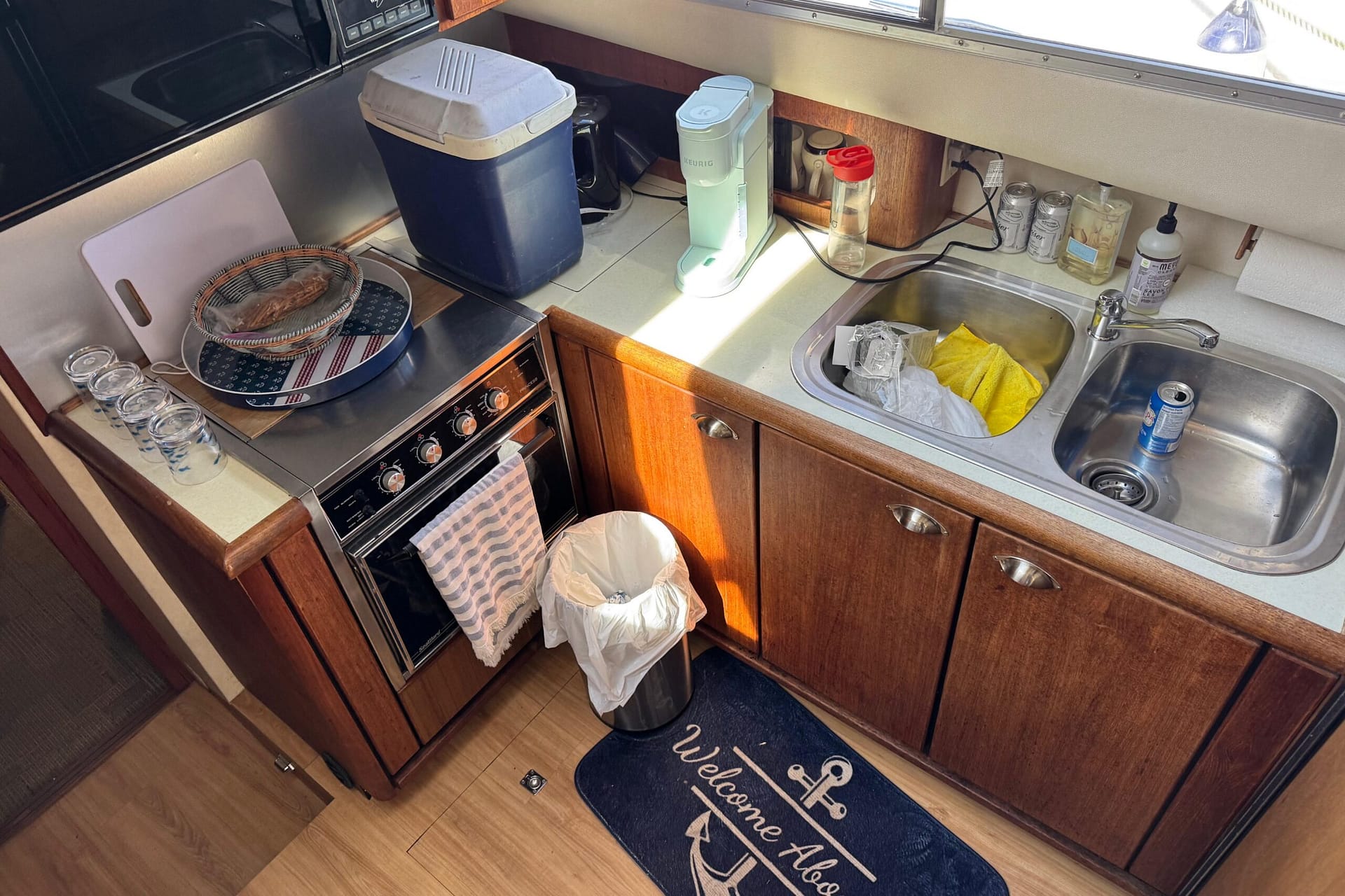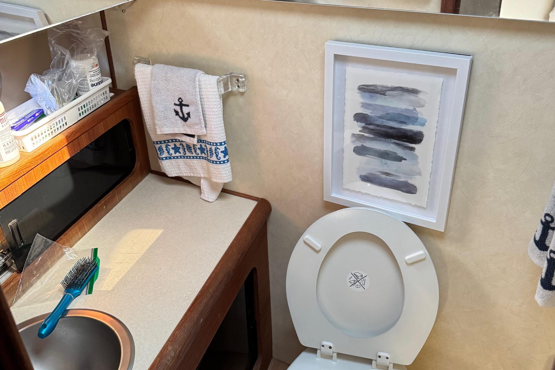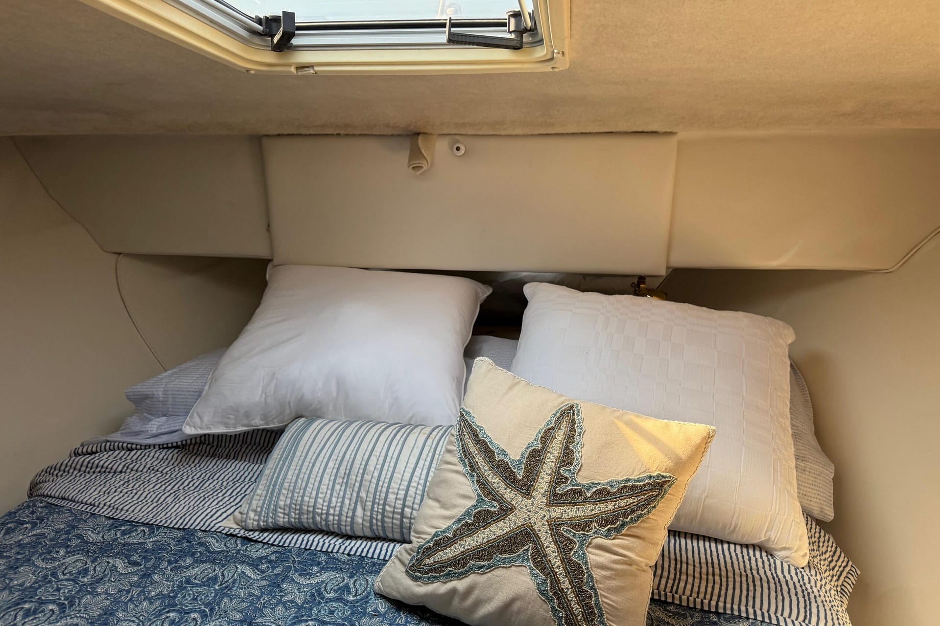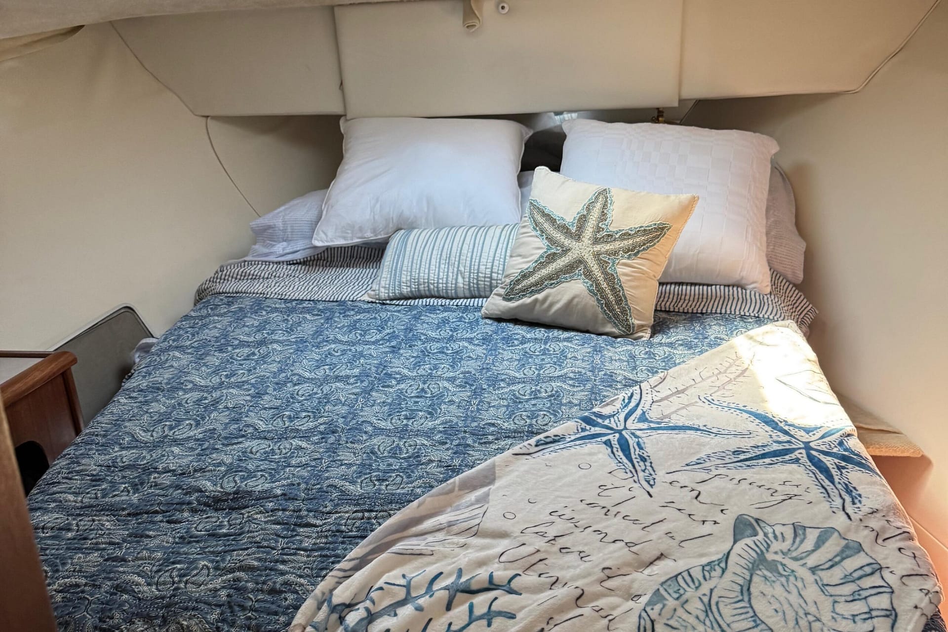 Access to the salon is granted by a sliding glass door partition on the lower aft deck, or by a port-side boarding ladder to the flying bridge. Above, there’s surrounded seating for seven people and the bridge helm station. The lower deck is large enough for a couple of folding chairs as well. New seats and waterproof covers are also included to protect against unexpected rain, and there are three portable seats for the upper bridge.