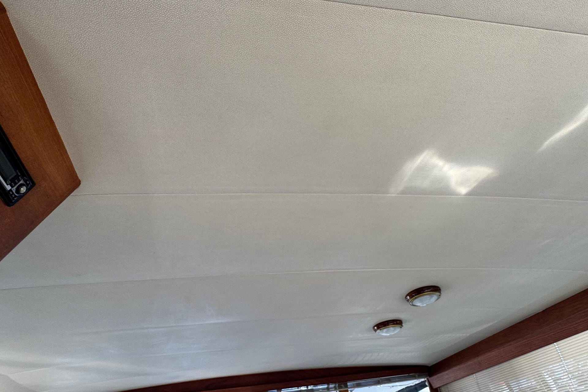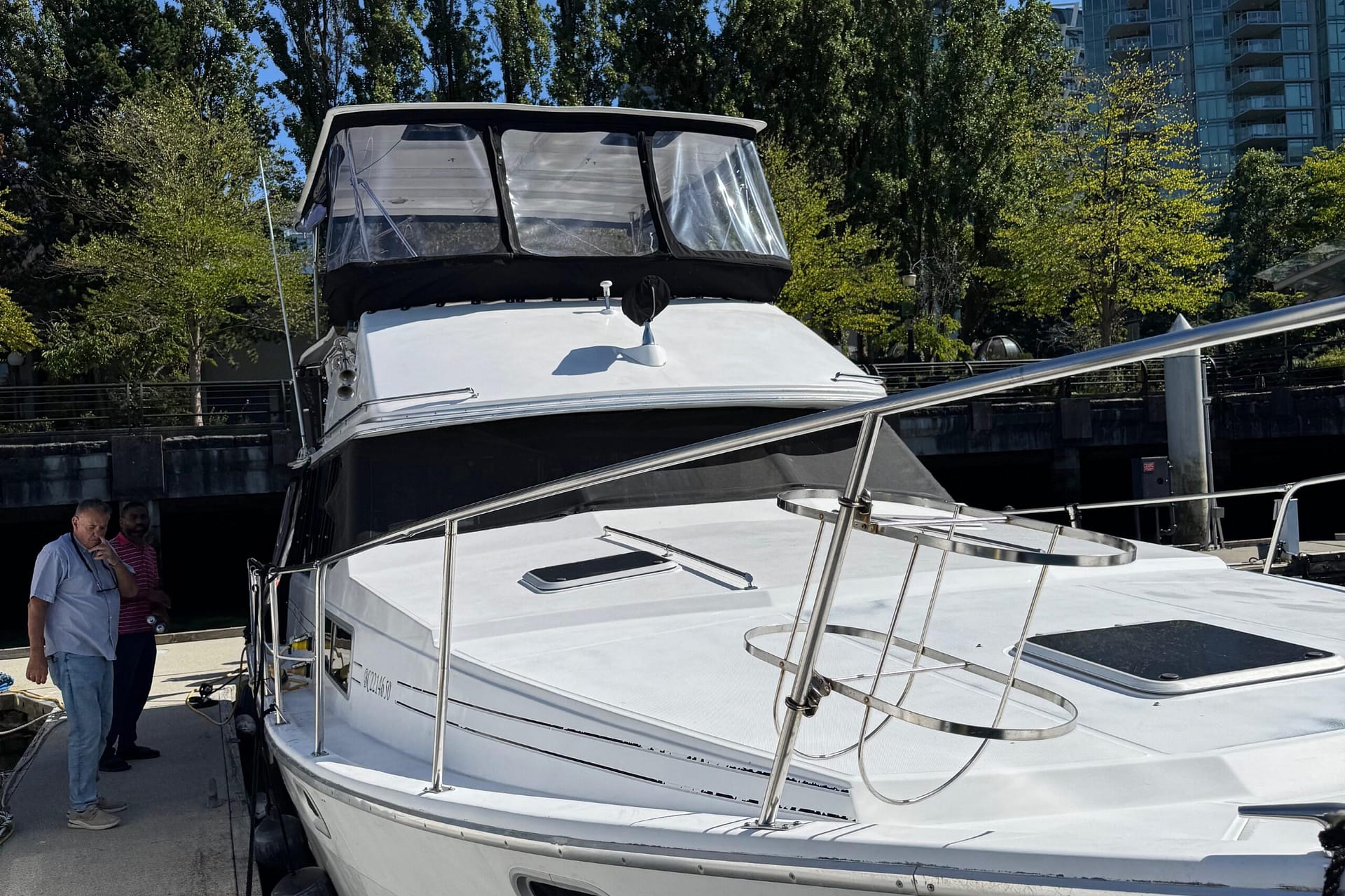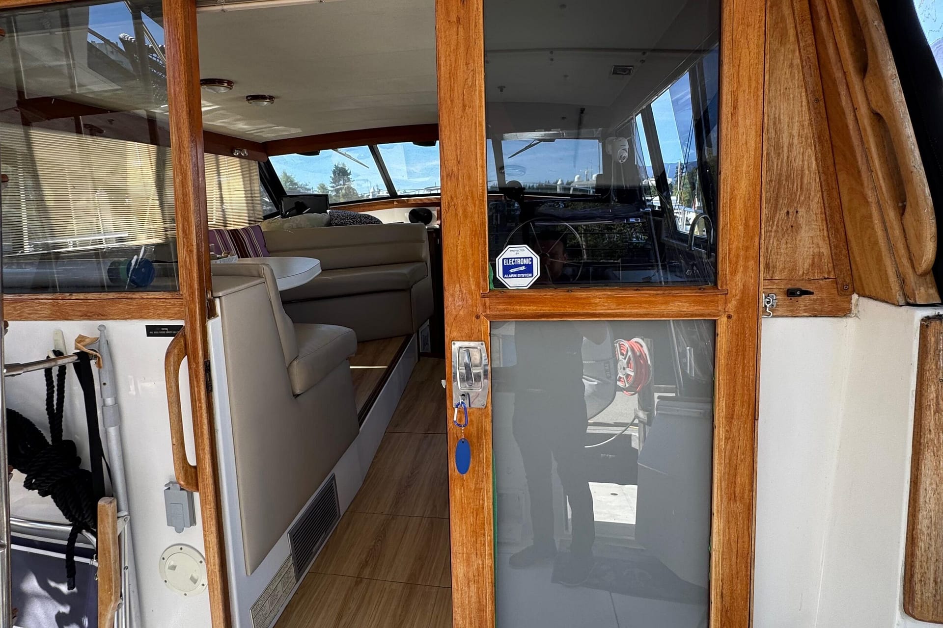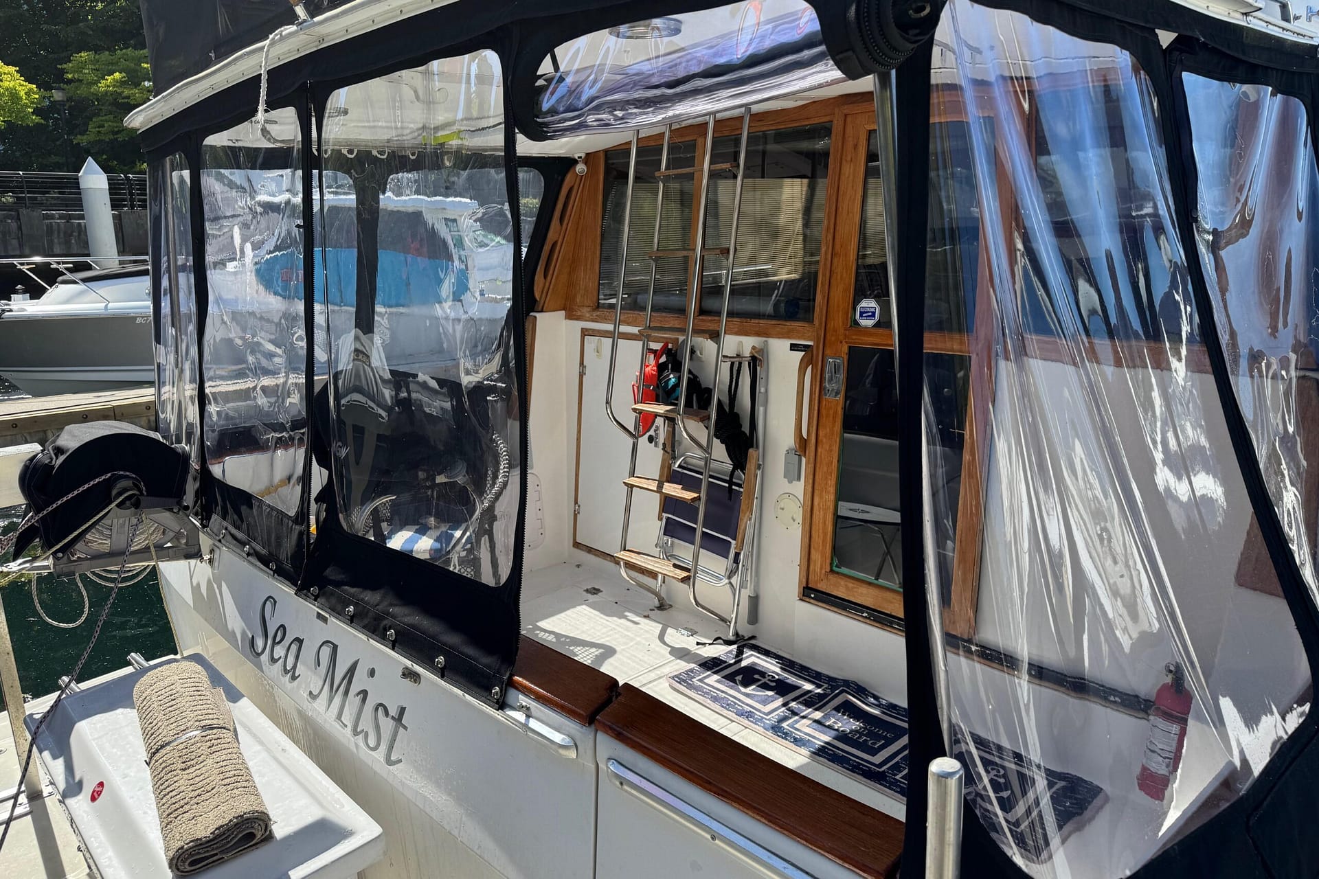 Upon approaching, it’s immediately evident that this is a well-made, extremely well-cared-for, and upgraded example of the 3880 Motor Yacht. The exterior improvements include all-new canvas and crystal-clear isinglass windows Bridge and lower aft deck, as well as a unique but sharp-looking custom hardtop.