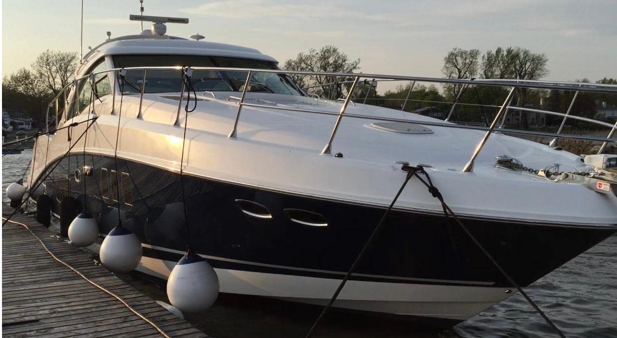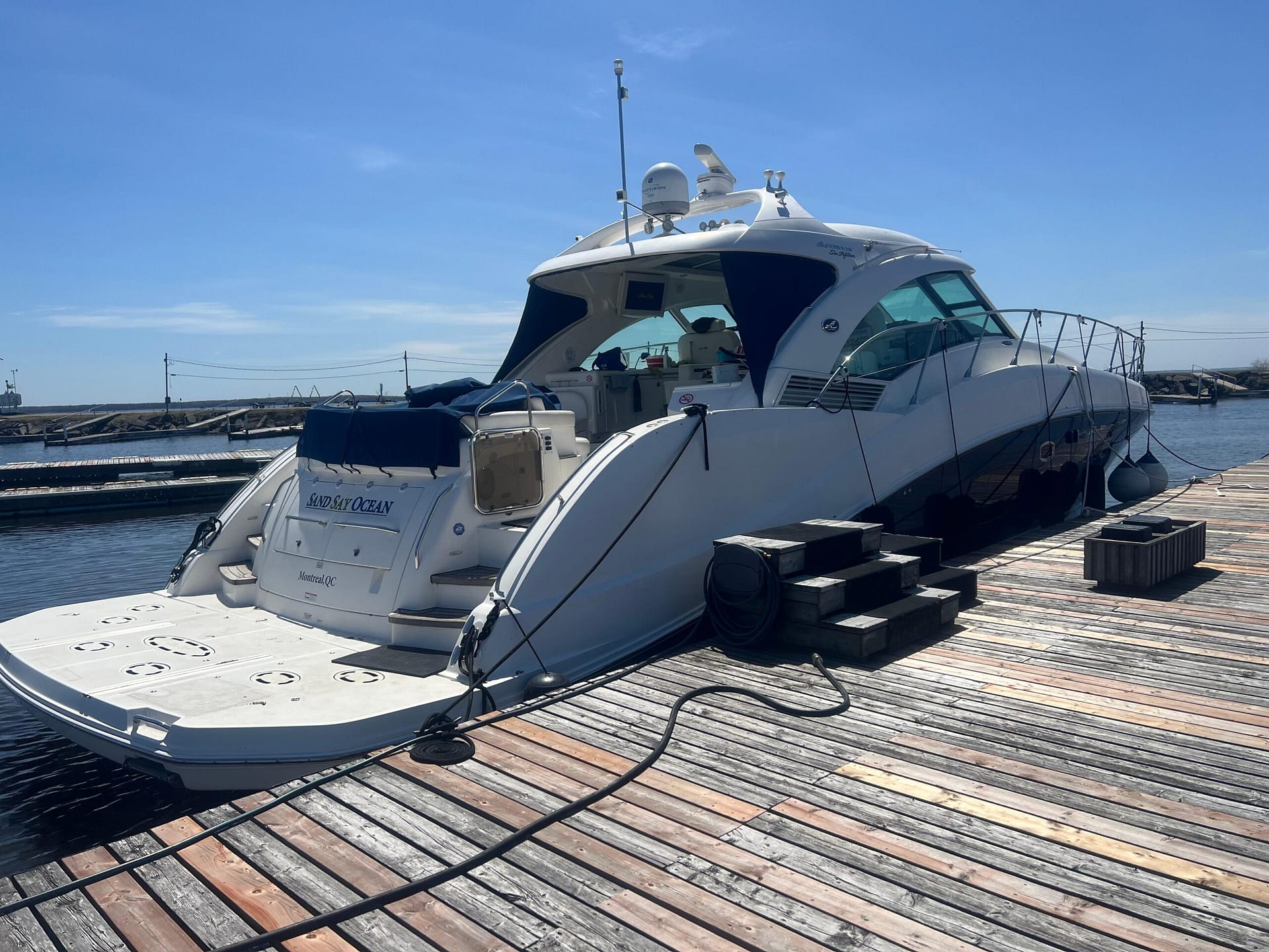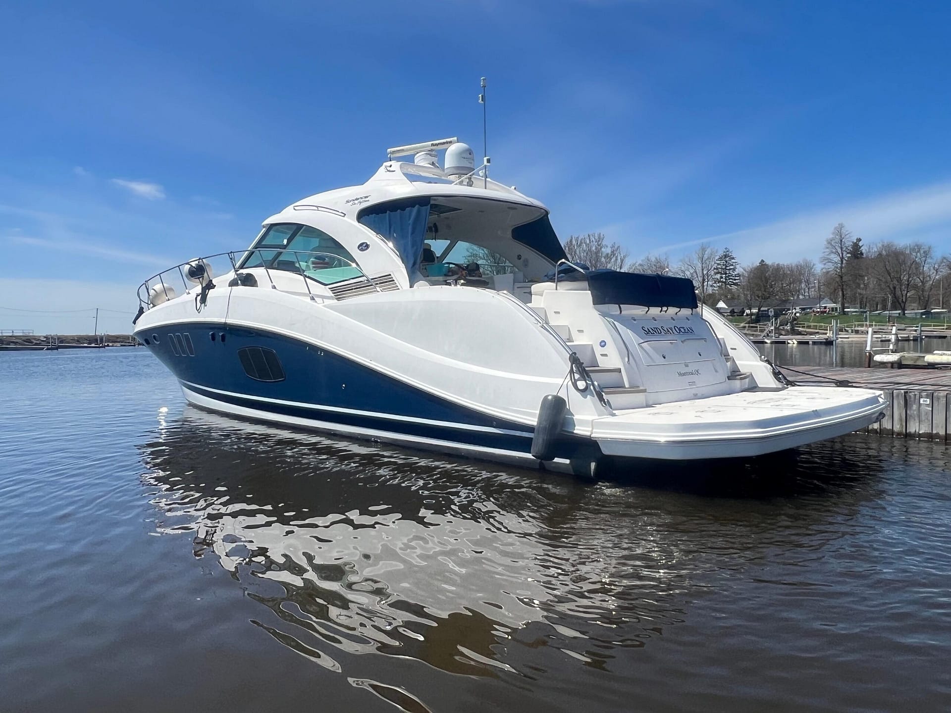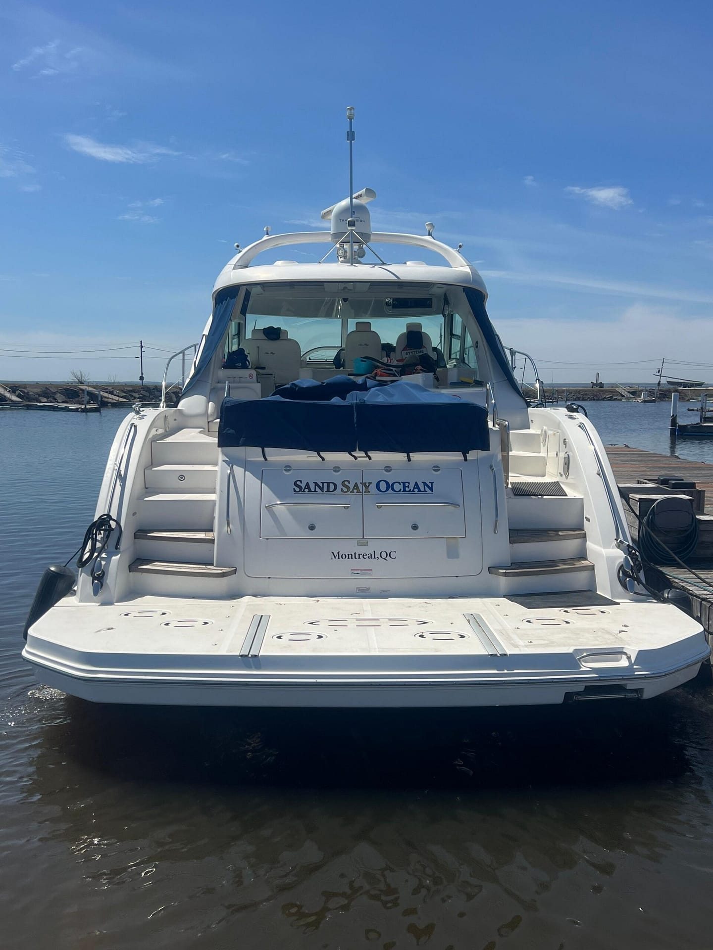 ‘Sand Say Ocean’ Is a single owner, freshwater only, highly equipped luxury yacht. She sports low hours. A navy blue hull, and all the features required for live aboard status.