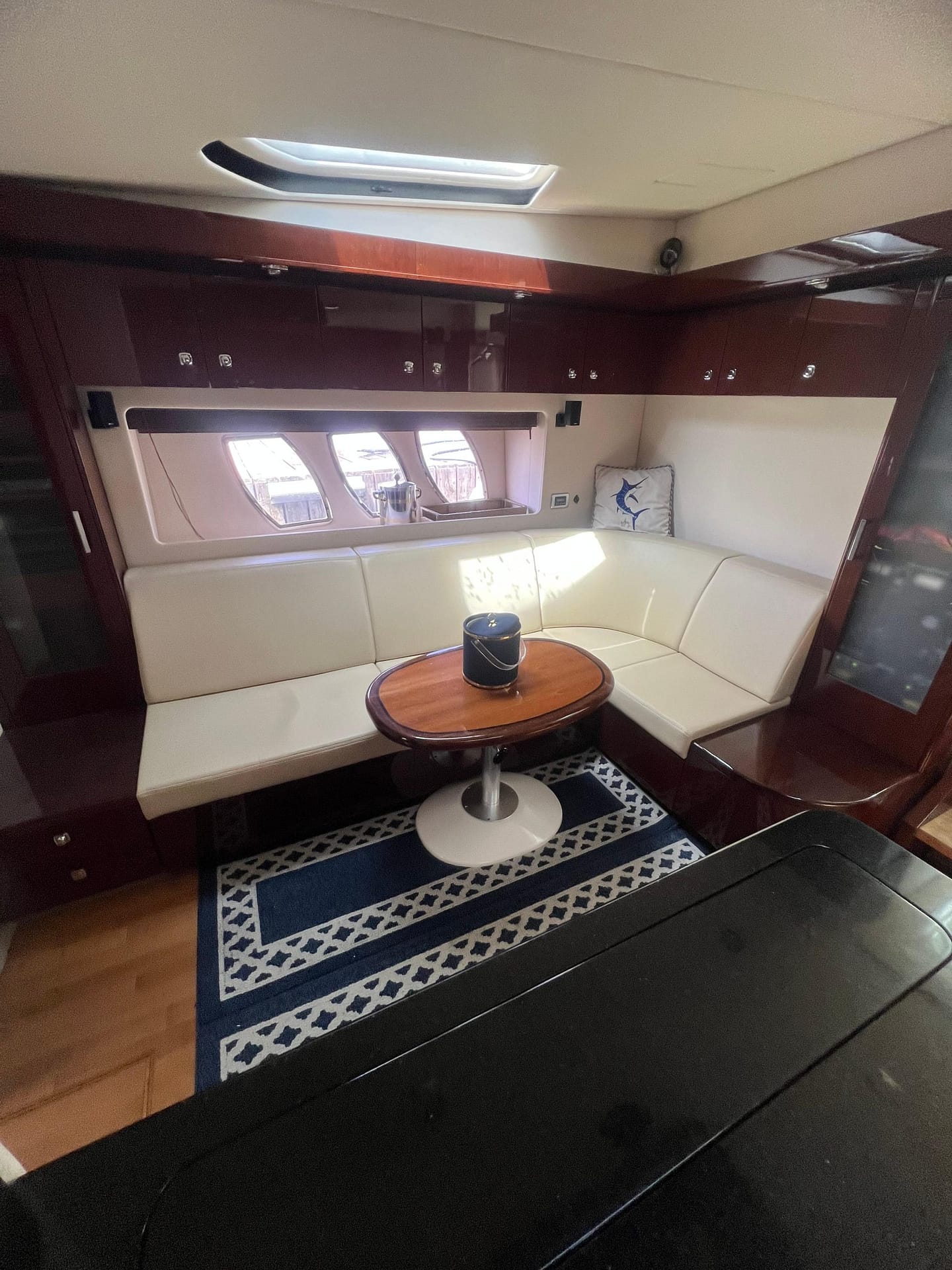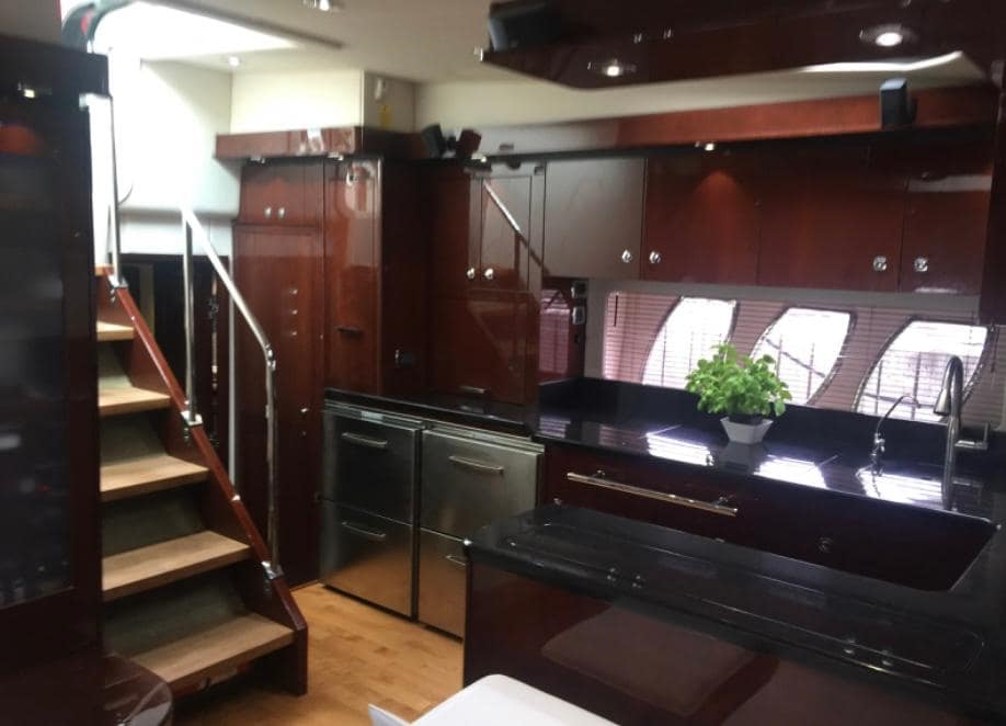 Aside from her dramatic styling and bold presence. The 580’s opulent interior, A gorgeous blend of dark cherry wood cabinets, Ultra-leather seating, stainless steel appliances and black corian countertops was a match for the finest European Yachts of the day.