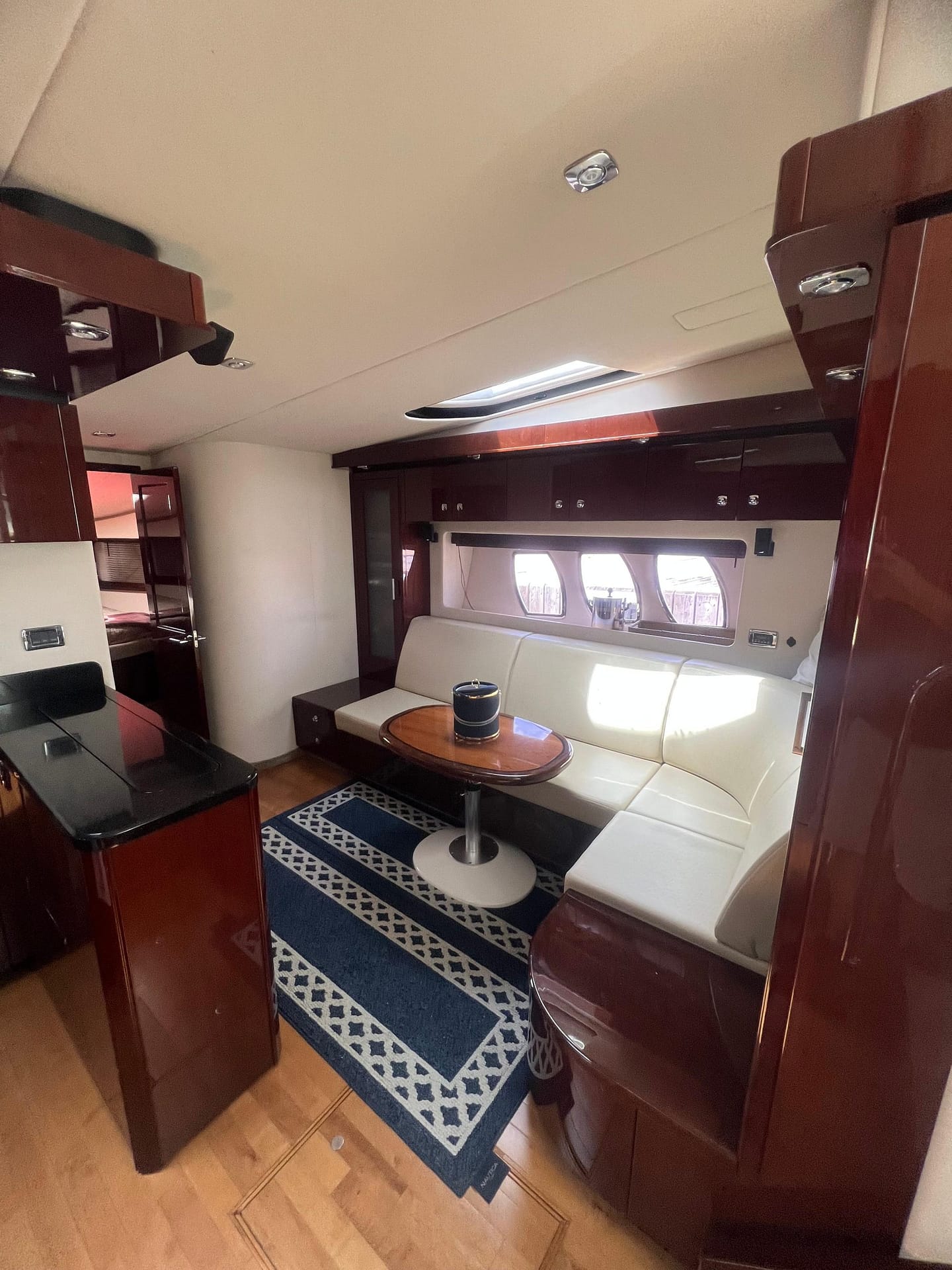 The huge cockpit has an innovative twin section lounge that slides 360 around a table on tracks. A cockpit Galley with grill, fold down LED television. Premium audio surround sound. Removable aft teak table. The aft bench converts into a large sun pad to accompany the bow cushion/ sun pad with adjustable back rest.