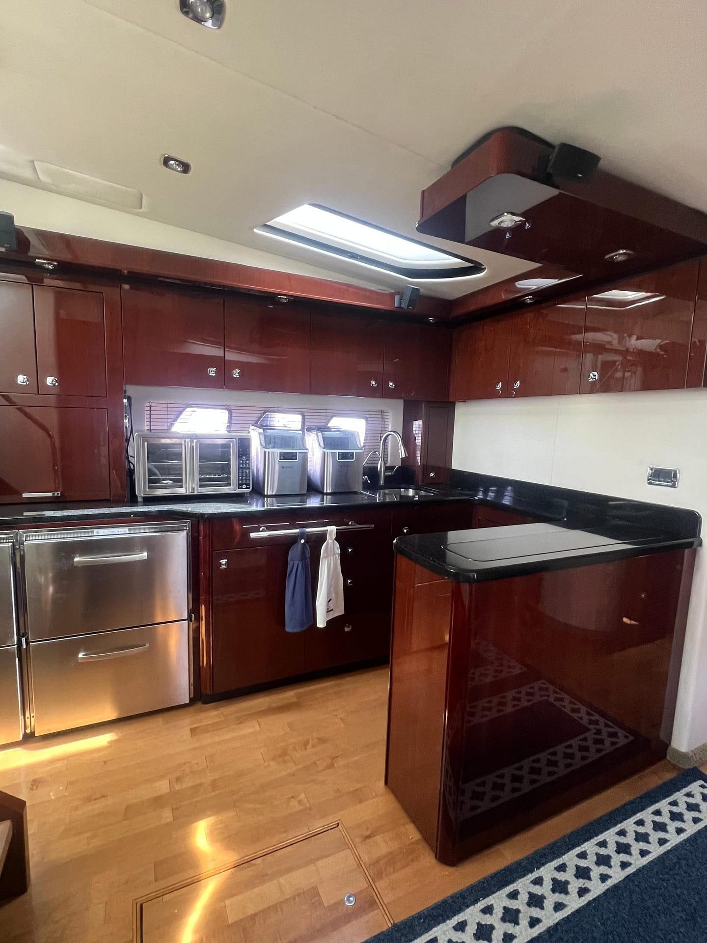 - Below the salon features an ultra leather L-shaped sofa across from a luxuriously appointed galley with stainless steel appliances and serving counter, A retractable LED television, hardwood flooring throughout. A wine cooler and washer/dryer combo equipped.