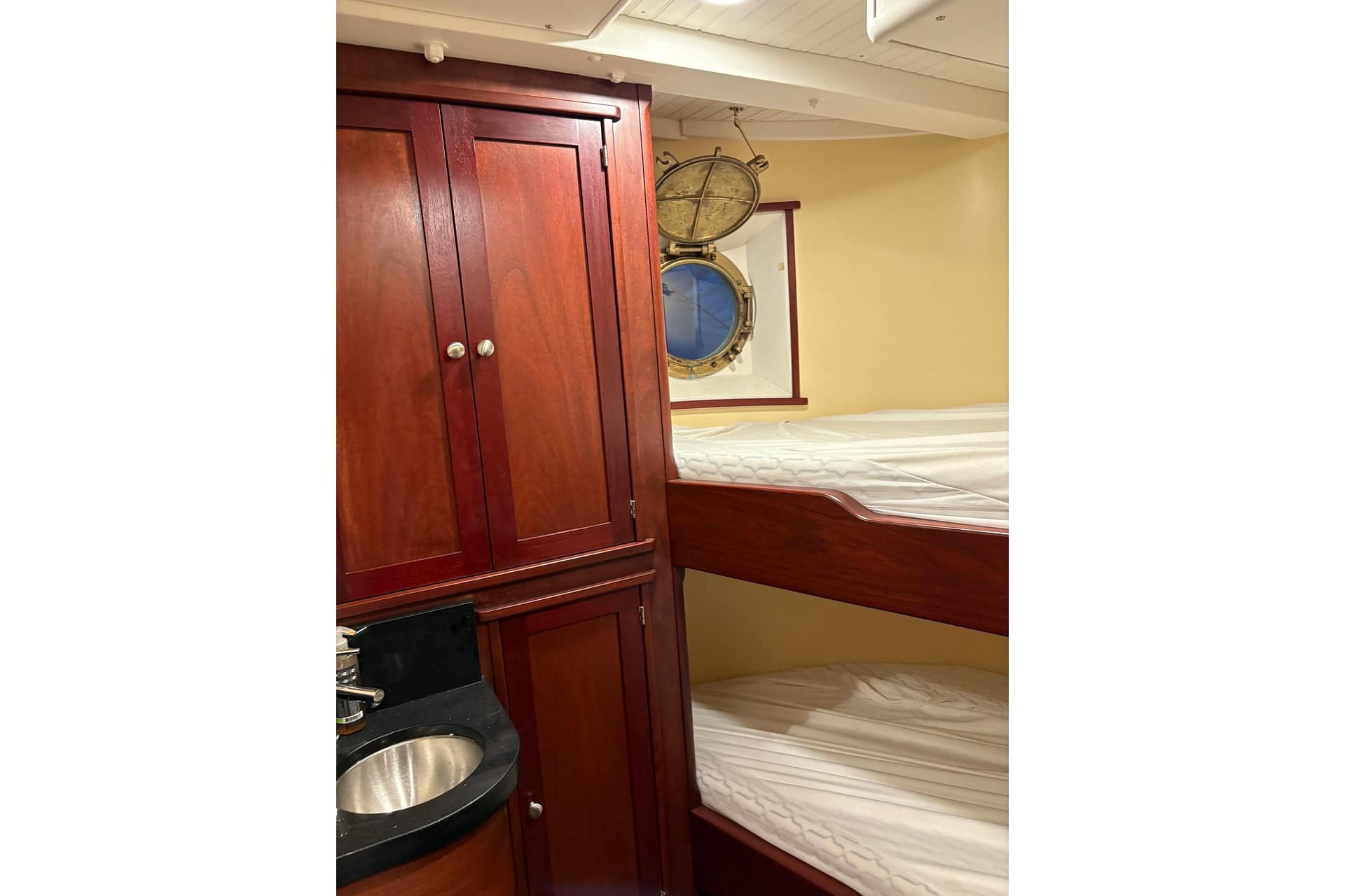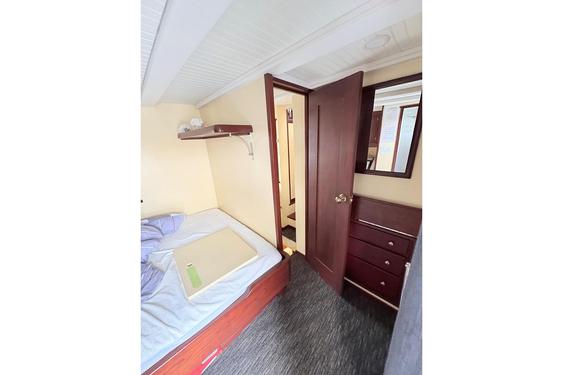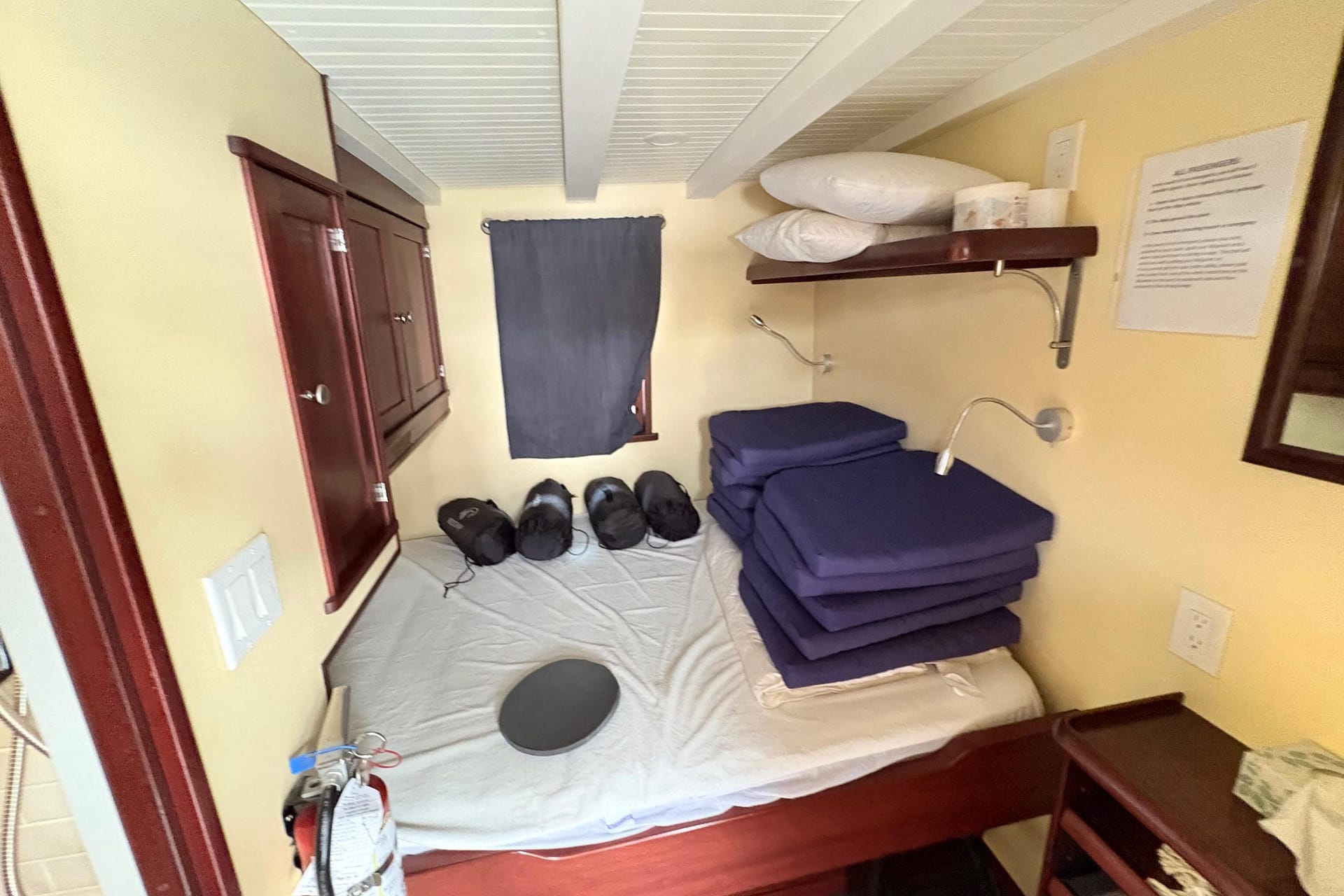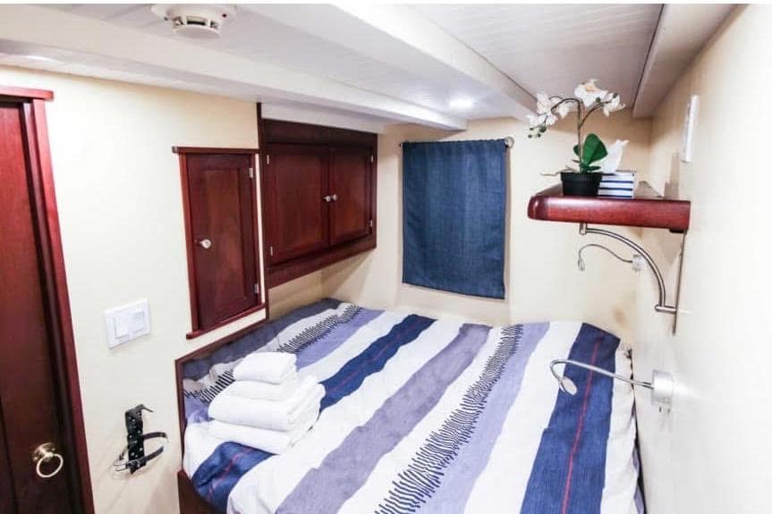 AFT CABIN: Aft Cabin Privacy Curtain, Double-Wide Berth, Reading Lights (12V) Storage Cabinet & Custom Rails, Window with Screen