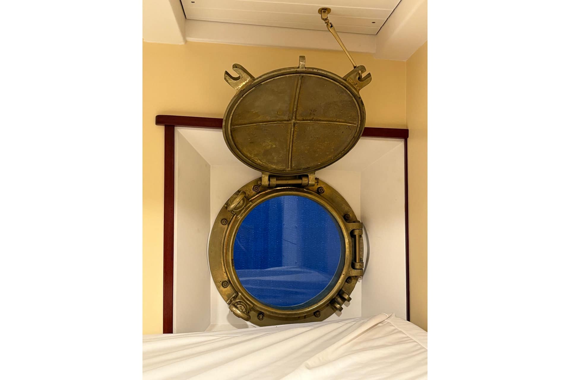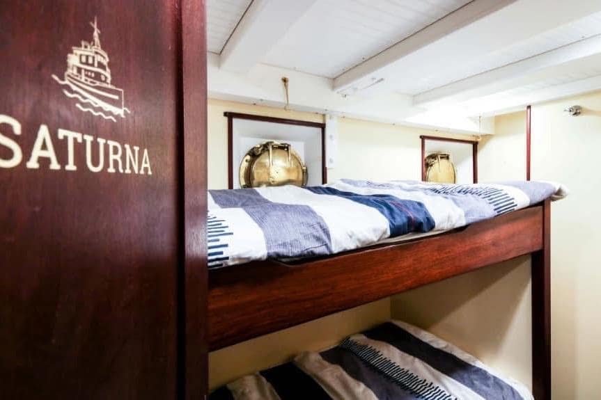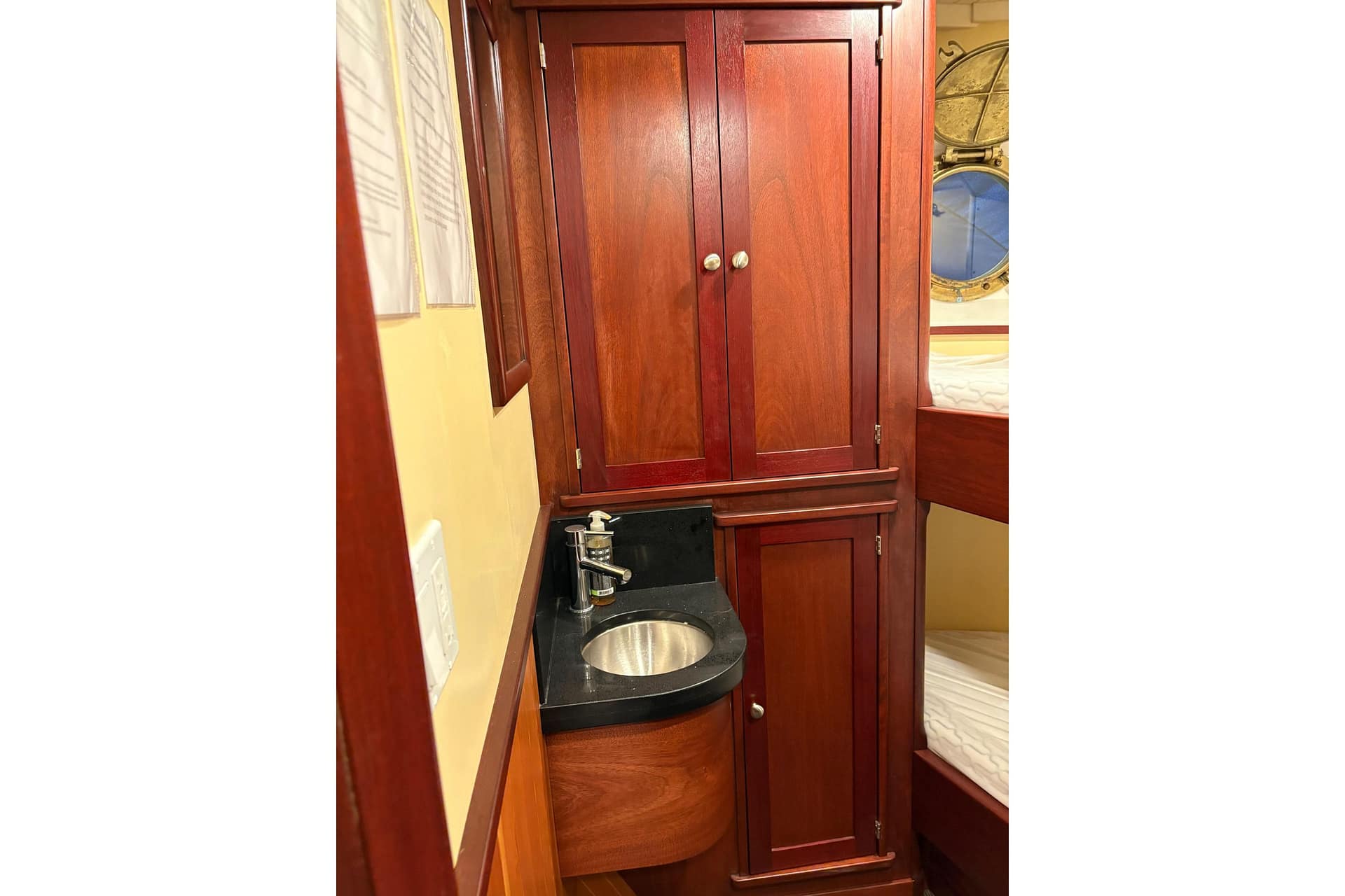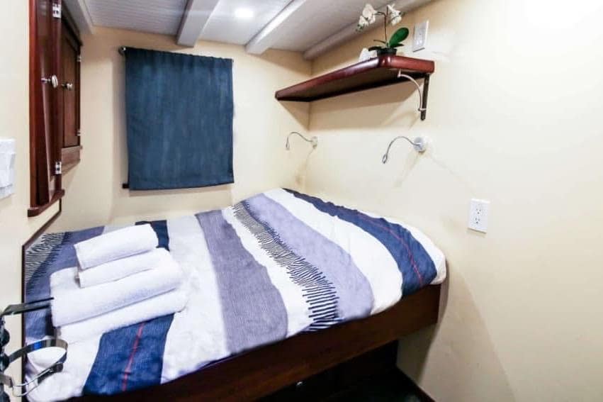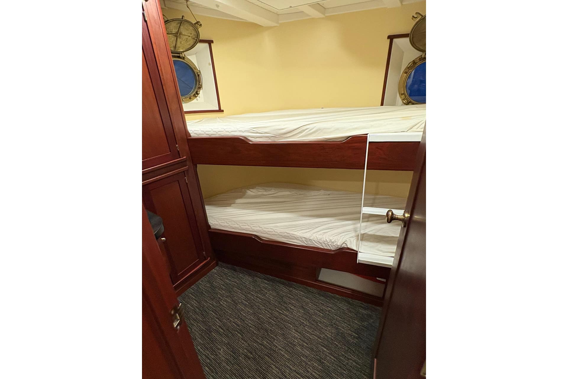 AFT CABIN: Aft Cabin Privacy Curtain, Double-Wide Berth, Reading Lights (12V) Storage Cabinet & Custom Rails, Window with Screen