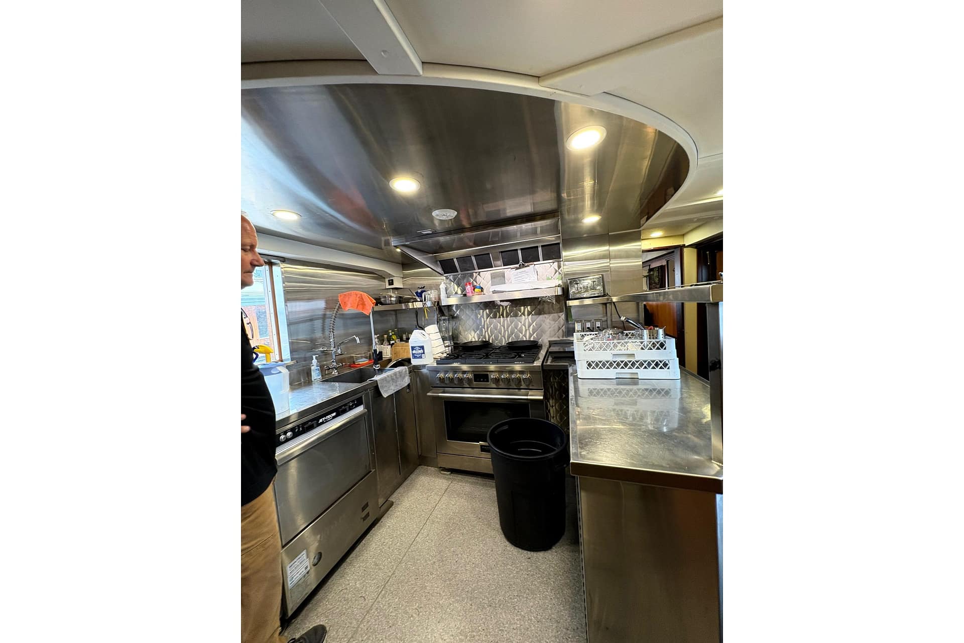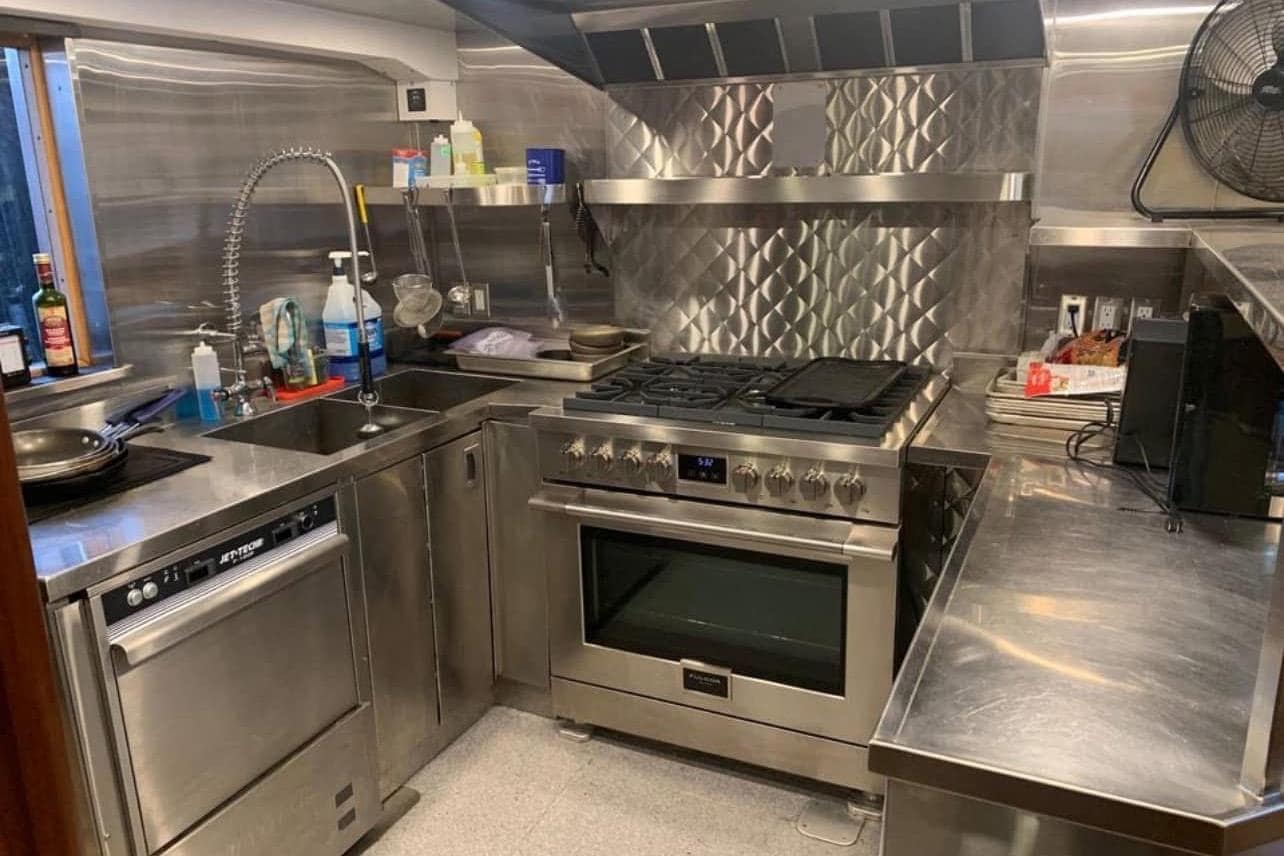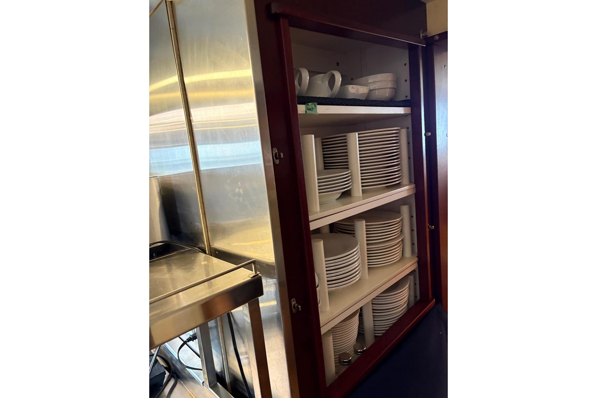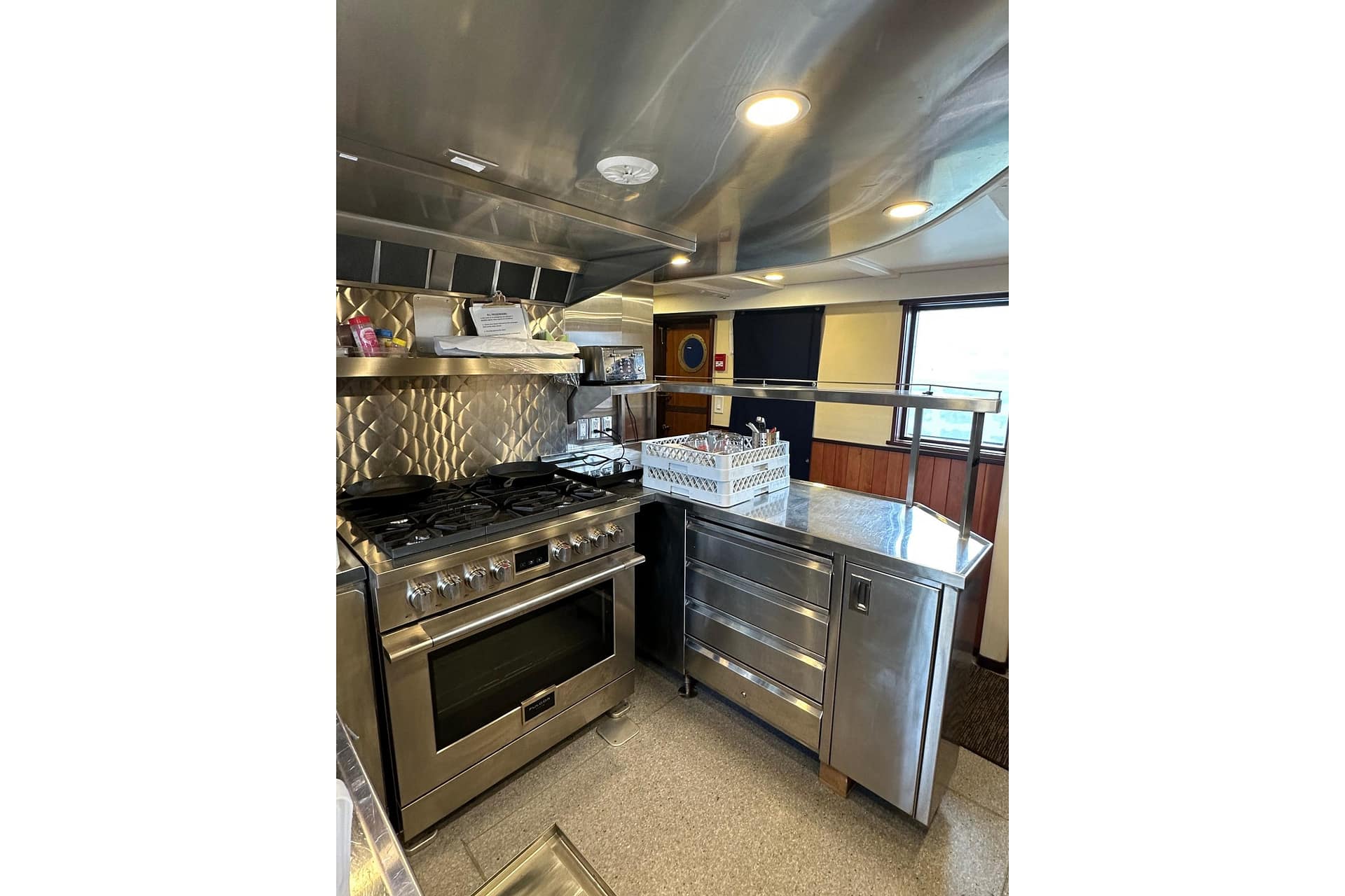 GALLEY: 12V Outlet, Electric Refrigerator (12V/110), Microwave, Courtesy Lights, Custom Cabinetry & Trim, Galley Area with Gray Countertop & Storage, Galley Sink & Faucet, Bow Windows (port & starboard), Light over Galley Area, Galley/Wine Storage, Stove (electric), Cutting Board