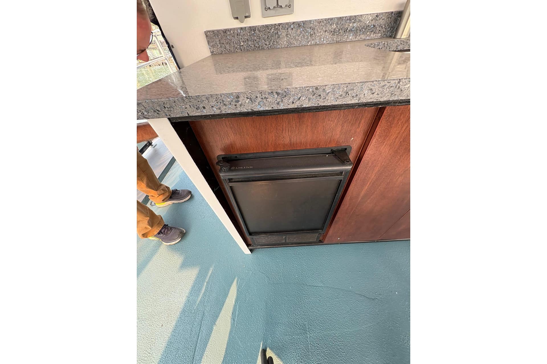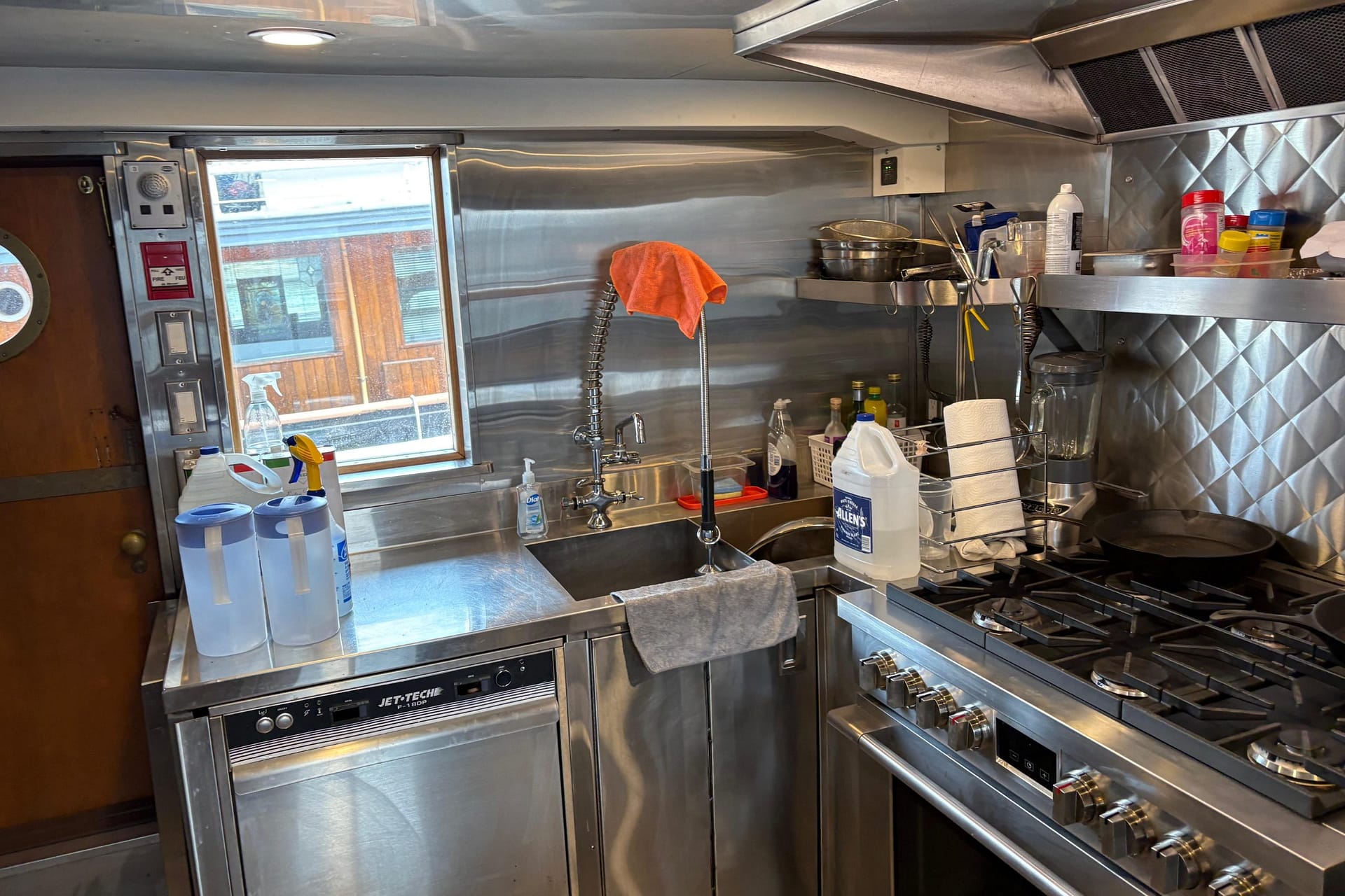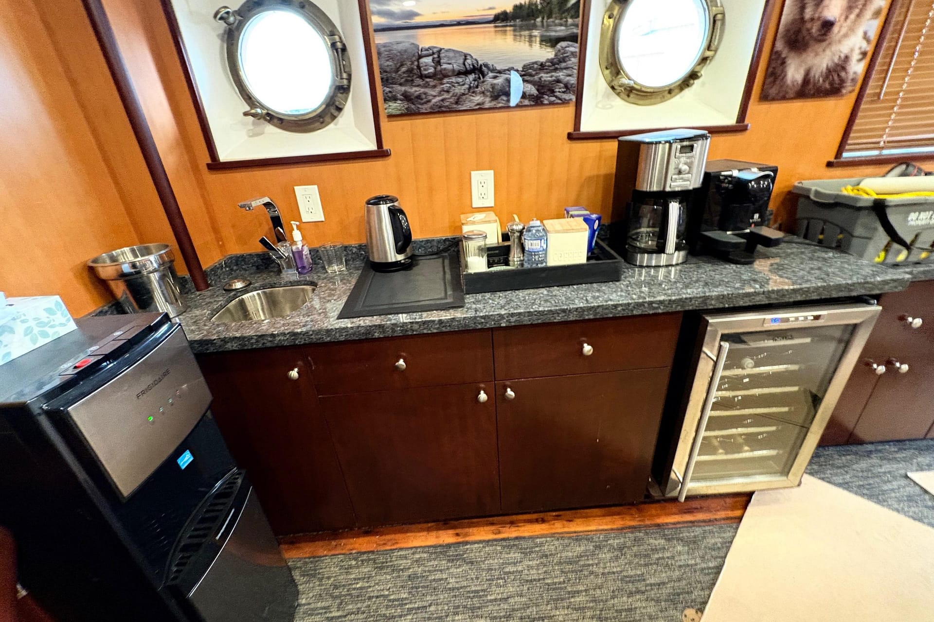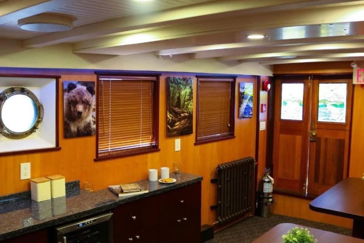 GALLEY: 12V Outlet, Electric Refrigerator (12V/110), Microwave, Courtesy Lights, Custom Cabinetry & Trim, Galley Area with Gray Countertop & Storage, Galley Sink & Faucet, Bow Windows (port & starboard), Light over Galley Area, Galley/Wine Storage, Stove (electric), Cutting Board