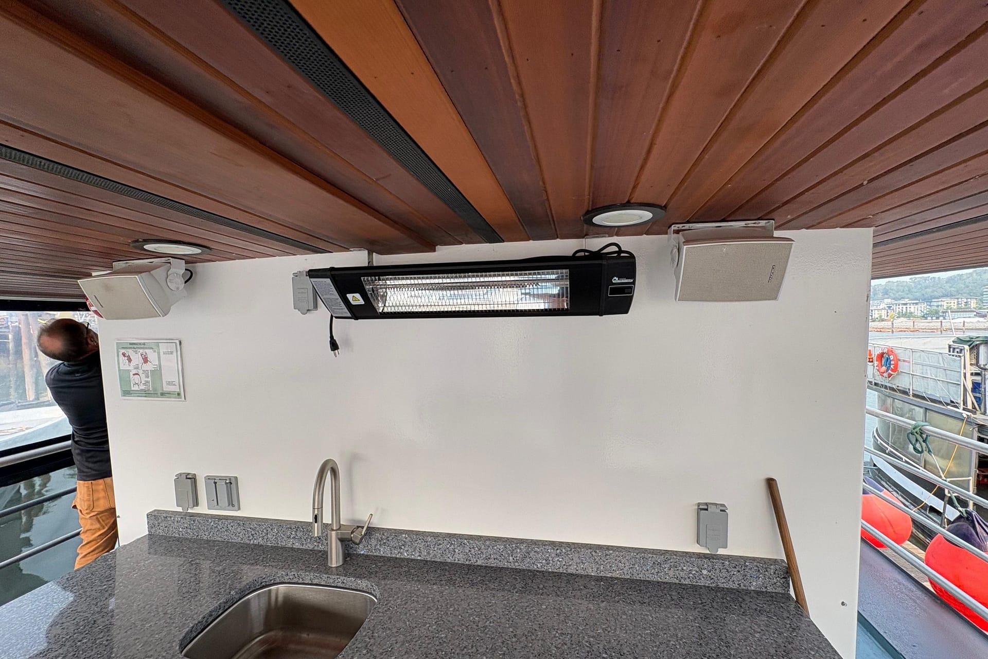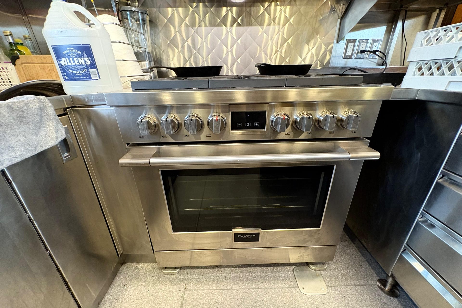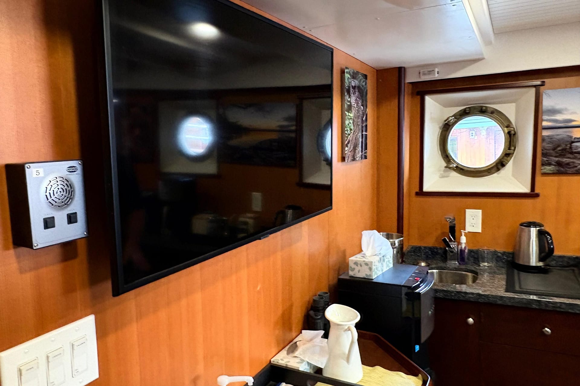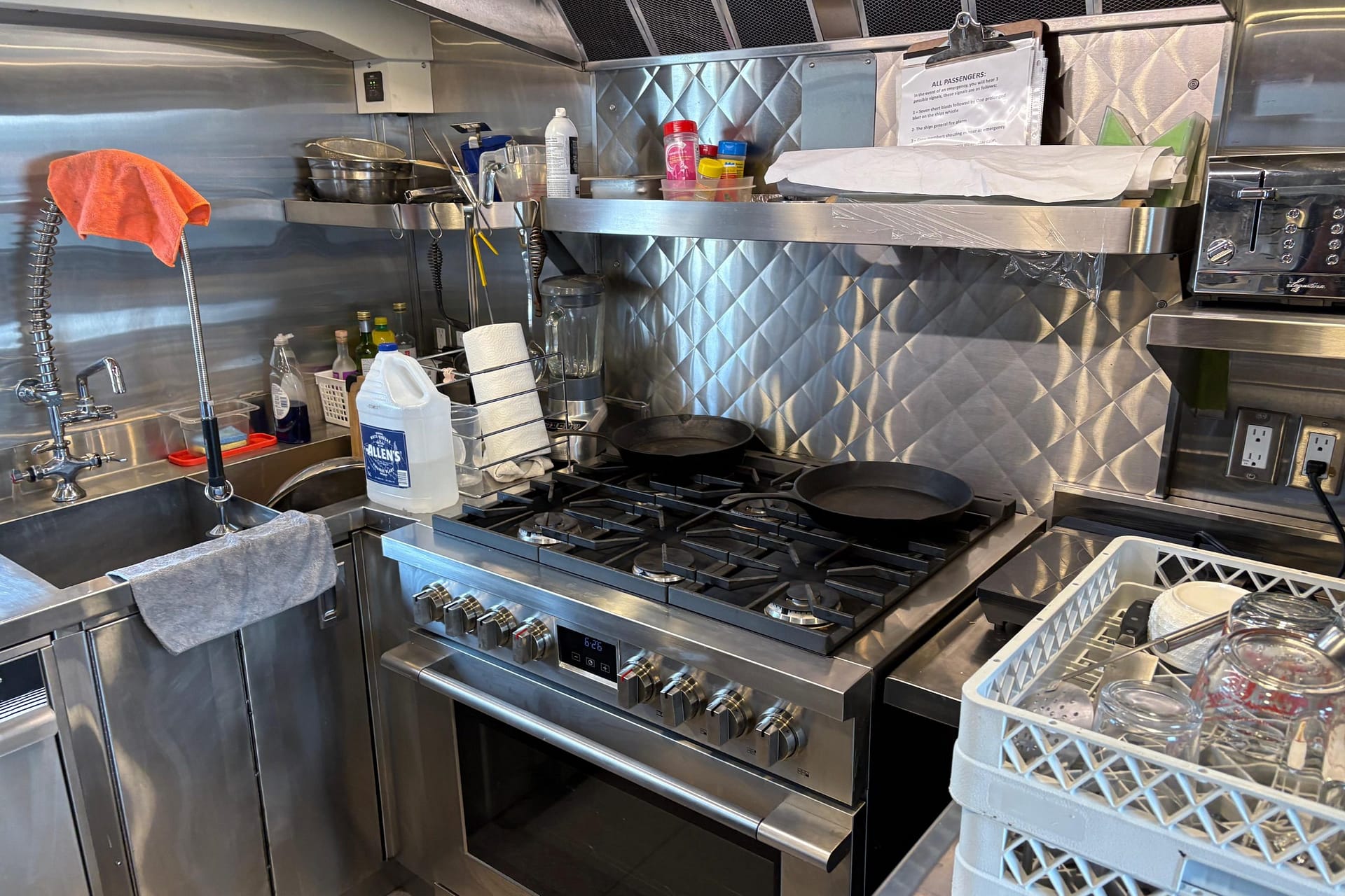 GALLEY: 12V Outlet, Electric Refrigerator (12V/110), Microwave, Courtesy Lights, Custom Cabinetry & Trim, Galley Area with Gray Countertop & Storage, Galley Sink & Faucet, Bow Windows (port & starboard), Light over Galley Area, Galley/Wine Storage, Stove (electric), Cutting Board