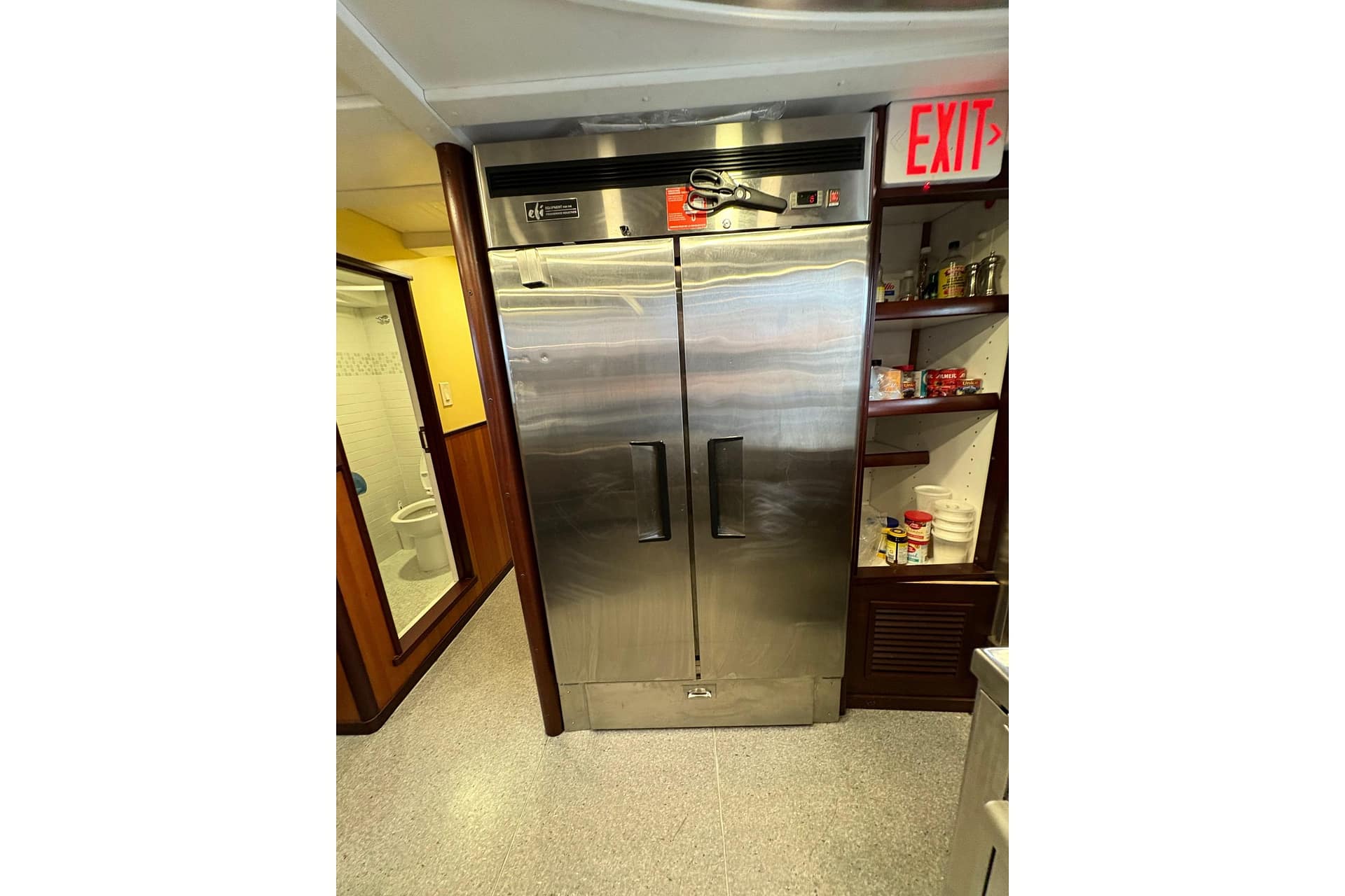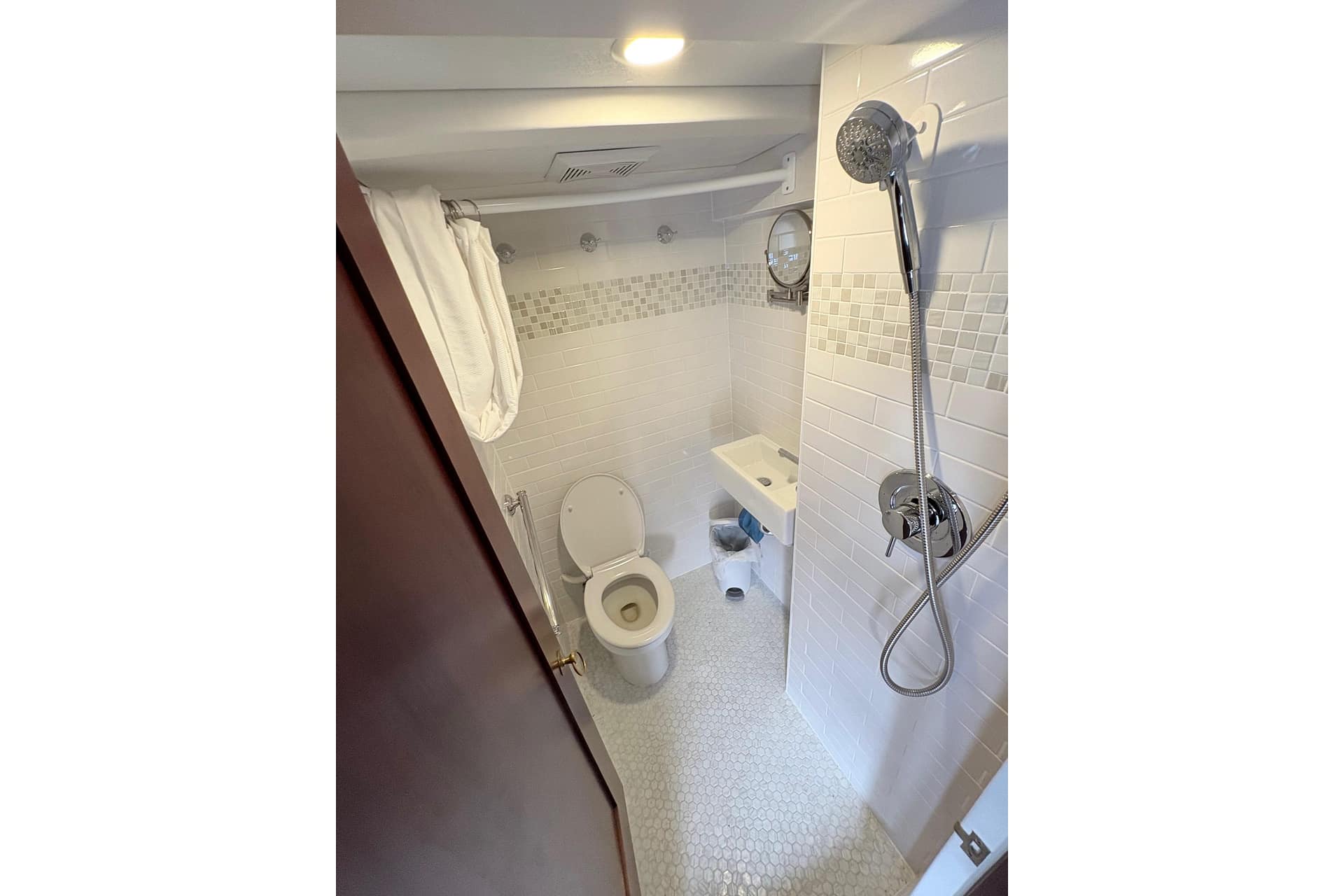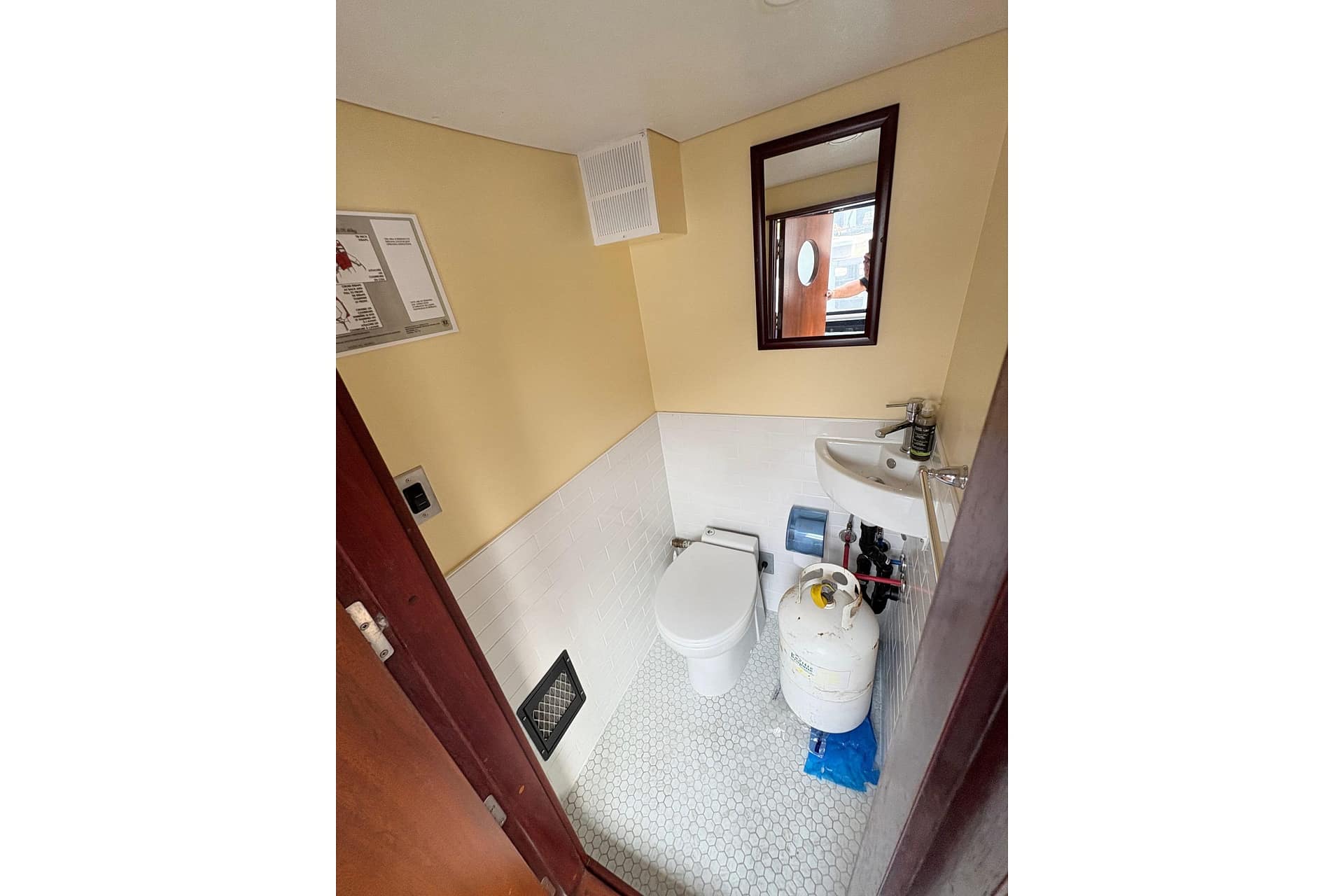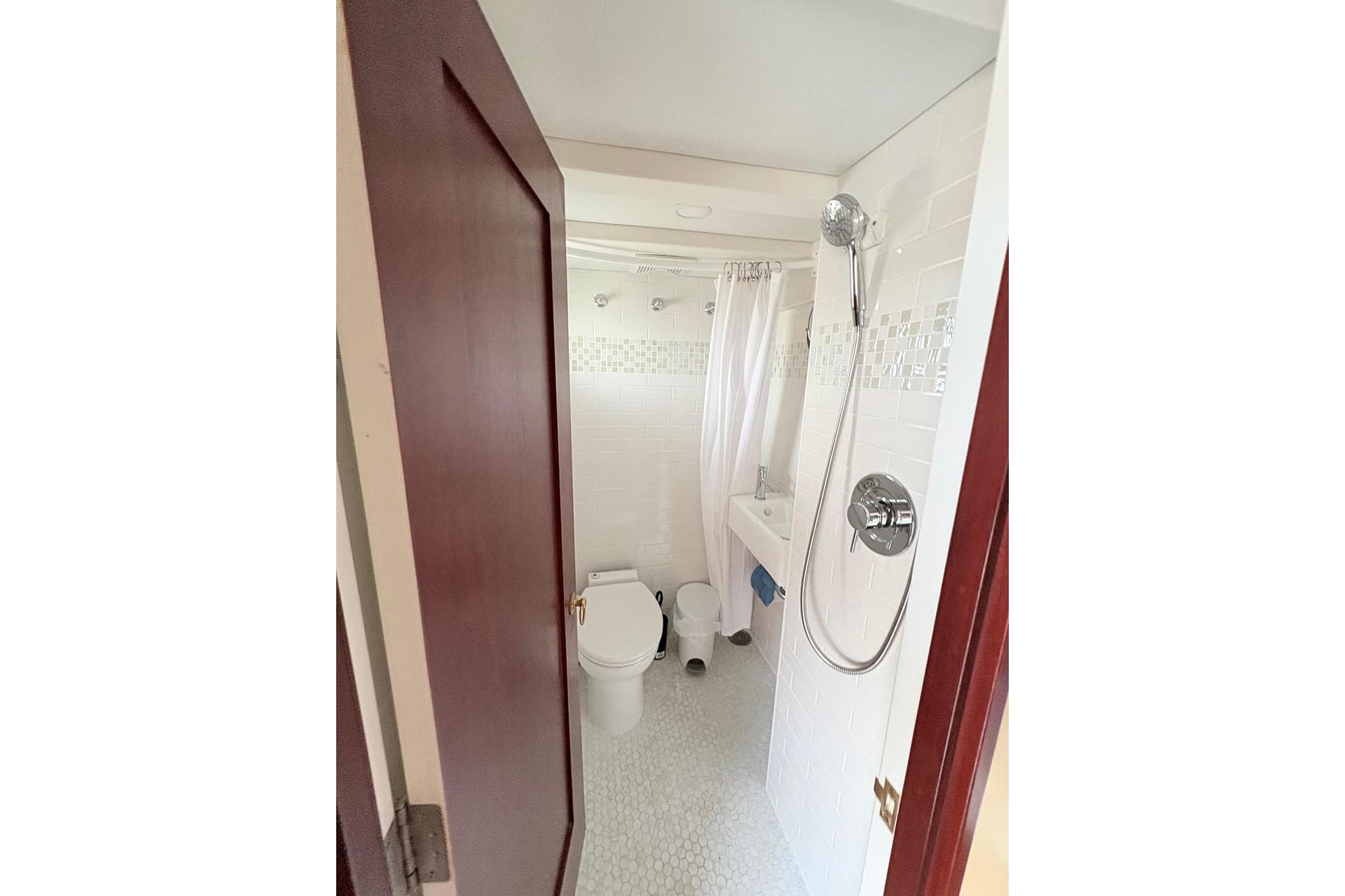 HEAD: 120 Ground Fault Protected Outlet, Enclosed Head with Shower Wand, Fiberglass Lined Head, Power Vent, Shower Curtain, Sink, Towel Rack, Electric China Head with Pump Out, Gray Vanity, Towel Rack/Grab Handle SS, Vanity Storage, Upper Mirror & Storage