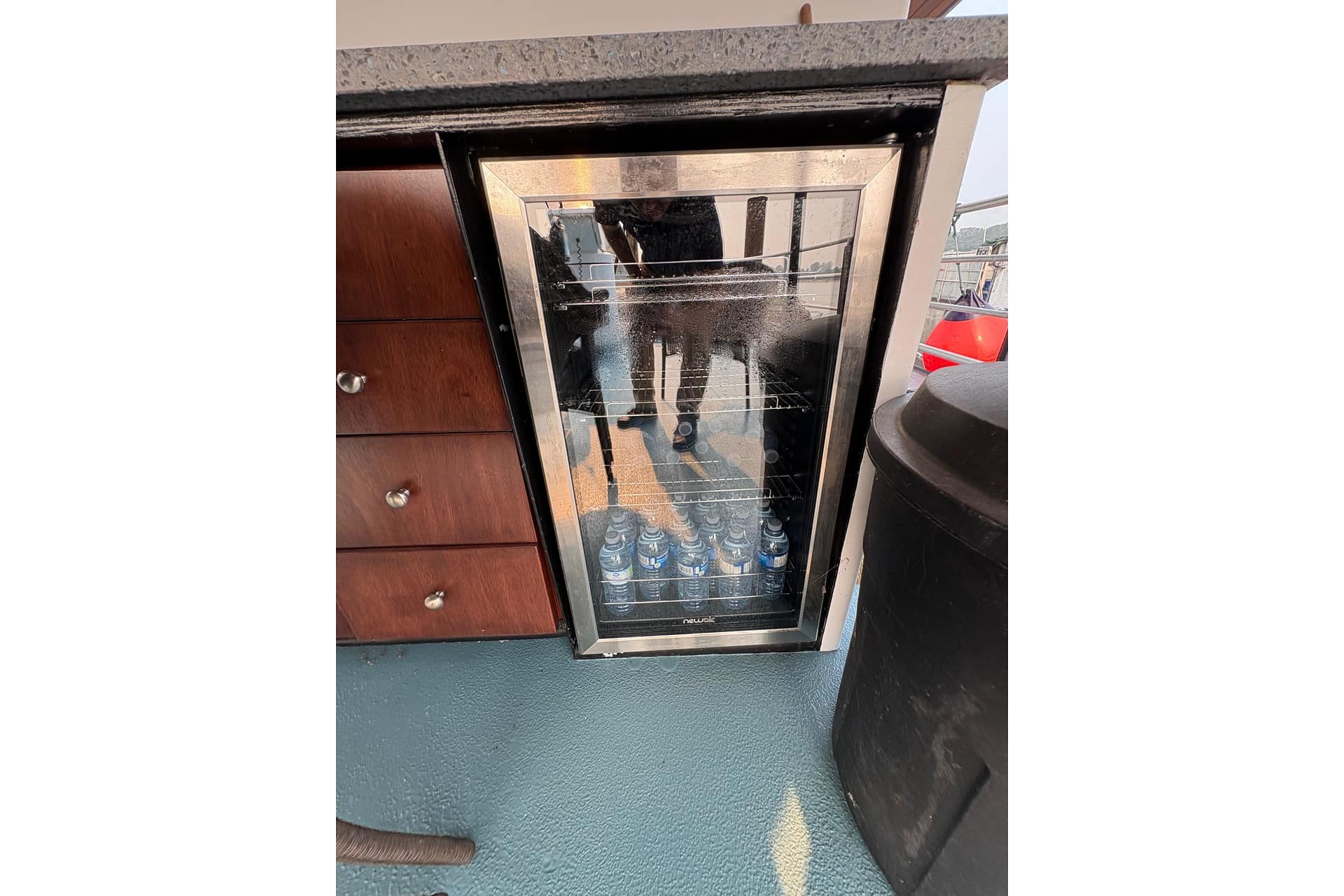 COCKPIT: Beverage Holders, Dual Helm Seat Adjustable with Flip-Up, Full Fiberglass Cockpit Liner, Helm Footrest, Motor Hatch Gas Shock, Portside Sunlounger Seating, Built-In Stern Jump Seat, Stern Storage, Custom Grip Handles SS, Storage Compartments, Tilt Steering, Wet Bar with Stone Countertop, Drink Holders, SS Cockpit Refrigerator, Snap-In Carpet, U-Shaped Interior with Table