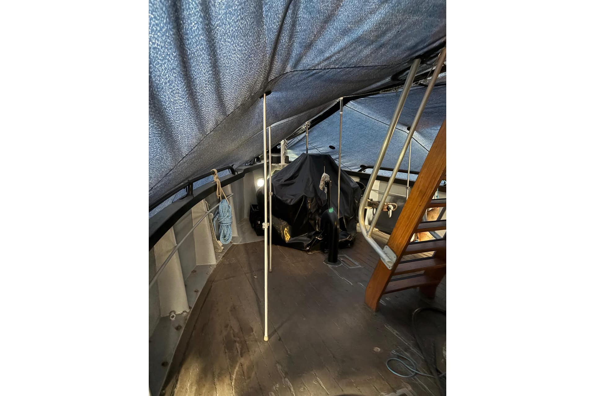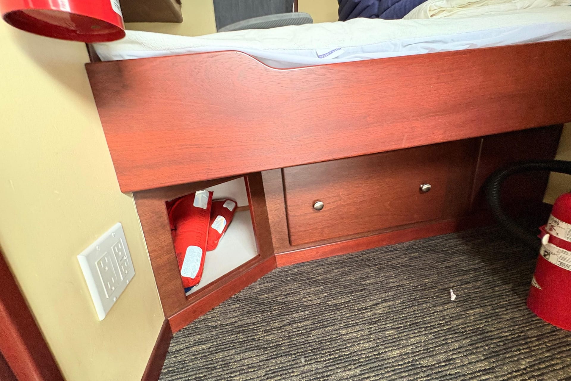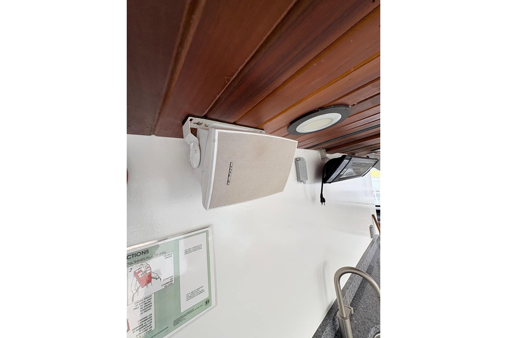 FORWARD CABIN: Cabin Lights, Convertible V-Berth with Table & Storage, V-Berth Filler Cushion, Under V-Berth Storage, Teak Vinyl Floor, Hanging Closet, CO Detector, Reading Lights, Storage Compartments, Berth Privacy Curtain